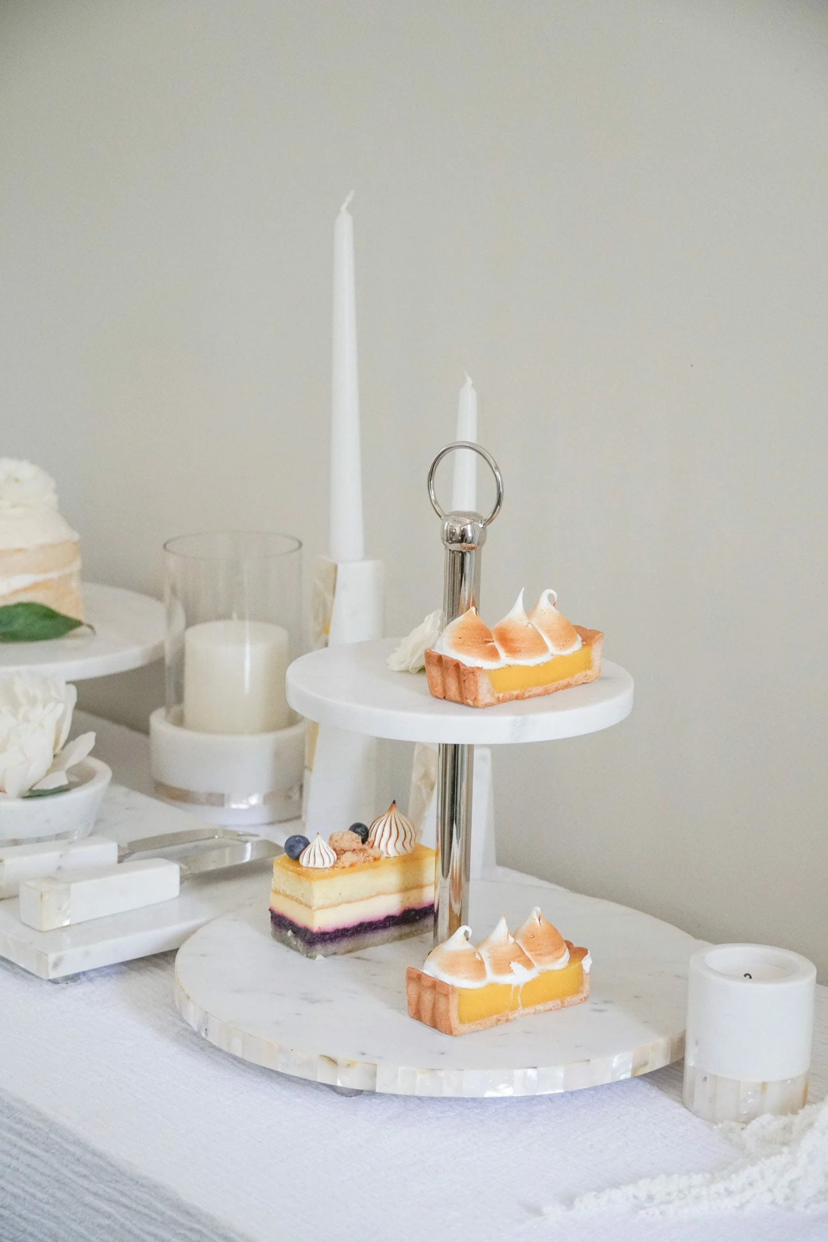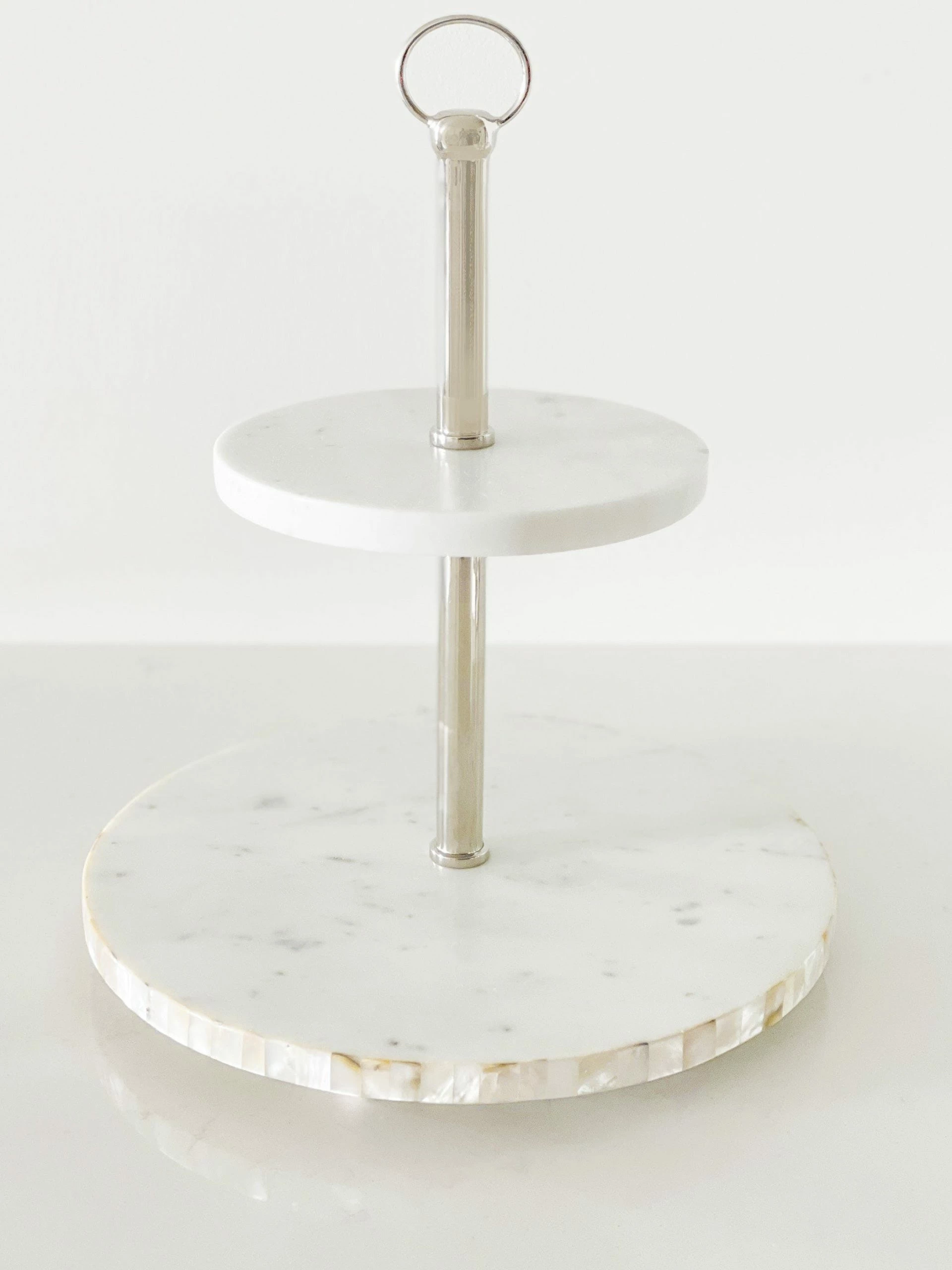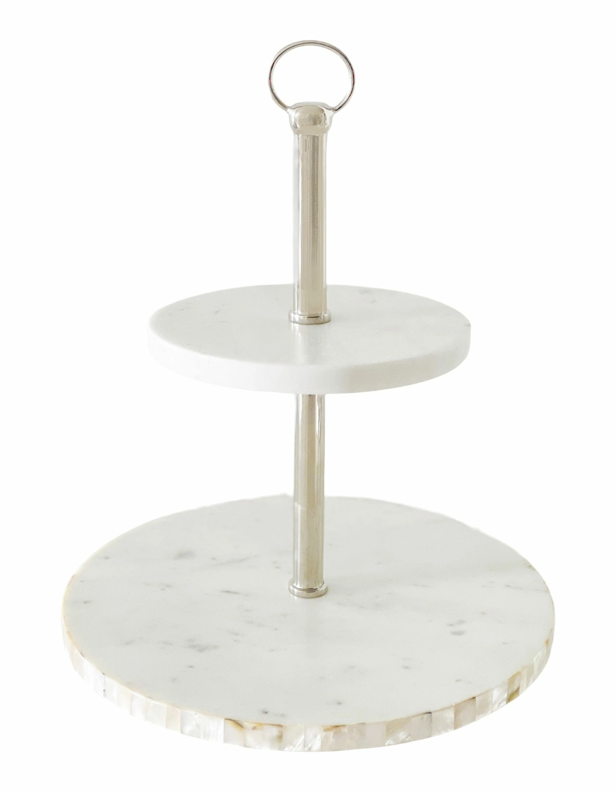 The Mother of Pearl White Marble 2-Tier Cake Stand is the essential display piece for a wedding or special event. Flat packs for easy shipping.
