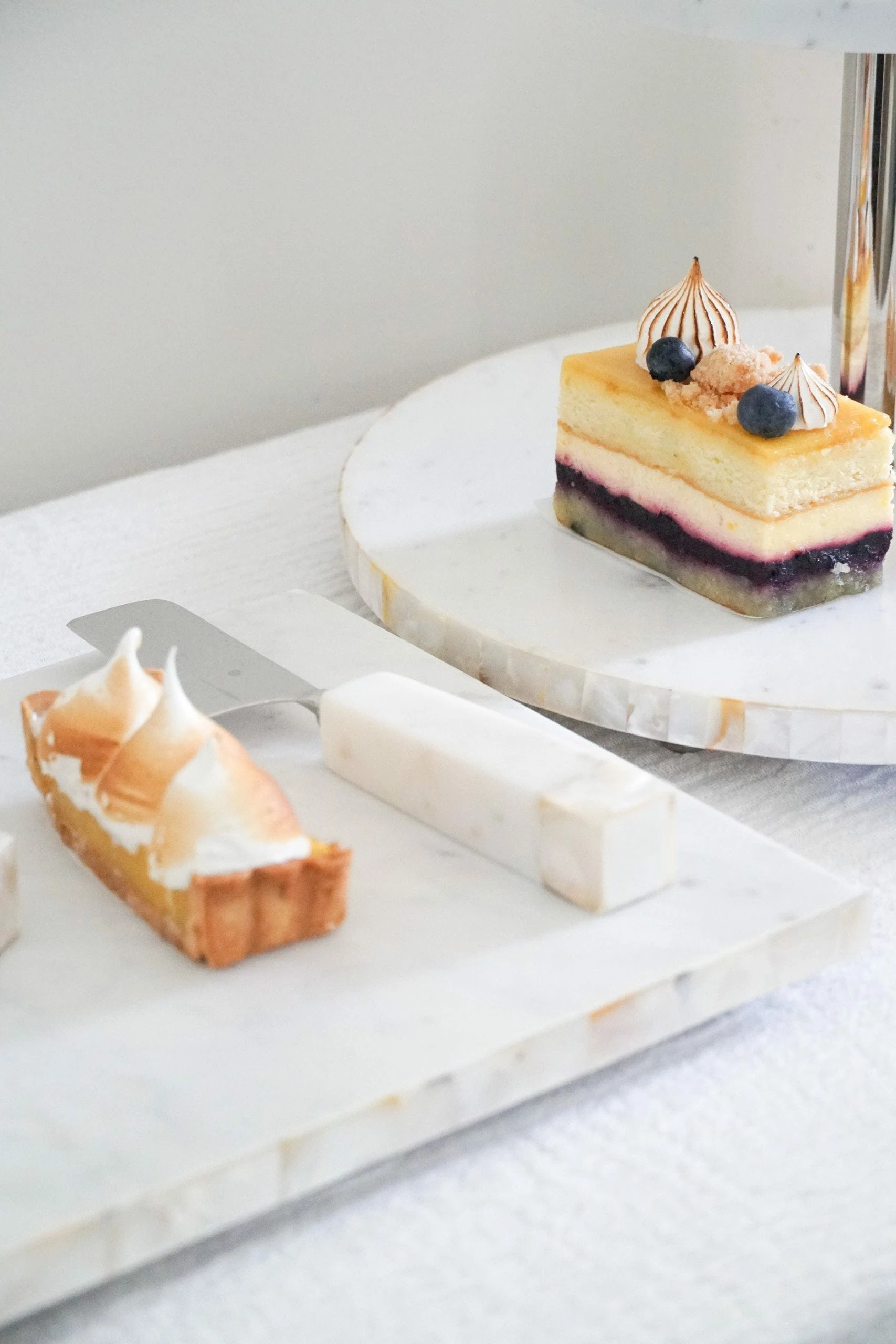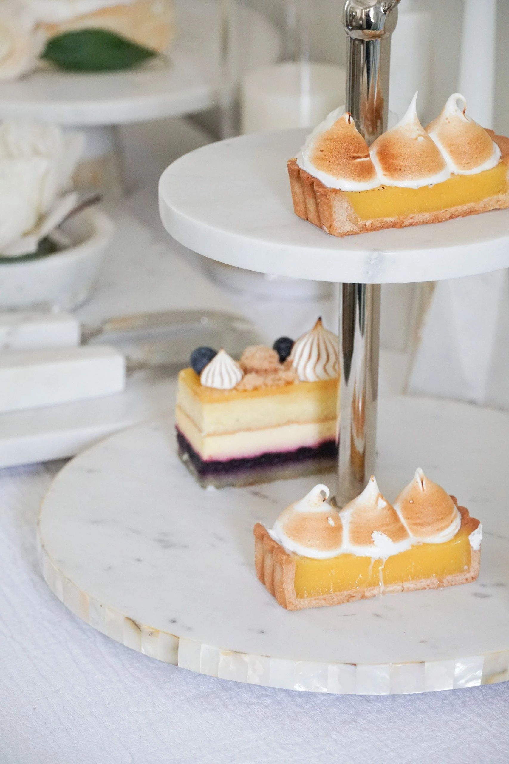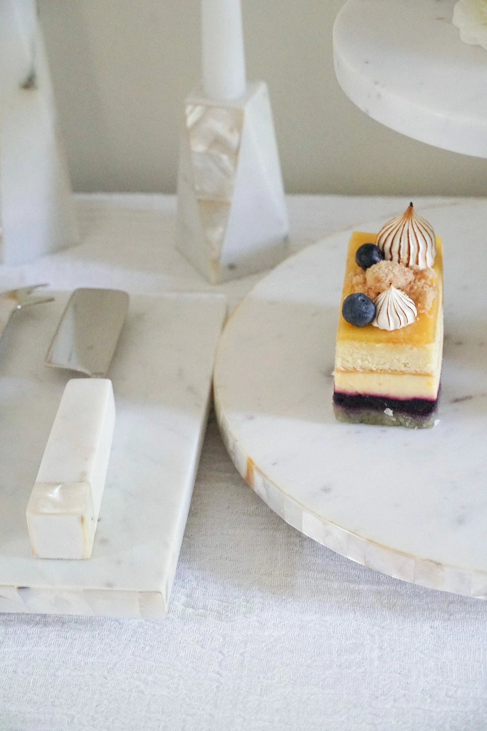 The Mother of Pearl White Marble 2-Tier Cake Stand is the essential display piece for a wedding or special event. Flat packs for easy shipping.