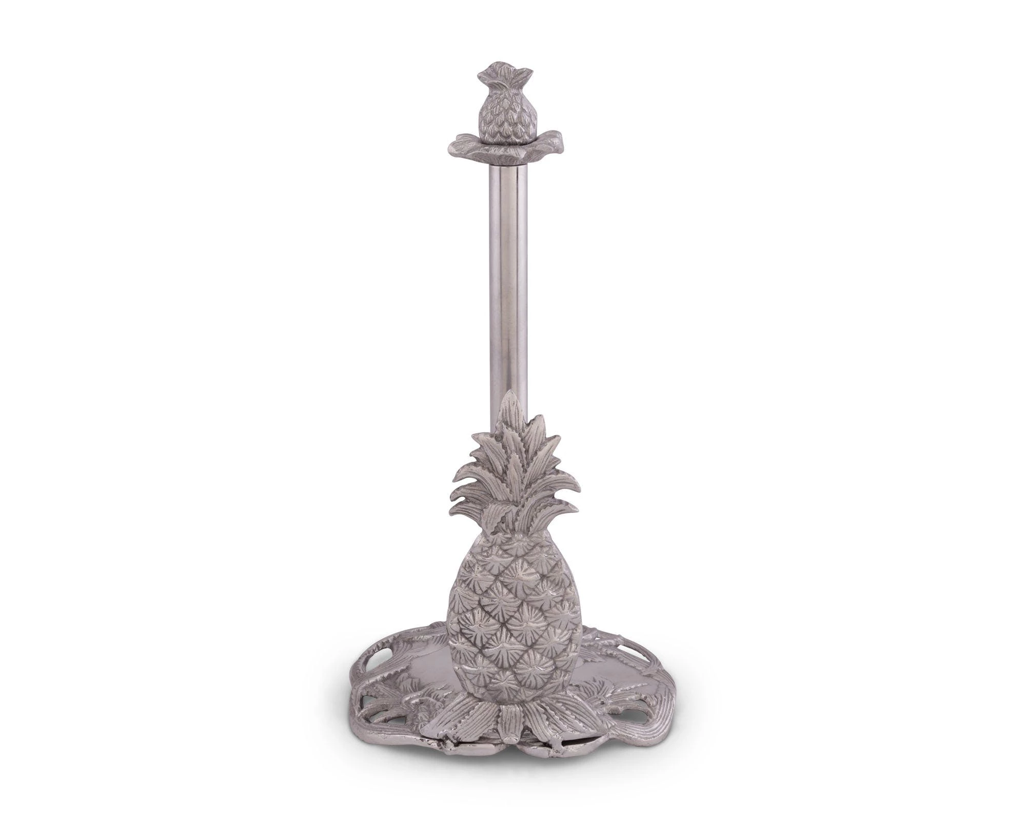Create a tropical atmosphere in your kitchen with this Pineapple Paper Towel Holder from Arthur Court. Detailed leaves erupt from the crown of a large pineapple at the base of this piece, while suckers fan out underneath the fruit.A smaller pineapple sits atop the handmade, aluminum design, with both pieces showing incredible definition in their spiky, square-patterned shells.