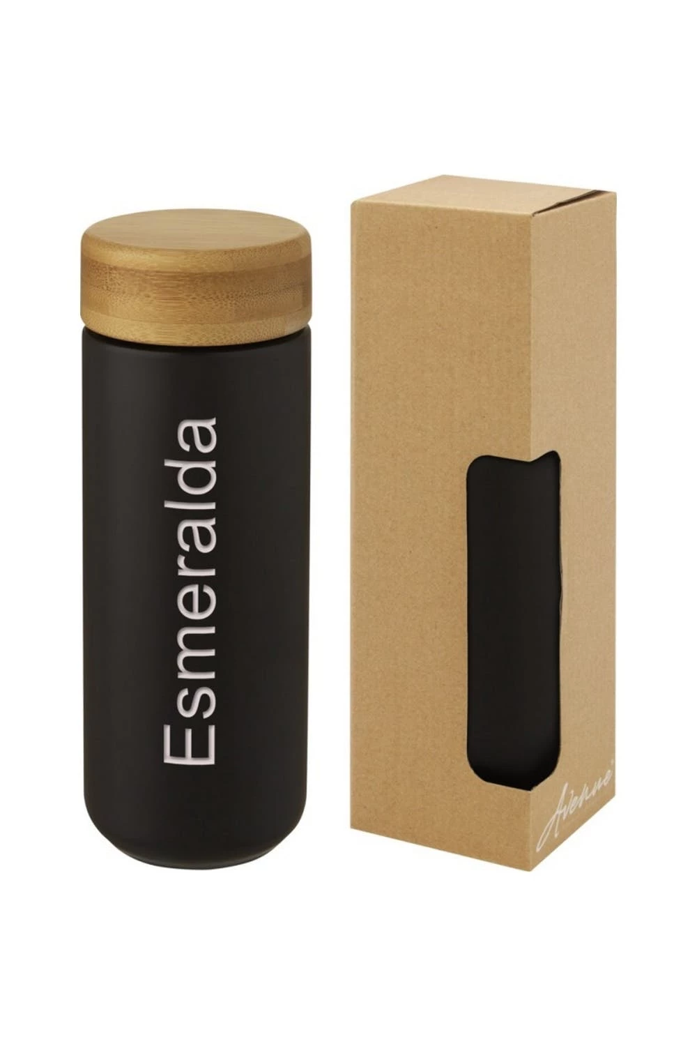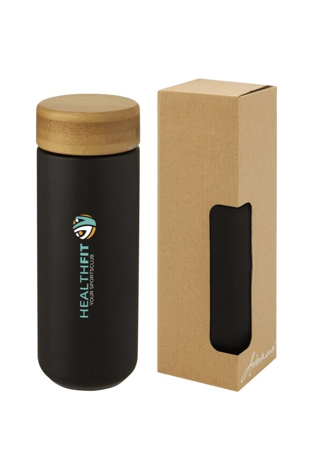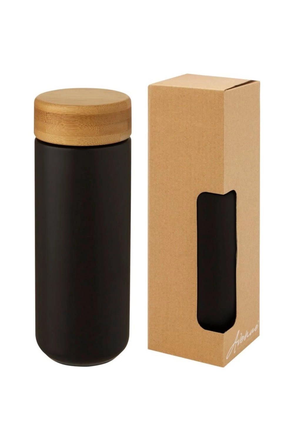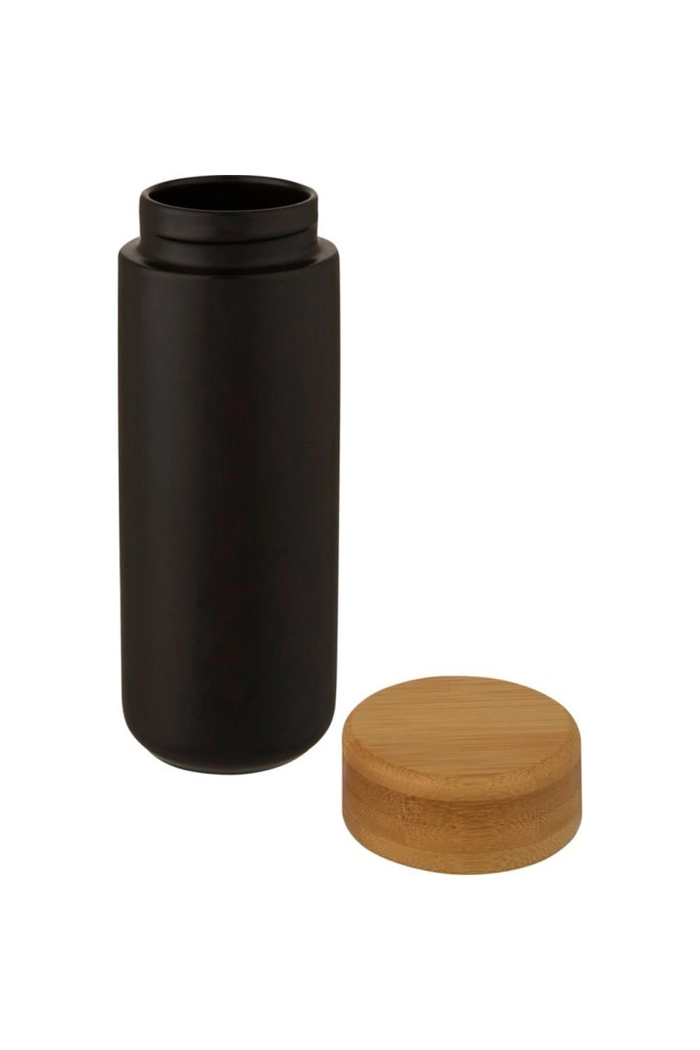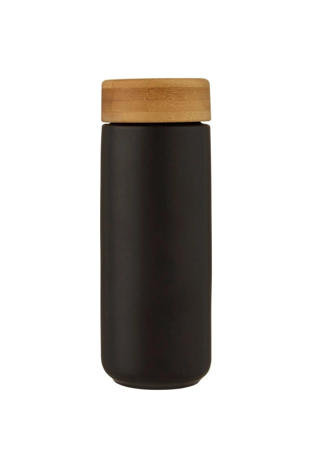 Ceramic tumbler with a stylish bamboo lid. The double-wall ceramic construction helps to prevent condensation on the outside of the tumbler.