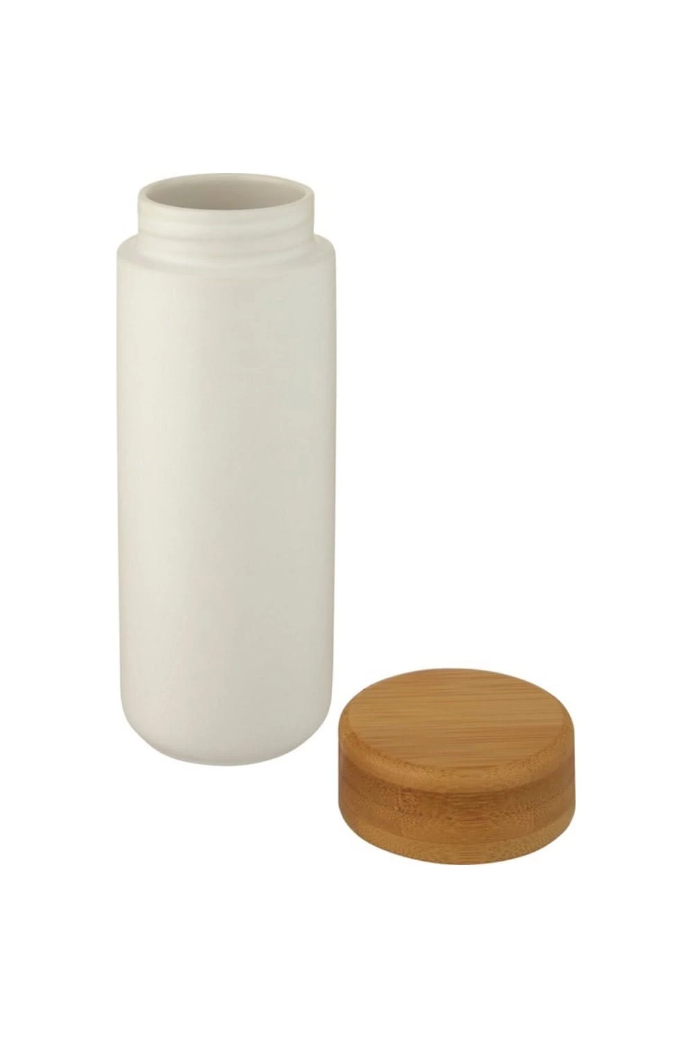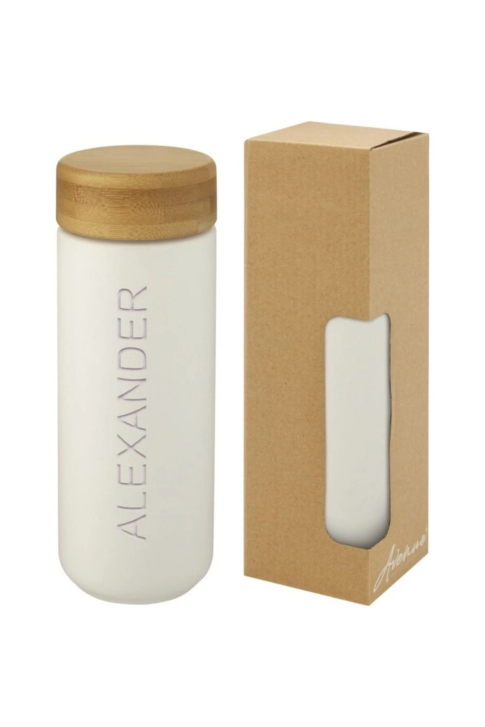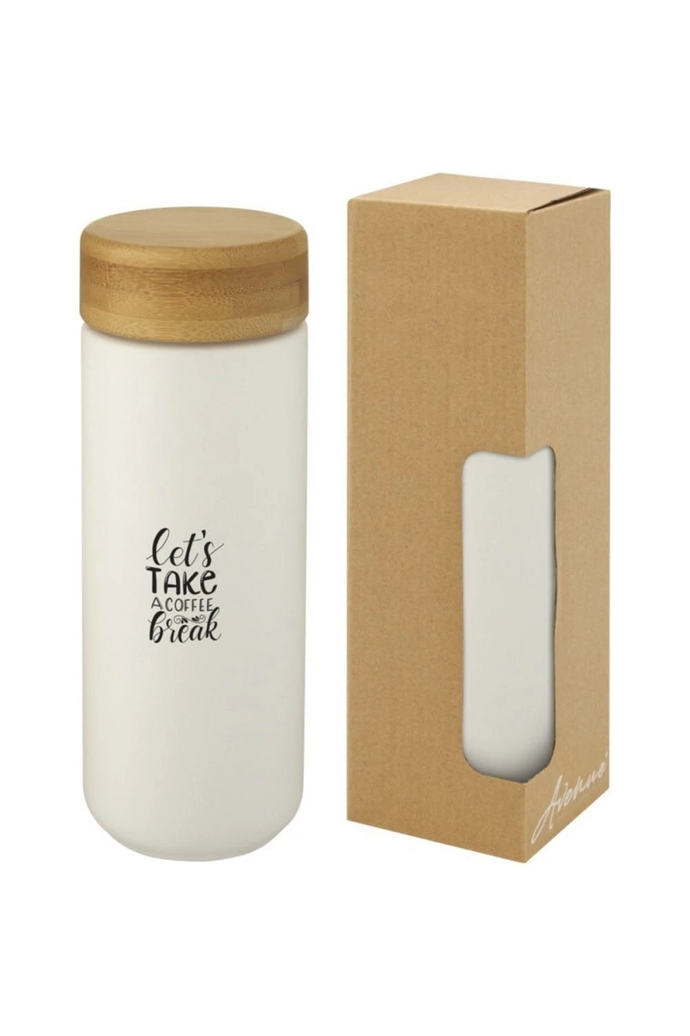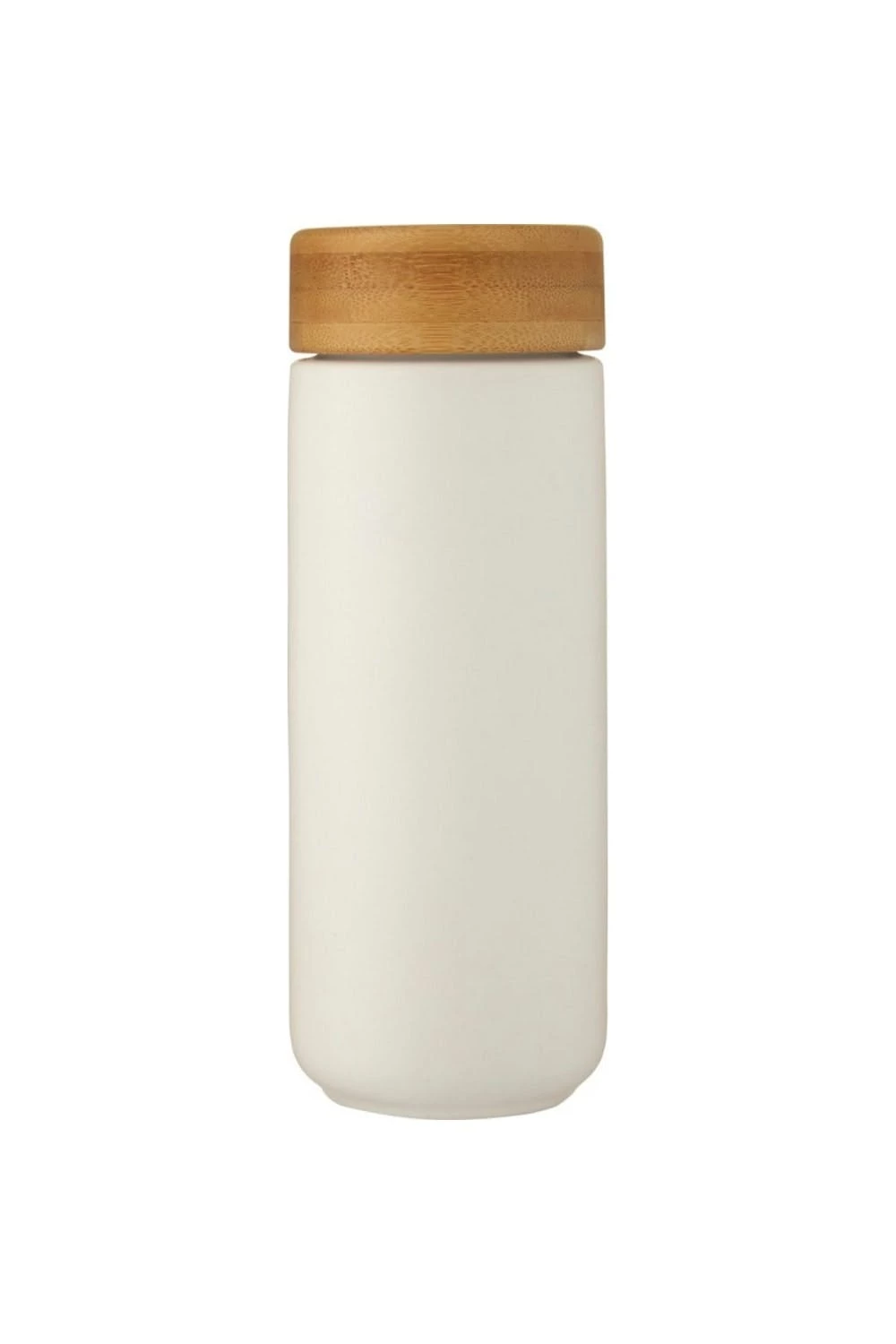 Ceramic tumbler with a stylish bamboo lid. The double-wall ceramic construction helps to prevent condensation on the outside of the tumbler.