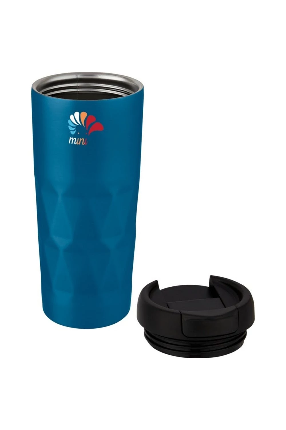 Double-walled copper vacuum insulated tumbler with screw-on leakproof lid featuring an intricate geometric design.