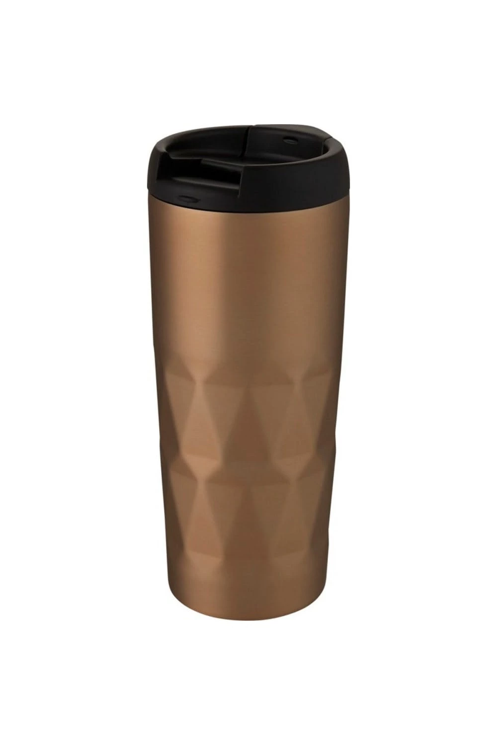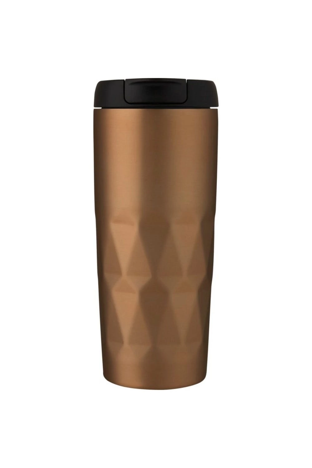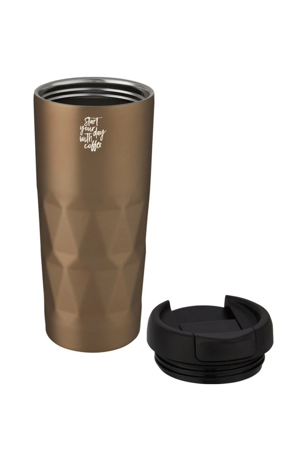 Double-walled copper vacuum insulated tumbler with screw-on leakproof lid featuring an intricate geometric design.