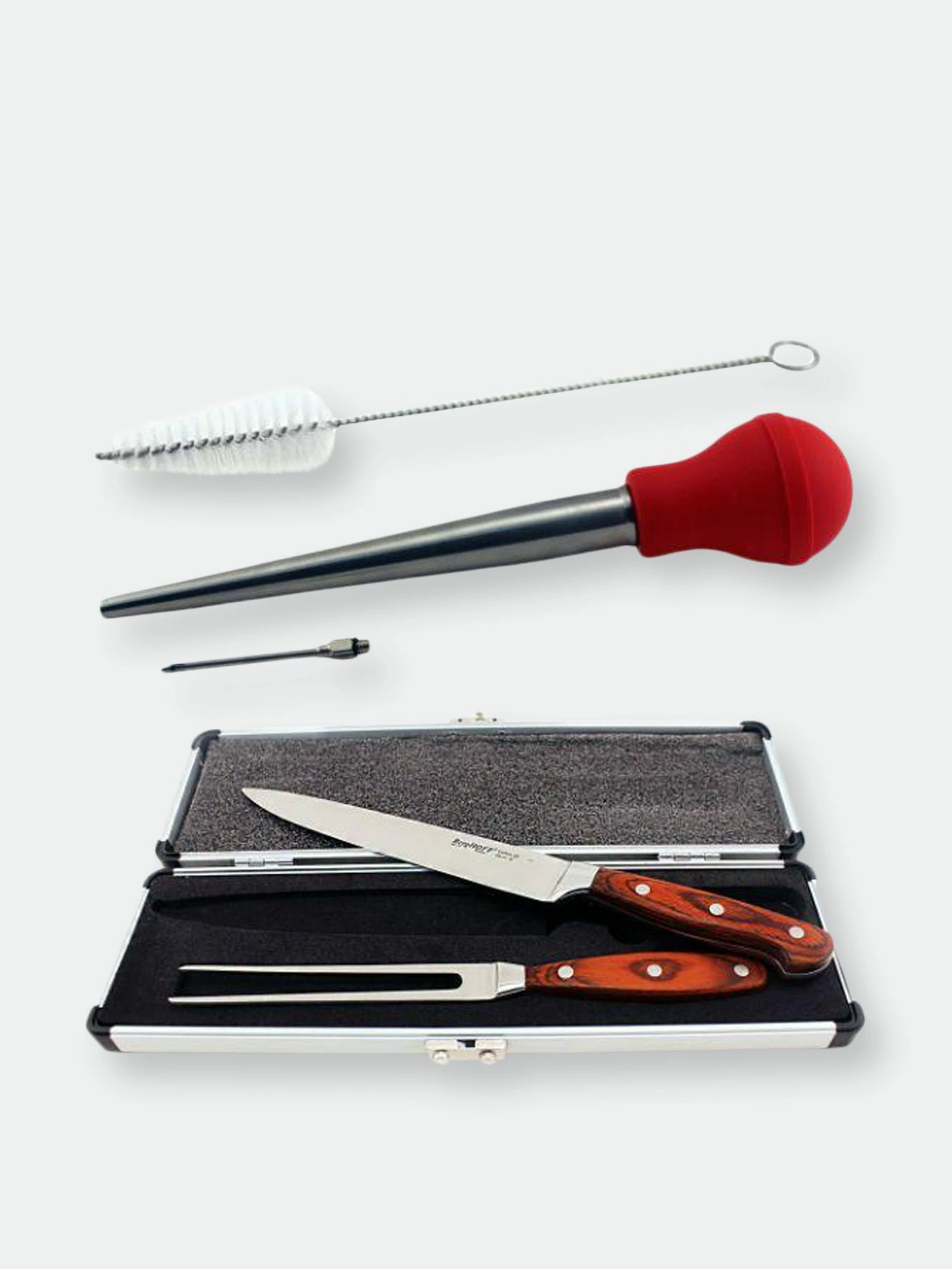 Pakka’s 3pc Carving set has triple-riveted wood handle ensures superior balance and comfort. The carving-style blade makes cutting meat and poultry effortless. Forged of high-carbon stainless steel. This quality baster by BergHOFF was crafted from surgical-grade stainless steel for long-lasting use. The all-in-one set comes with a cleaning brush for those hard to reach spots and a bulb that removes easily, making clean up a breeze. Use the stainless needle for tenderizing and adding flavor to meats and poultry or the bulb applicator for maintaining moisture in your meals. Ideal for roasting, barbequing, or smoking cooking methods.