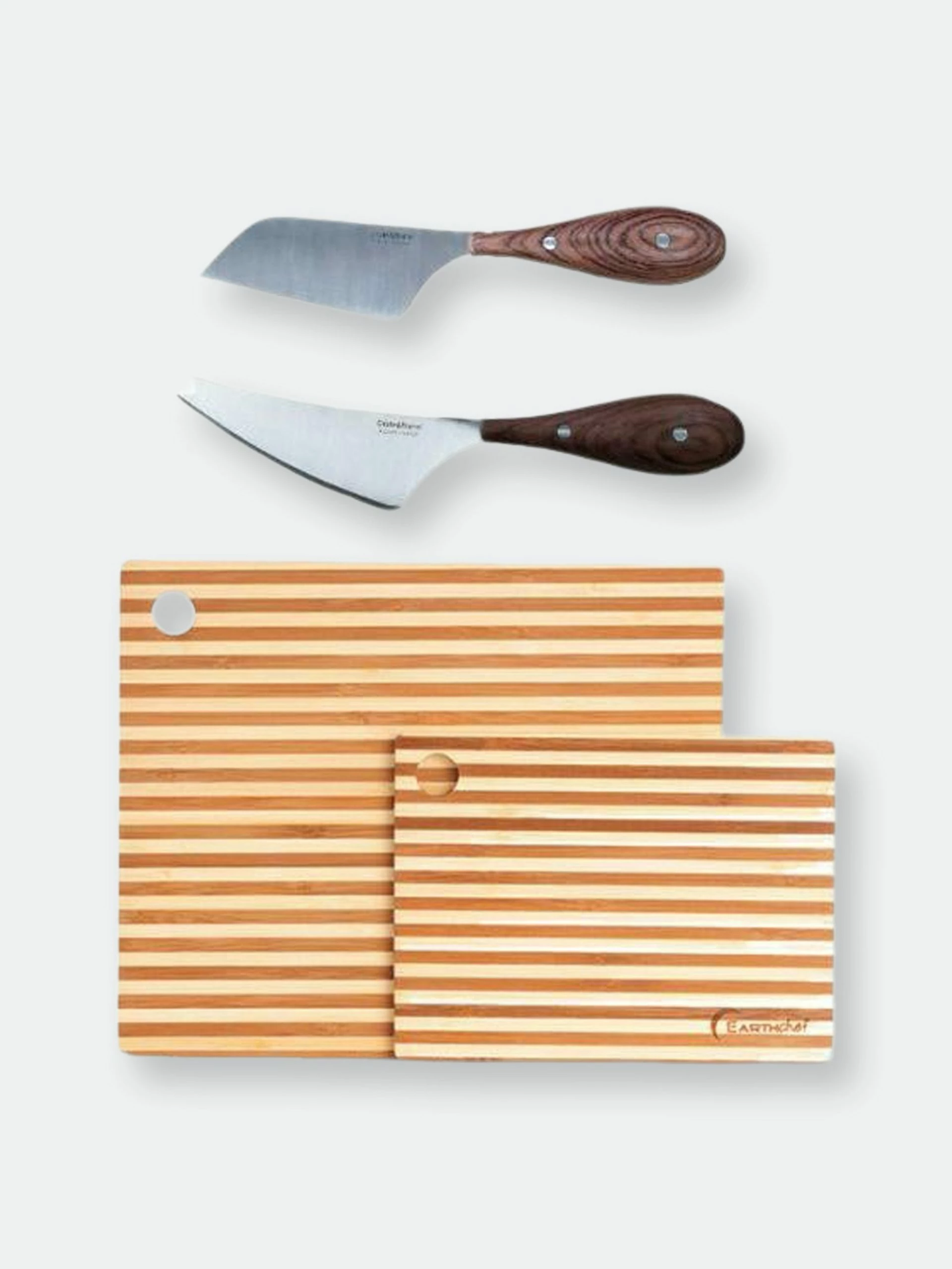 Enjoy the beautiful design of these cheese tools designed by Aaron Probyn. The stainless steel is durable and sure to last! The stainless steel is a classic look to match any décor while the wood handle gives it a fresh look. The 11×9″ and 8×6″ bamboo cutting boards are paired perfectly with this tool set. Bamboo is the top candidate to replace wood due to it’s rapid growth, Earth Friendly Product, great for slicing and serving cheeses, fruits and vegetables. This bamboo item is treated with food grade mineral oil. Product Contains: 11×9″ and 8×6″ Cutting Board, Soft Cheese Knife and Hard Cheese Knife.