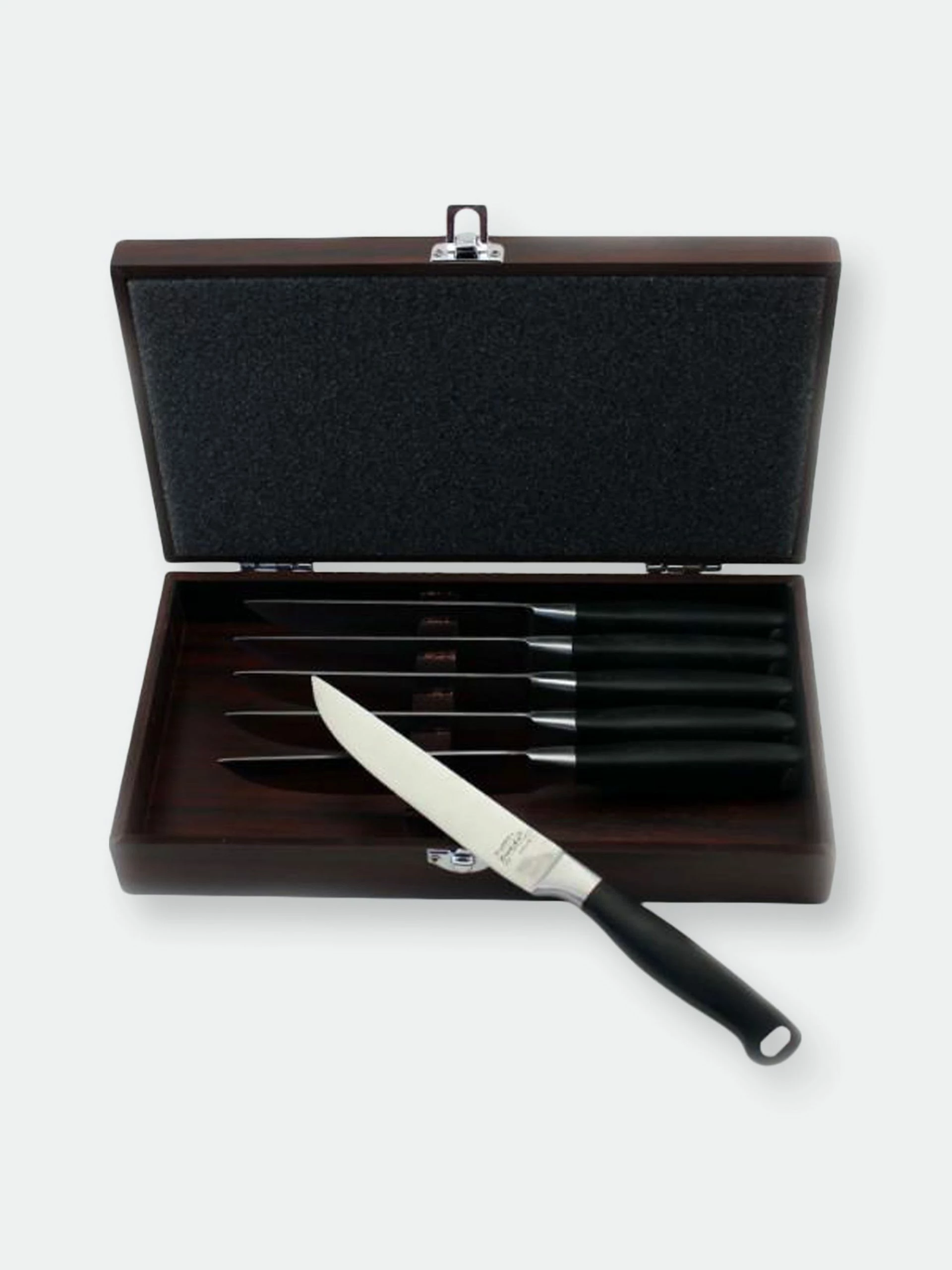 Set Includes: 6 (4.75″) steak knives, with a wooden case. Made from high quality Chrome-Molybdenum-Vanadium steel, the forged bolster is featured for added weight, perfect balance, and increased safety. The handles are state of the art nick-resistant, ergonomically molded poly-oxy-methylene, a material often used as a direct replacement for metals.