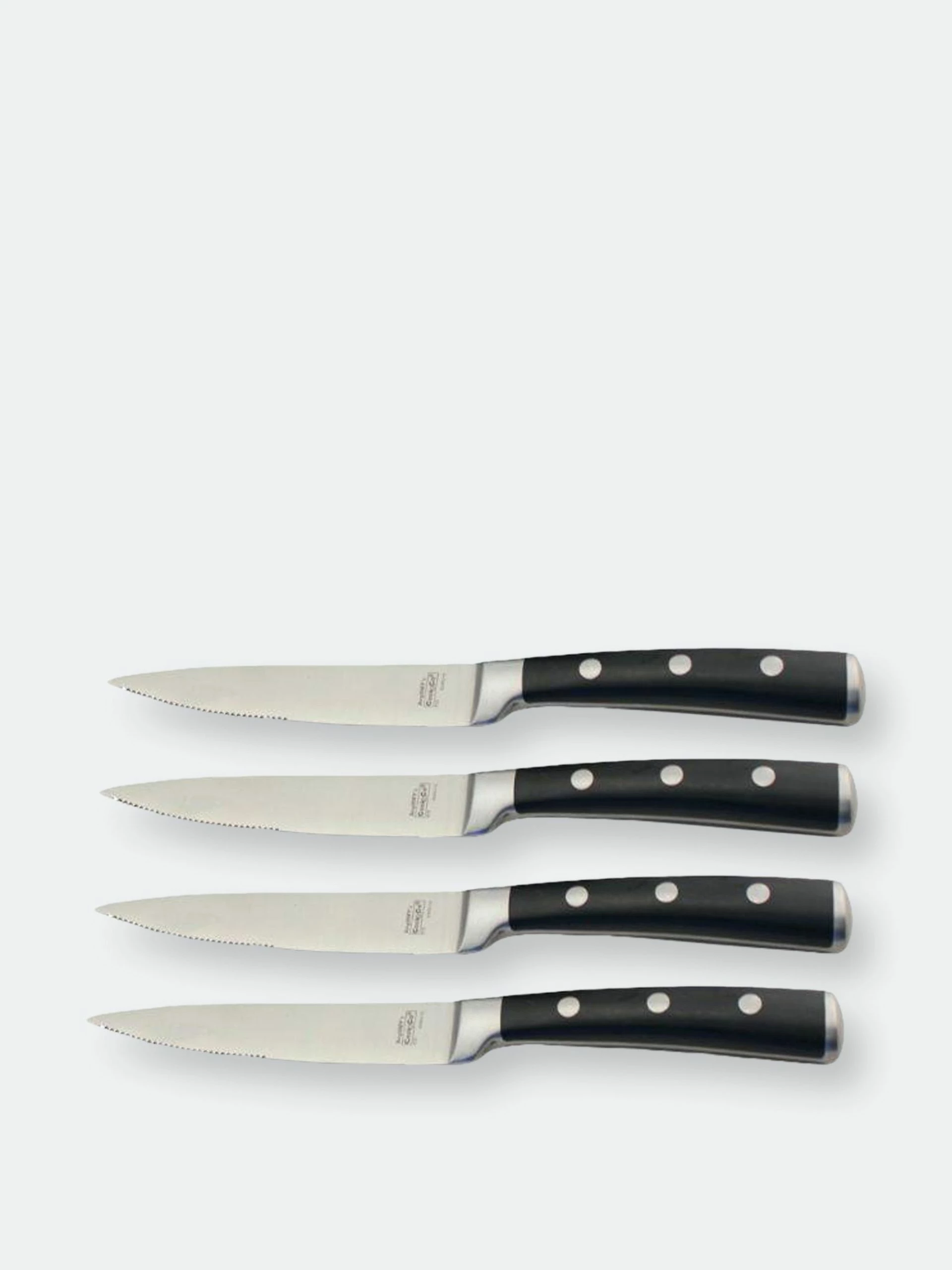 Set Includes: 4pc steak knives. Everyone needs a great knife set! Durable high-quality stainless steel is absolutely indestructible and corrosion resistant. The highly polished surface is hard wearing, thick, easy to clean and hygienic. Advanced manufacturing methods plus traditional craftsmanship guarantee flawless product quality. Made of stainless steel blades and ABS handles.