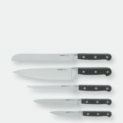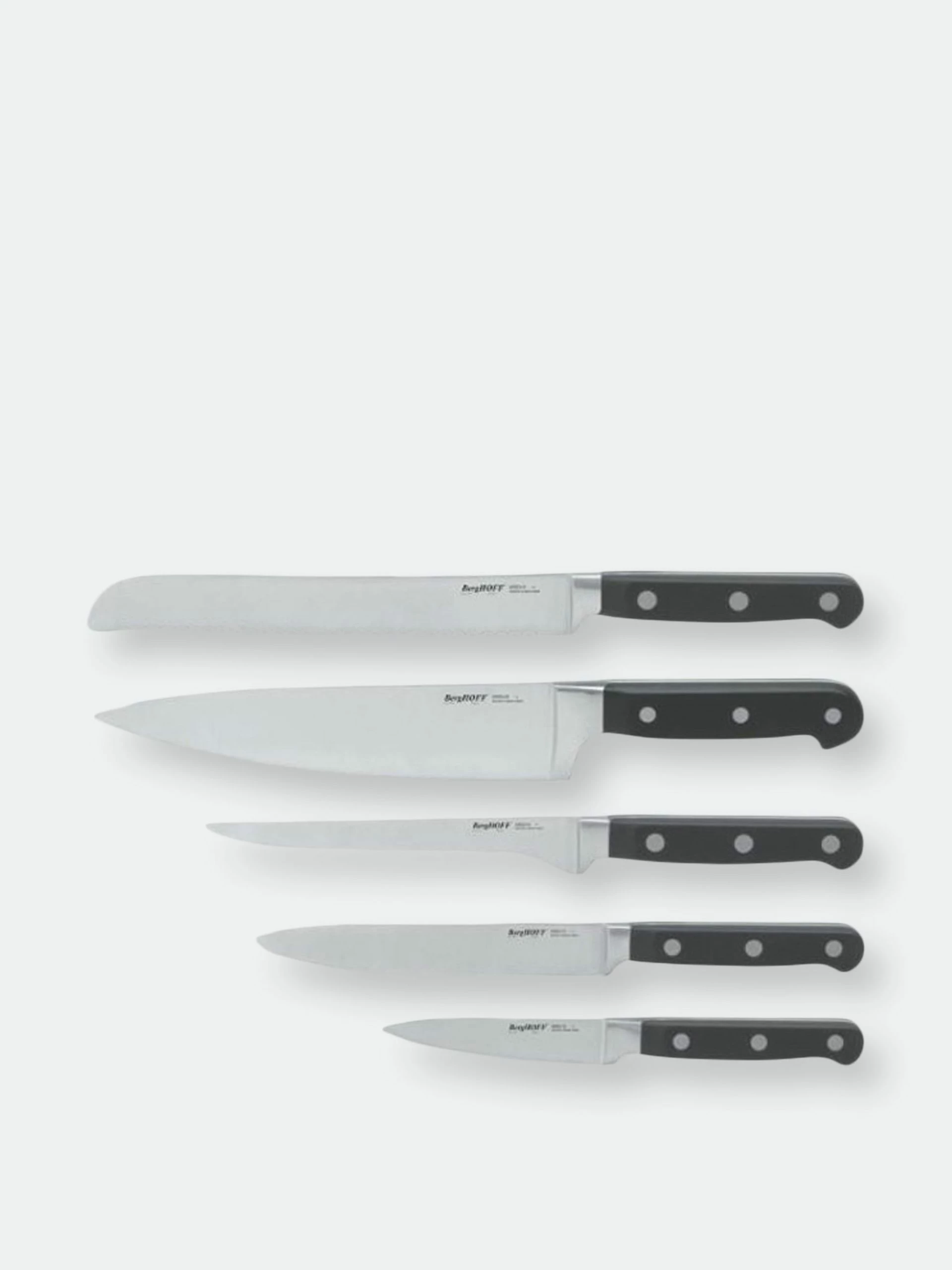Chef’s of all experience know it’s essential to have quality professional knives. This professional set from BergHOFF‘ Contempo cutlery comes with (8″ Bread, 8″ Chef, 6″ Boning, 5″ Utility, 3.5″ Paring) and is crafted from the highest quality stainless to resist stains and rust and is coupled with curved, triple riveted ergonomic handles for exceptional balance and precision cutting.