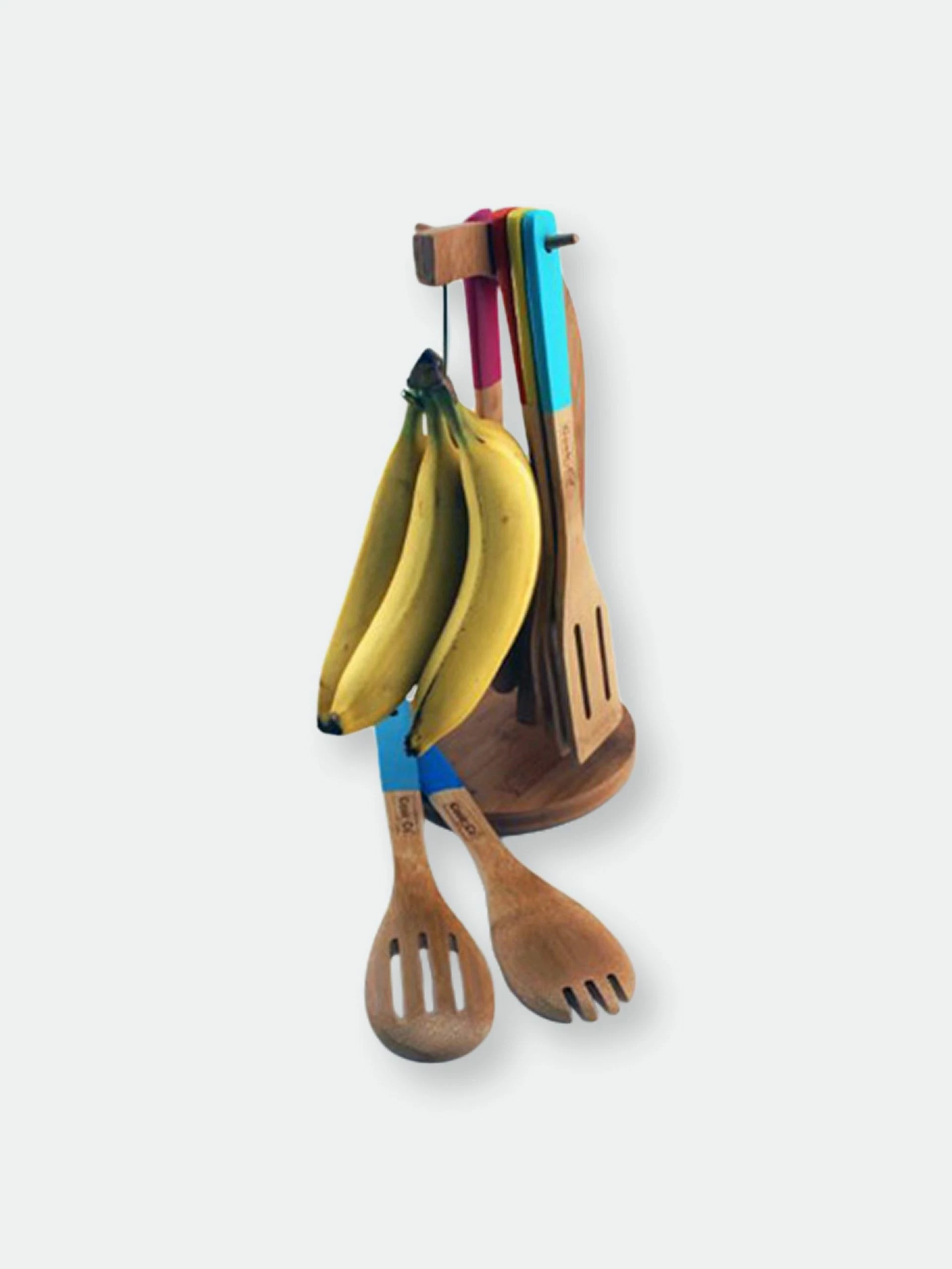 This bamboo stand is multi functional. You can hang your produce on display front and center that encourages bananas to ripen evenly. In addition to its prominent banana hook, the hanger accommodates two spatulas and four oversized spoons, all made of eco-friendly bamboo and designed to hang easily on the stand’s two pegs.