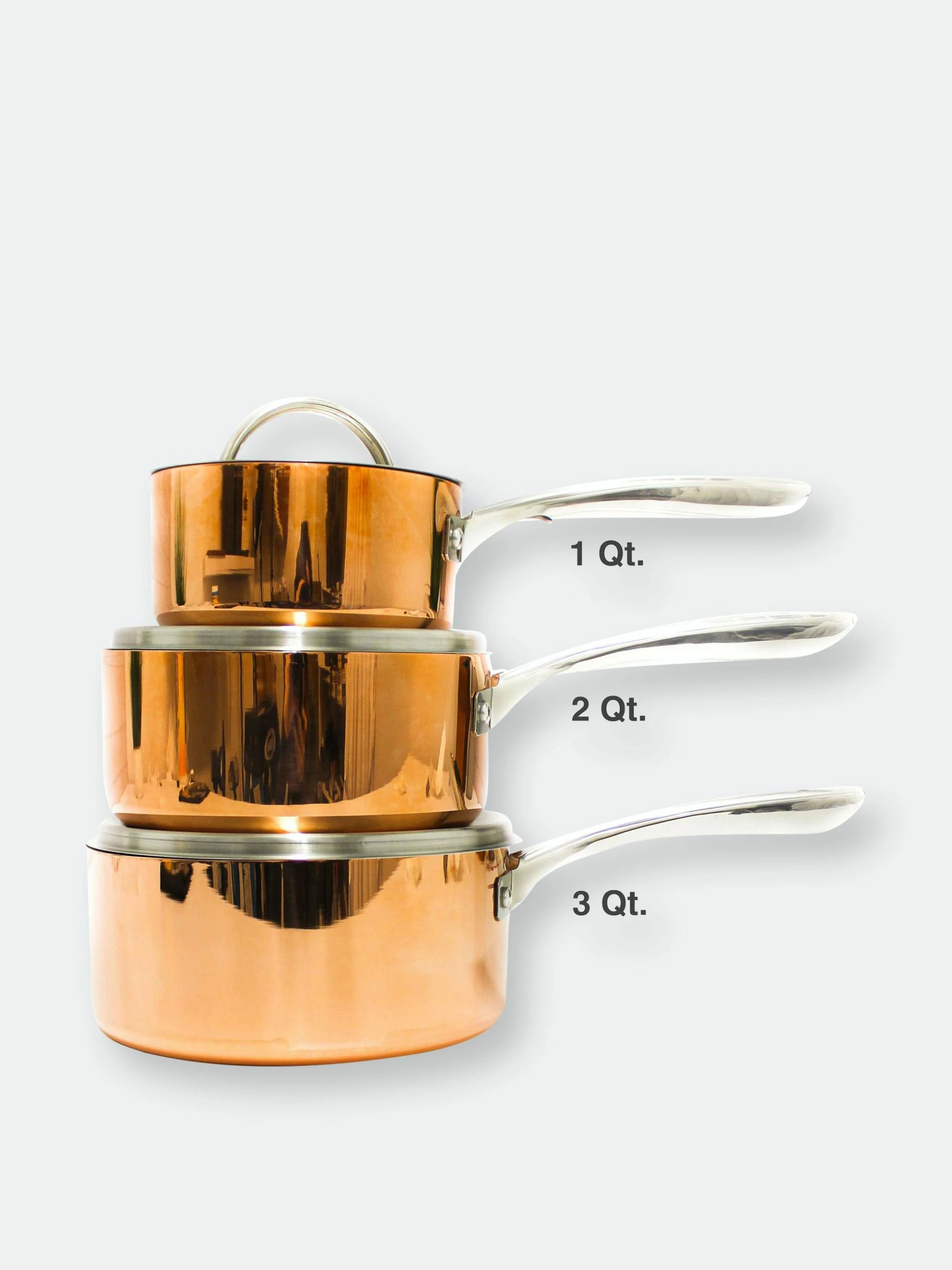 - Materials: Tri-Ply Copper + Aluminum Core + 18/10 Stainless Steel cooking surface