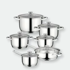 With their high quality stainless steel bodies, the three layer base ensures even heat transfer throughout the entire surface for energy efficient cooking. The pots and pans in this cookware set are a perfect fit for any kind of stove top, including induction. Stay cool handles provide a safe and comfortable grip for easy lifting. The mirror finish gives this cookware a stylish look. The pots all come with a clear glass lid which allows you to monitor the contents without having to lift the cover and waste valuable energy. Once you’ve served a delicious meal, you can pop all the items into the dishwasher for an easy clean up. Set comes with 1x 6.25″ covered casserole, 1x 6.25″ covered saucepan, 1x 7″ covered casserole, 1x 8″ covered casserole, 1x 10″ covered stockpot, 1x 10″ covered deep skillet.