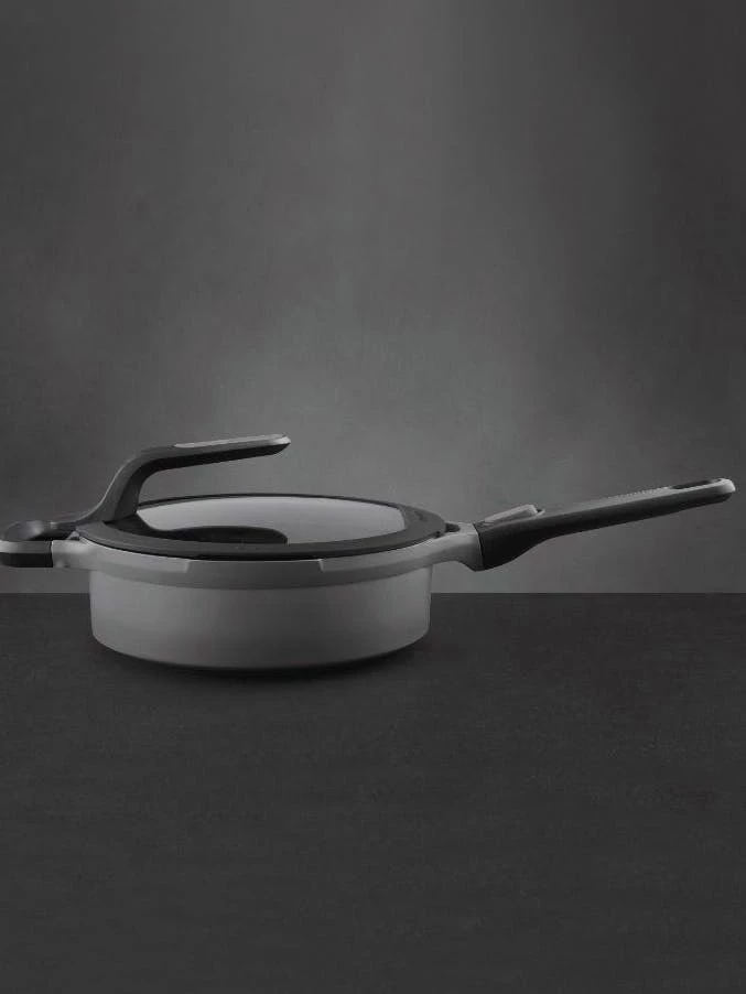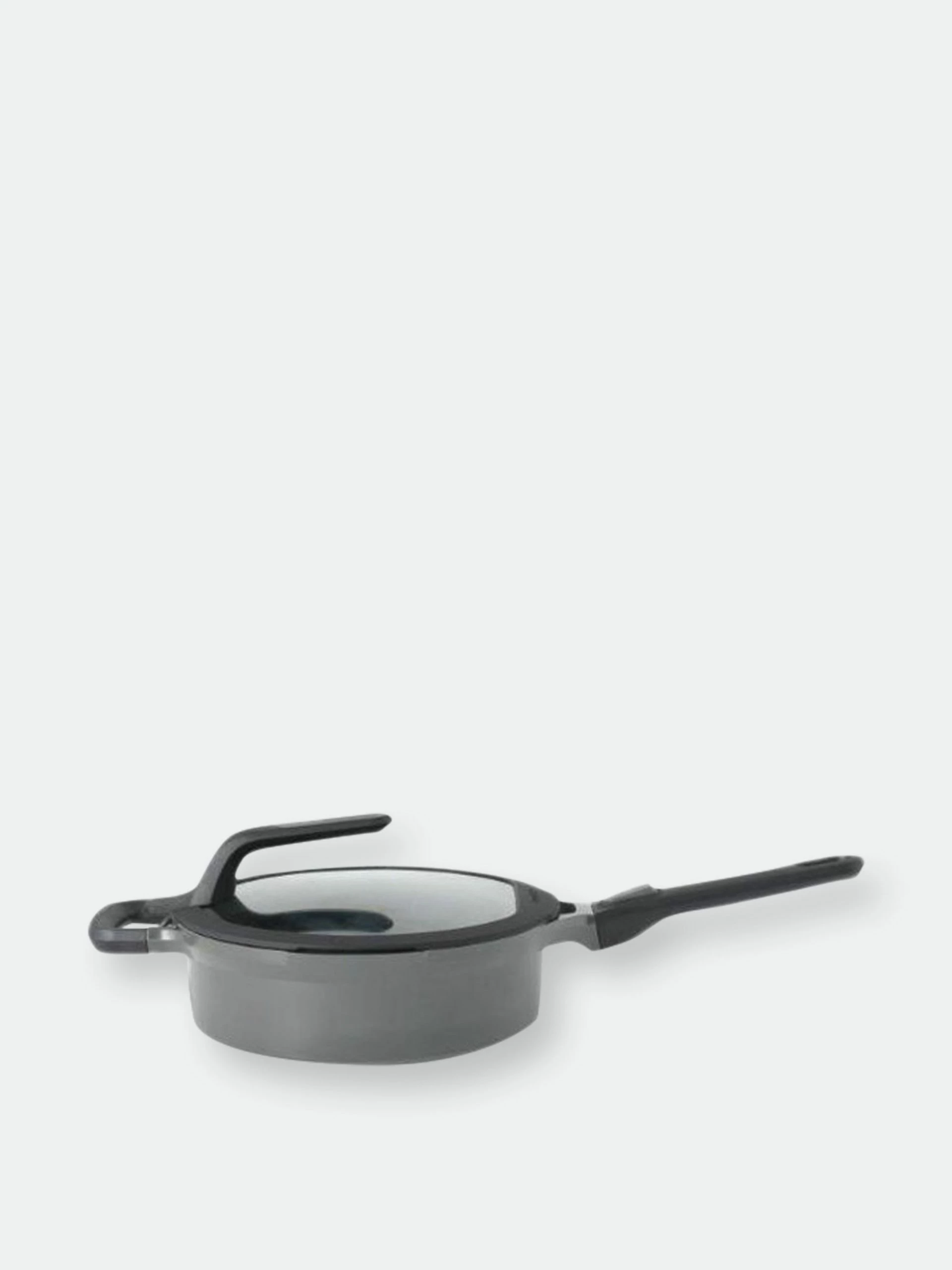 Pan-frying chicken, braising meat or sautéing vegetables, whatever your dish needs, you’ll easily get it done with this covered sauté pan. It’s suitable for any kind of stovetop and comes with a stay-cool detachable handle that you can snap off to place the pan in the oven or save valuable storage space in your kitchen drawer. The lightweight aluminum body features a multilayered non-stick coating that ensures an easy food release and special pouring rims for dripless pouring. To top this off, there’s the clear glass lid that can be placed vertically on the body of the pan to keep your hands free for stirring and serving and has two different sized pouring areas for easy straining of various ingredients. Suitable for all cooktops including induction. Inside dimensions: 10x10x3 / Outside dimensions: 20.25x10x5.75