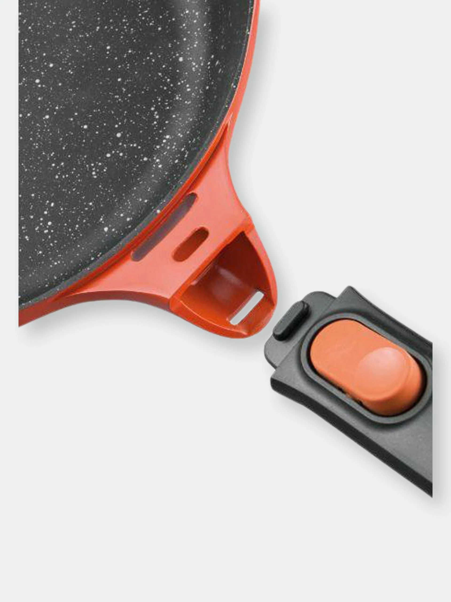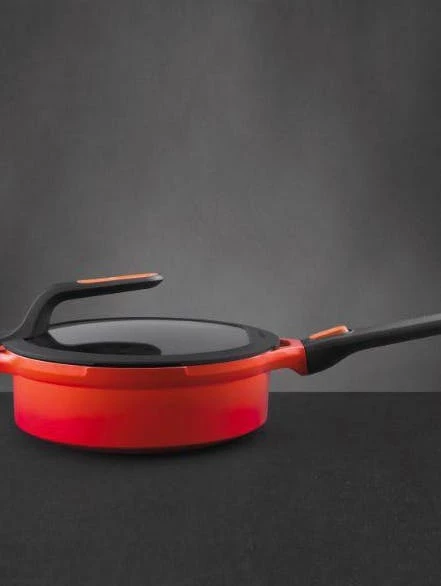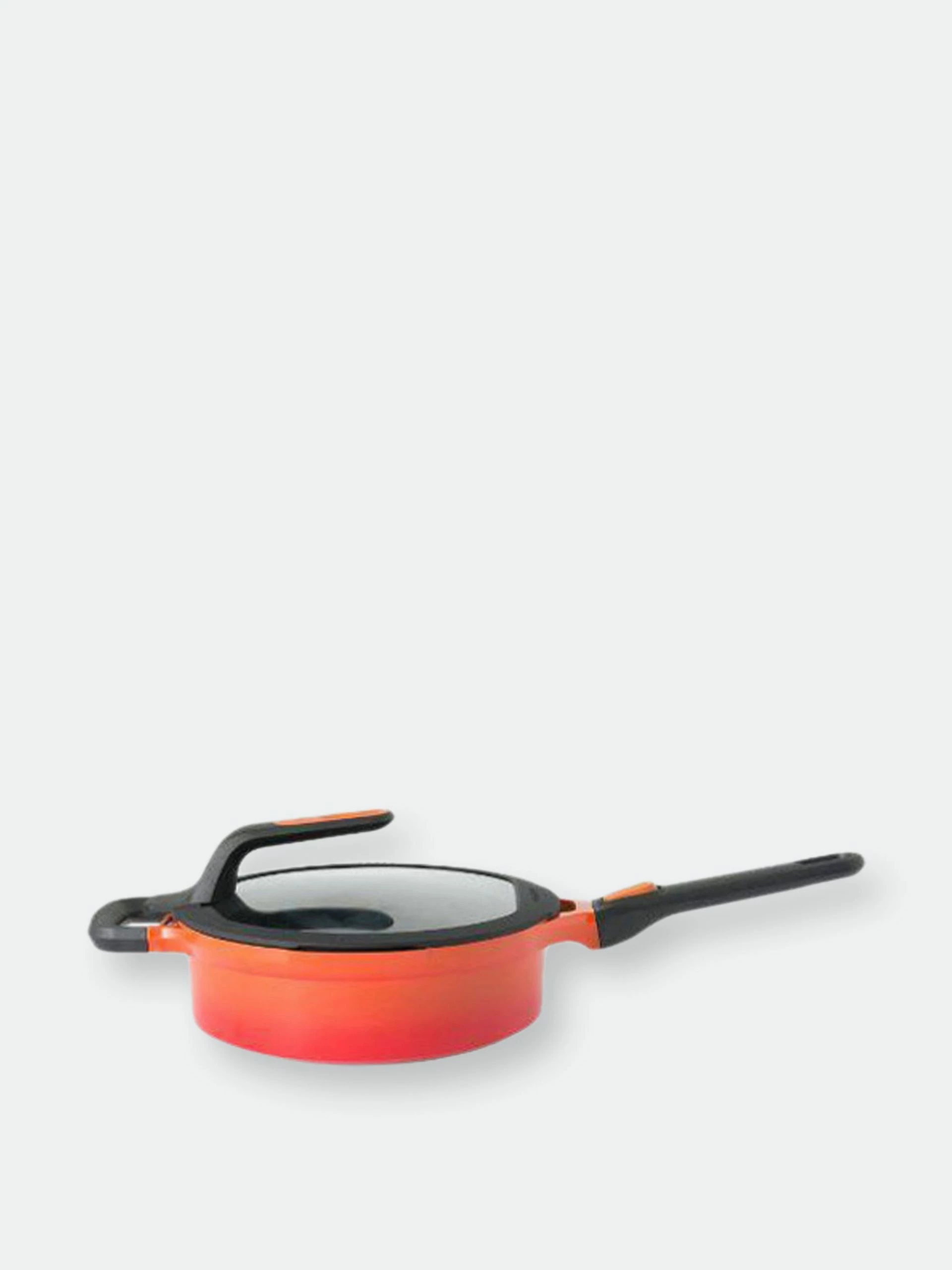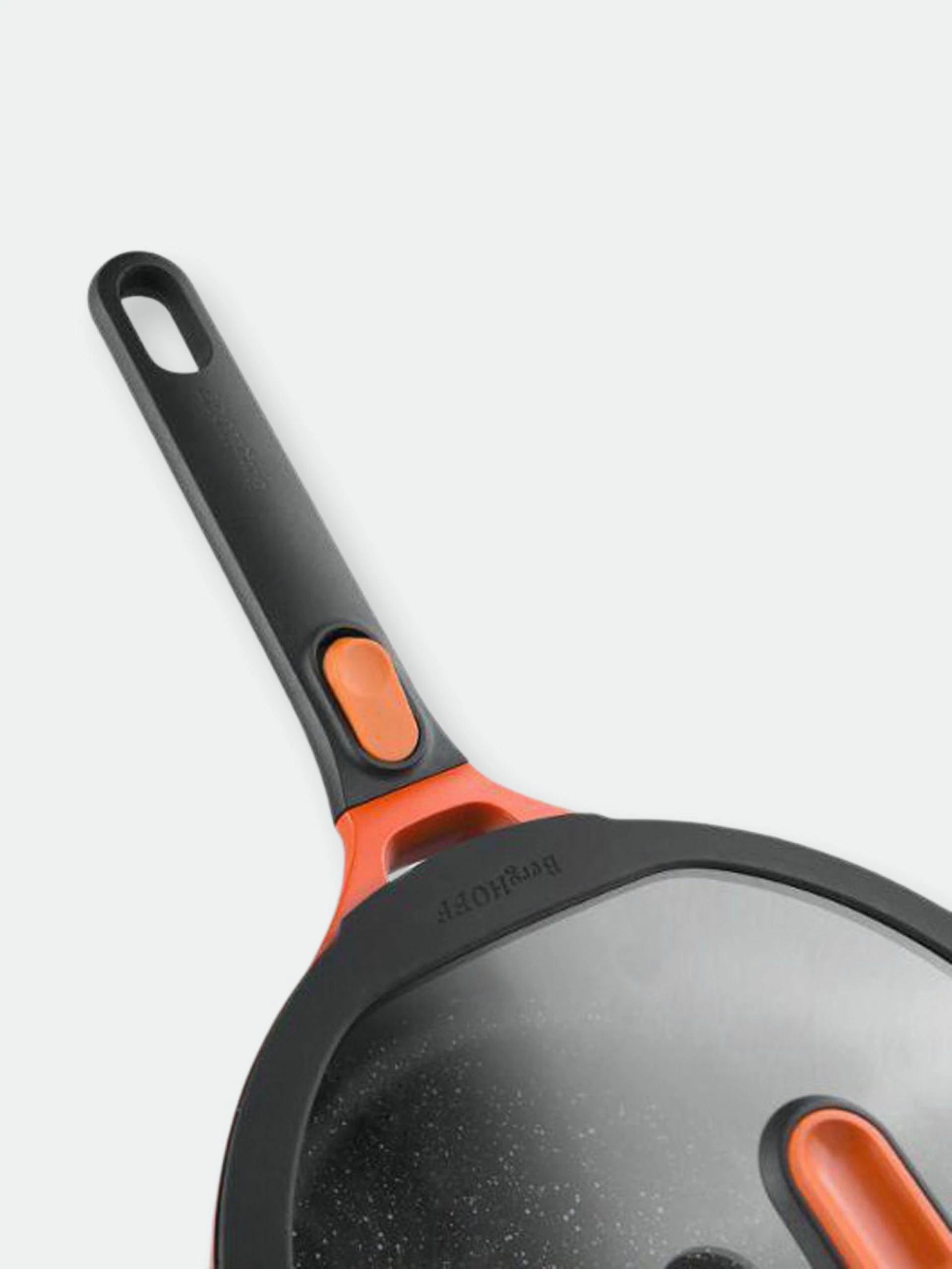 Versatile is the best word to describe this aluminum sauté pan with detachable handle. Whether you want to fry a couple of burgers, sauté vegetables or rustle up a risotto, with this pan it’s a piece of cake. Want to cook a larger piece of meat in the oven? Just snap off the detachable handle and slide the pan in the oven with the convenient helper handle! Like the other pots in this range, the sauté pan features a high-quality non-stick coating and pouring rims as well as a lid that has two pouring areas for precise straining and can be positioned vertically on the pan to avoid condensation drops on your stovetop.
