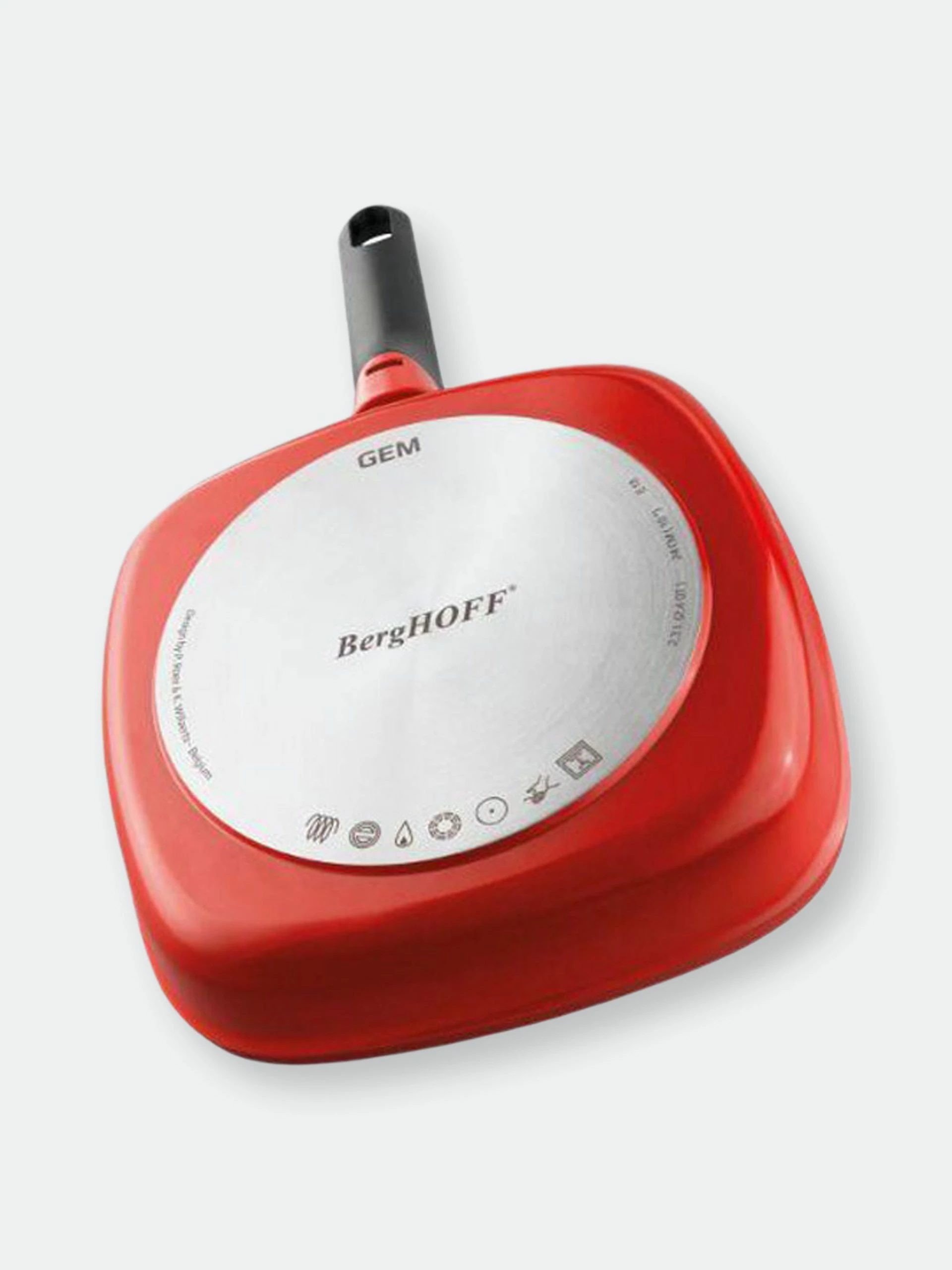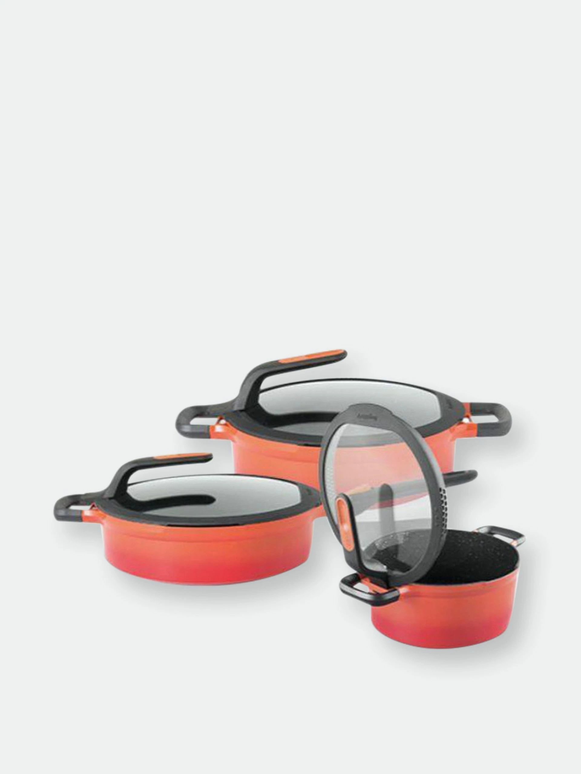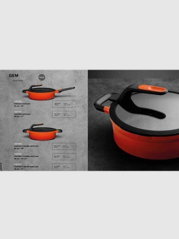 Versatile is the best word to describe this aluminum sauté pan with detachable handle. Whether you want to fry a couple of burgers, sauté vegetables or rustle up a risotto, with this pan it’s a piece of cake. Want to cook a larger piece of meat in the oven? Just snap off the detachable handle and slide the pan in the oven with the convenient helper handle! Like the other pots in this range, the sauté pan features a high-quality non-stick coating and pouring rims as well as a lid that has two pouring areas for precise straining and can be positioned vertically on the pan to avoid condensation drops on your stovetop.