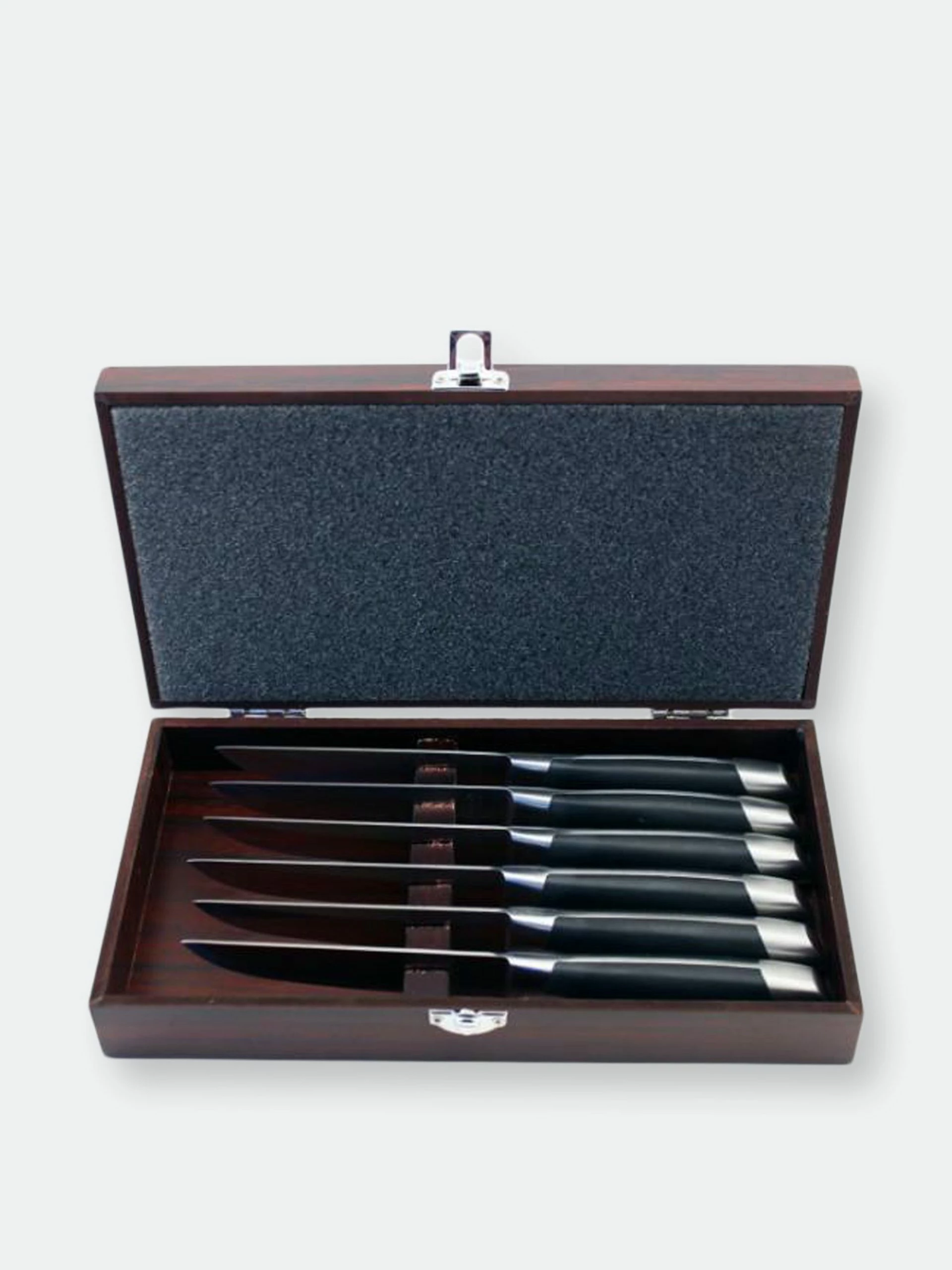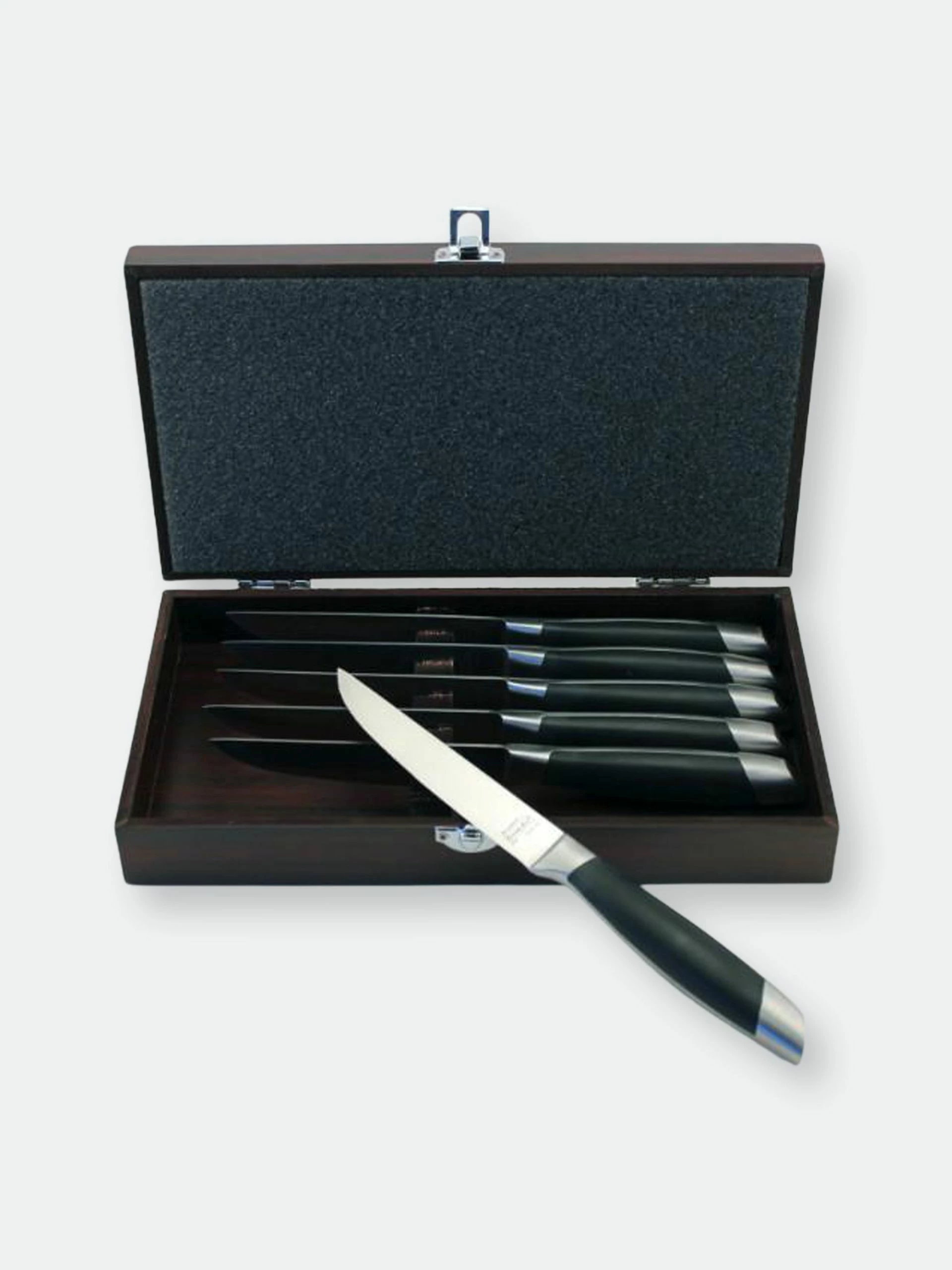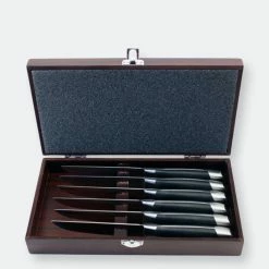 Set Includes: 6-Steak Knives & Wooden storage case. The Geminis knives create a perfect balance between the blade and handle allowing you to safely use these hand sharpened knives. Handles are ergonomically molded for a safe, comfortable grip. Hand wash recommended.