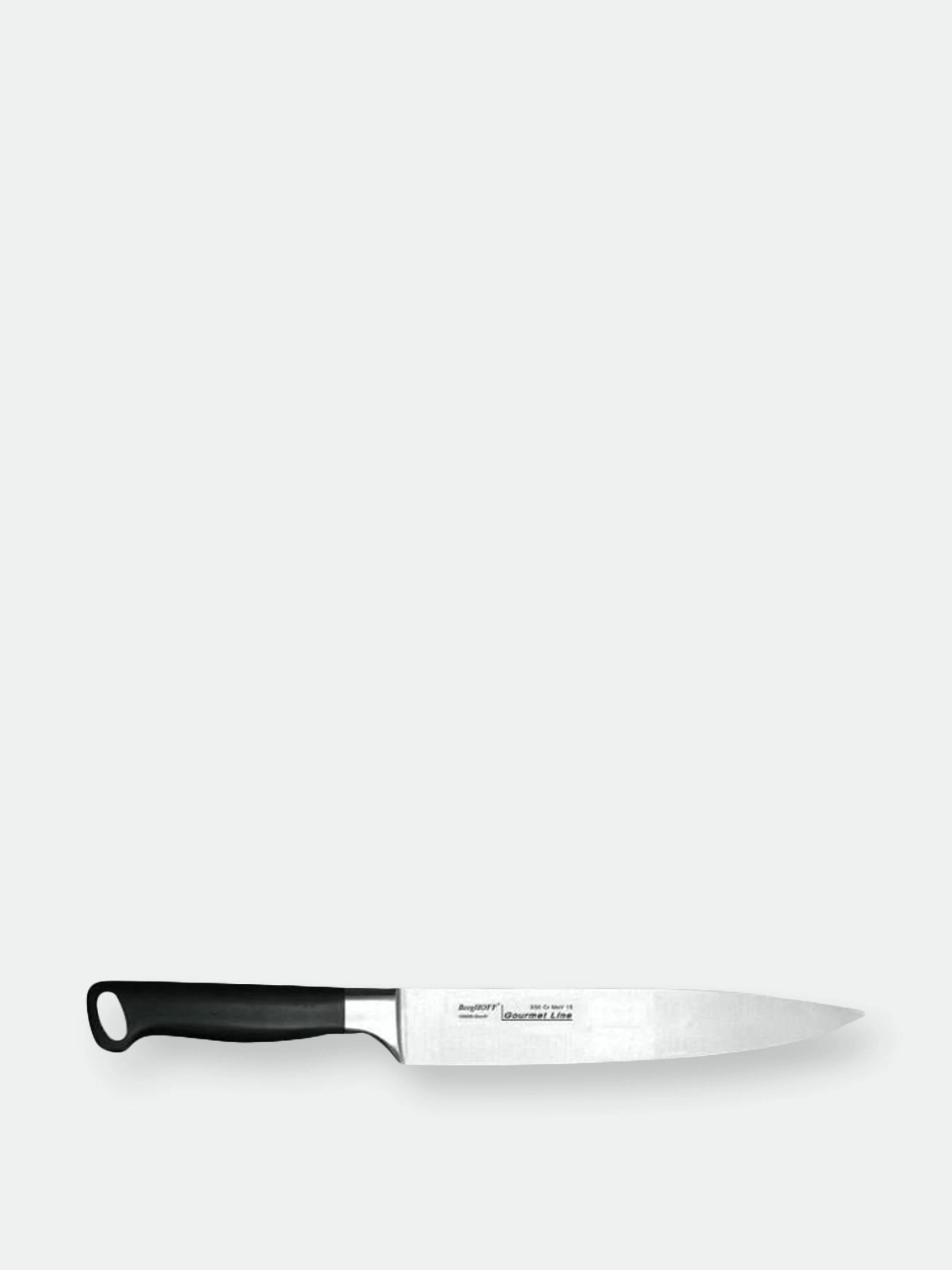 The 8″ Carving knife goes from the catering student, to the home cook, right up to the top chef. Anyone involved in food prep agrees that it’s an essential to have good, sharp, professional knives. The Gourmet Line is created with the highest quality stainless steel, and is equipped with a forged bolster for added weight, perfect balance, and increased safety.