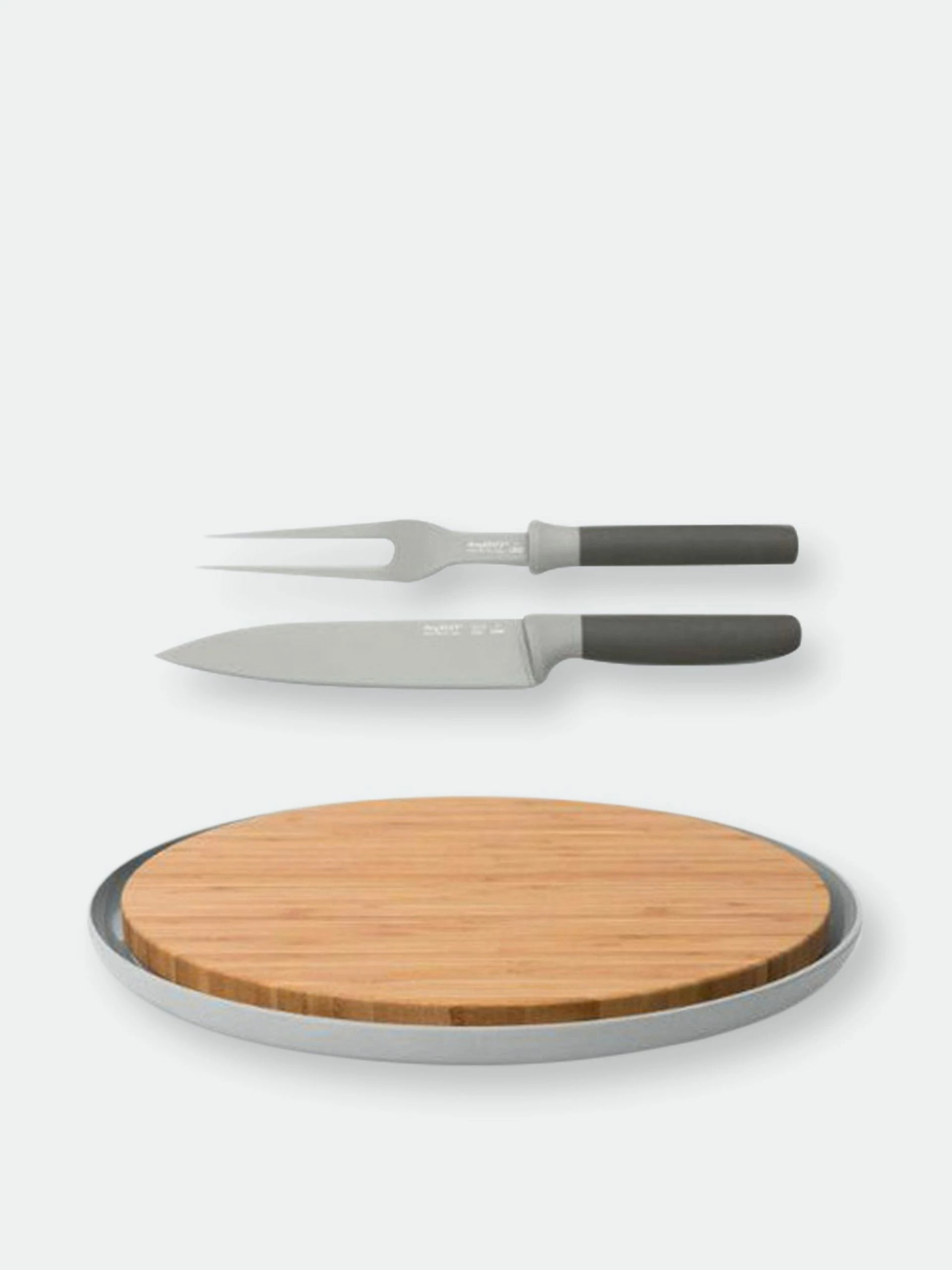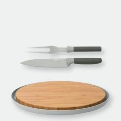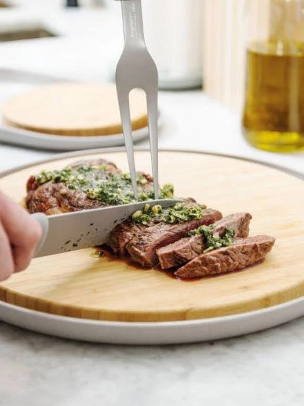 Is it a carving board, a serving board or two nested plates? All of the above! The bamboo cutting board nests neatly inside the plate which collects all the juices when you’re carving your meat. Or you can also use them separately as two stylish plates to upgrade your outdoor dining: the bamboo board to serve meat and the plate for all kinds of side dishes and extras. And why not use it to present a delicious cheese platter? Lunch, dinner or party, this board is the perfect go-to every time! Slice your turkey, ham or Sunday roast as thin as you want with the Leo carving set. The carving fork holds your meat securely in place with its two sharp tines while you use the thin sharp blade of the carving knife to carve the meat precisely. Both the carving fork and carving knife have a soft-touch handle that’s comfortable to hold in your hand and well-balanced. Gather everyone around the dinner table and impress them with your carving skills!