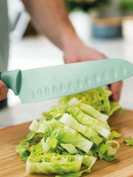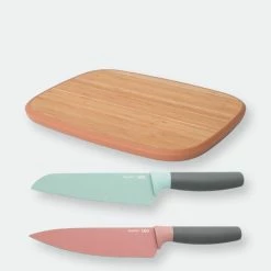 The Leo collection is the perfect addition to any cooks‘ kitchen. With its bold colors and sharp innovations, this collection is sure to please. This set includes a bamboo cutting board, santoku knife and a chef’s knife. The non-stick blades and soft handles are sure to add comfort while preparing meals for yourself or your family. This set will round out your current assortment and will quickly become your favorite tools for any job!