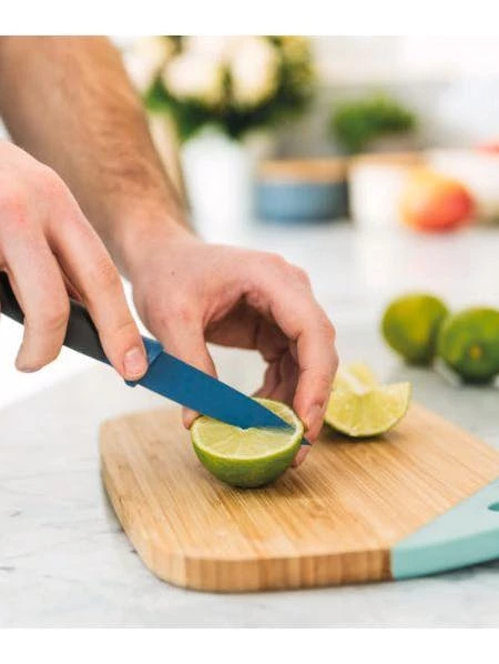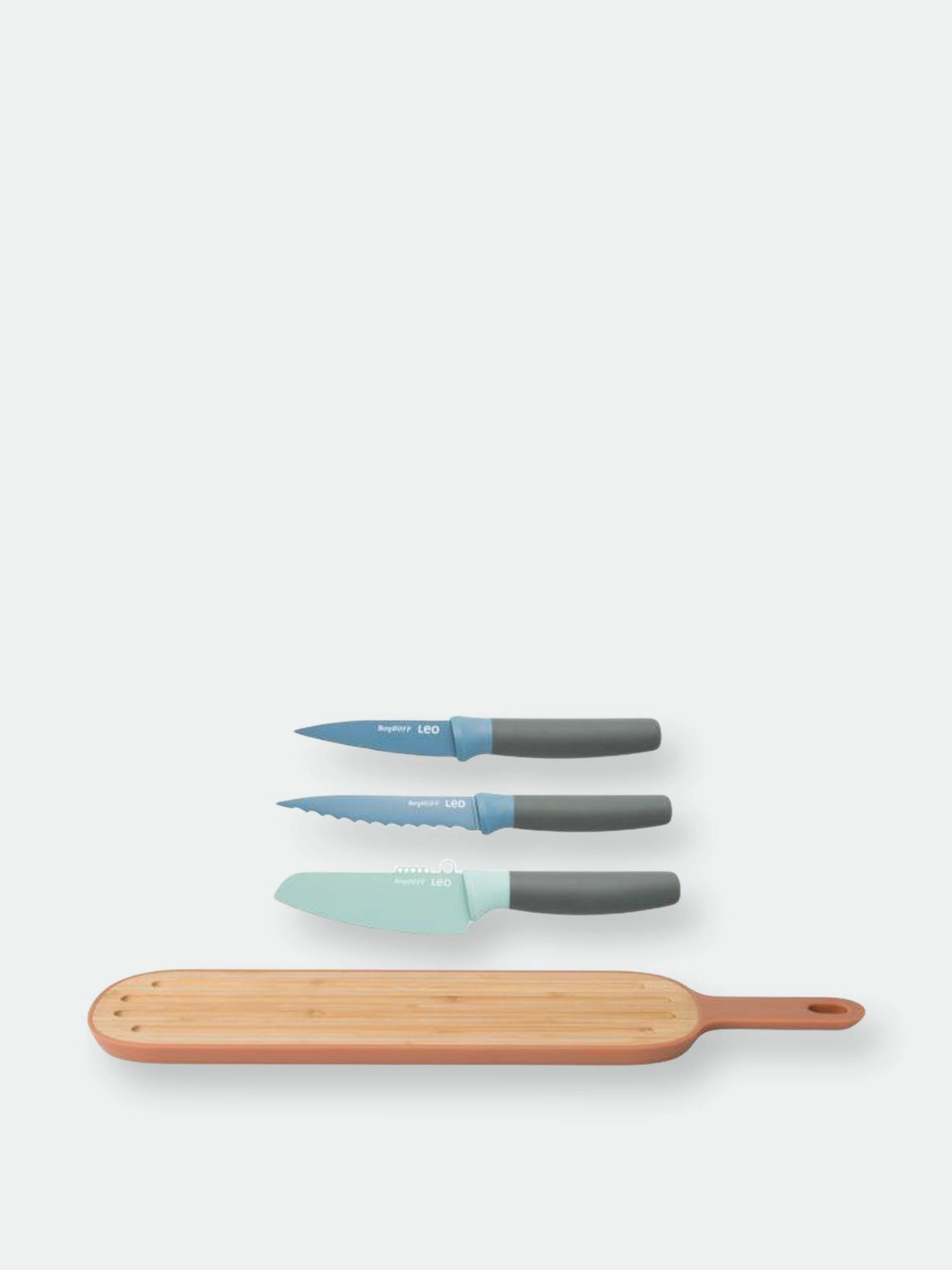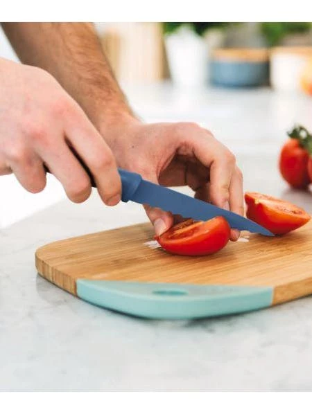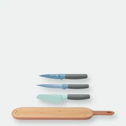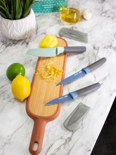 A complete cutlery set with board included – the Leo 4pc Cutlery & Board Set will give you the basic tools you need in the kitchen. Each knife comes with a soft-touch handle for comfort and easy grip, made with stainless steel for a blade that will never fade. The cutting board is made from strong bamboo wood, perfect in its size for slicing baguettes or loaves of French. The slotted cutting surface makes sure the bread crumbs don’t spread out over your kitchen surface.