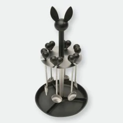- Materials: – Satin-finished stainless steel tools and black polypropylene head.- Rack with stainless steel center pole and black PP handle.