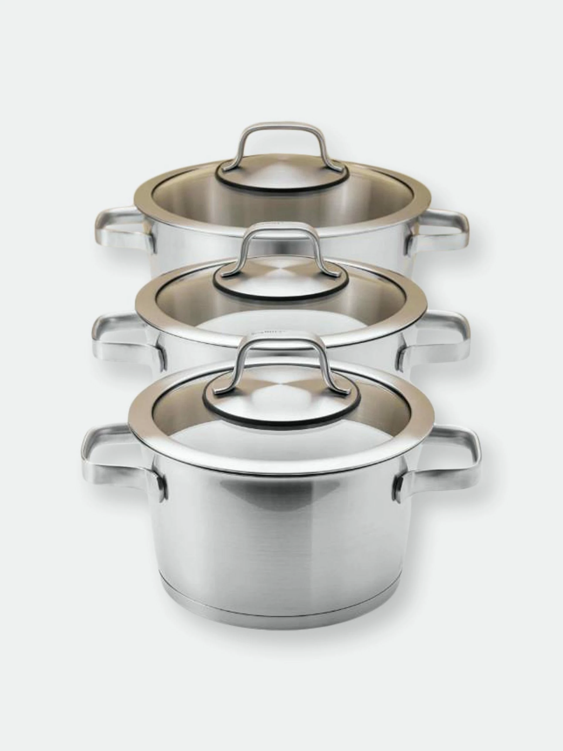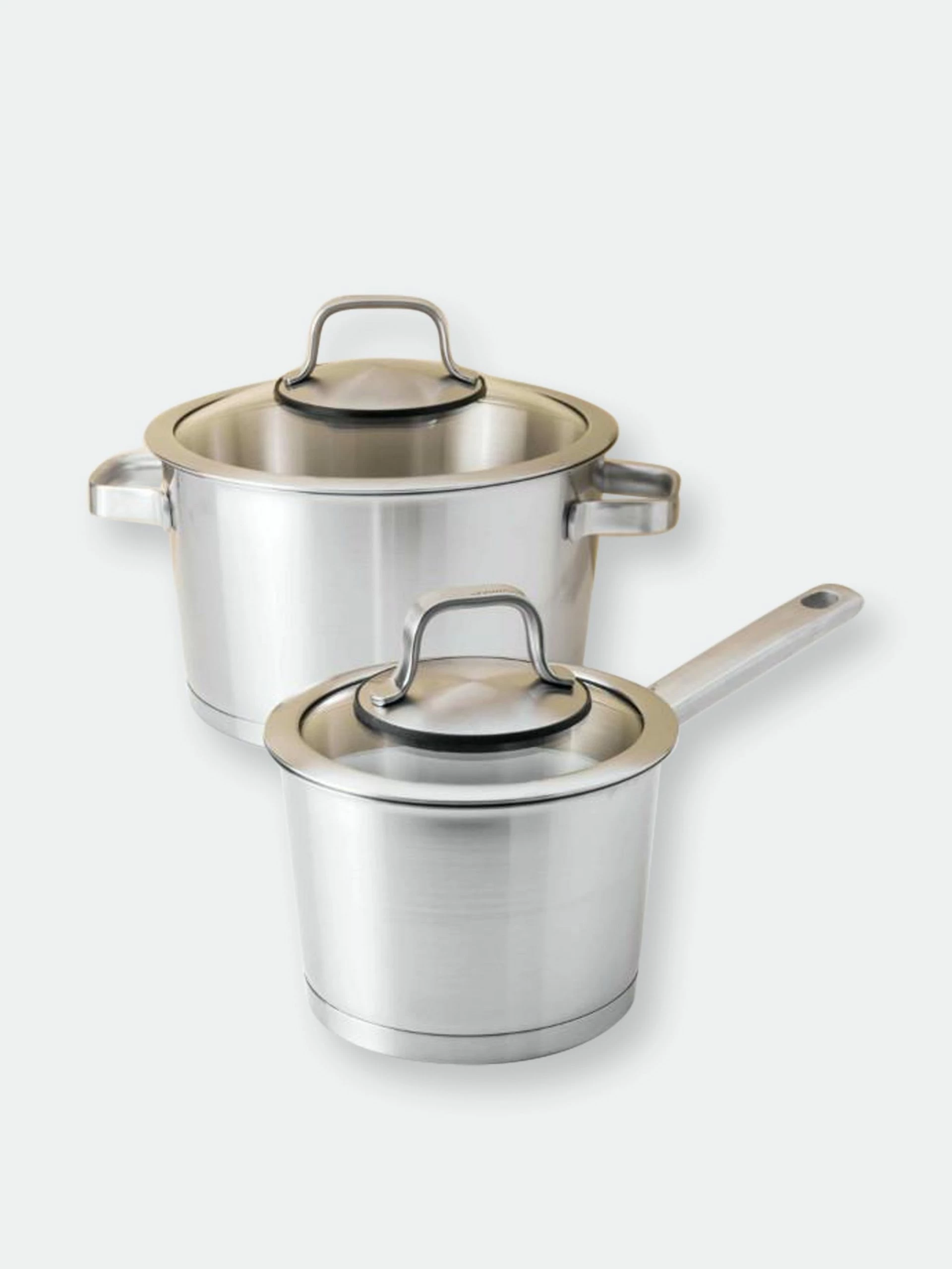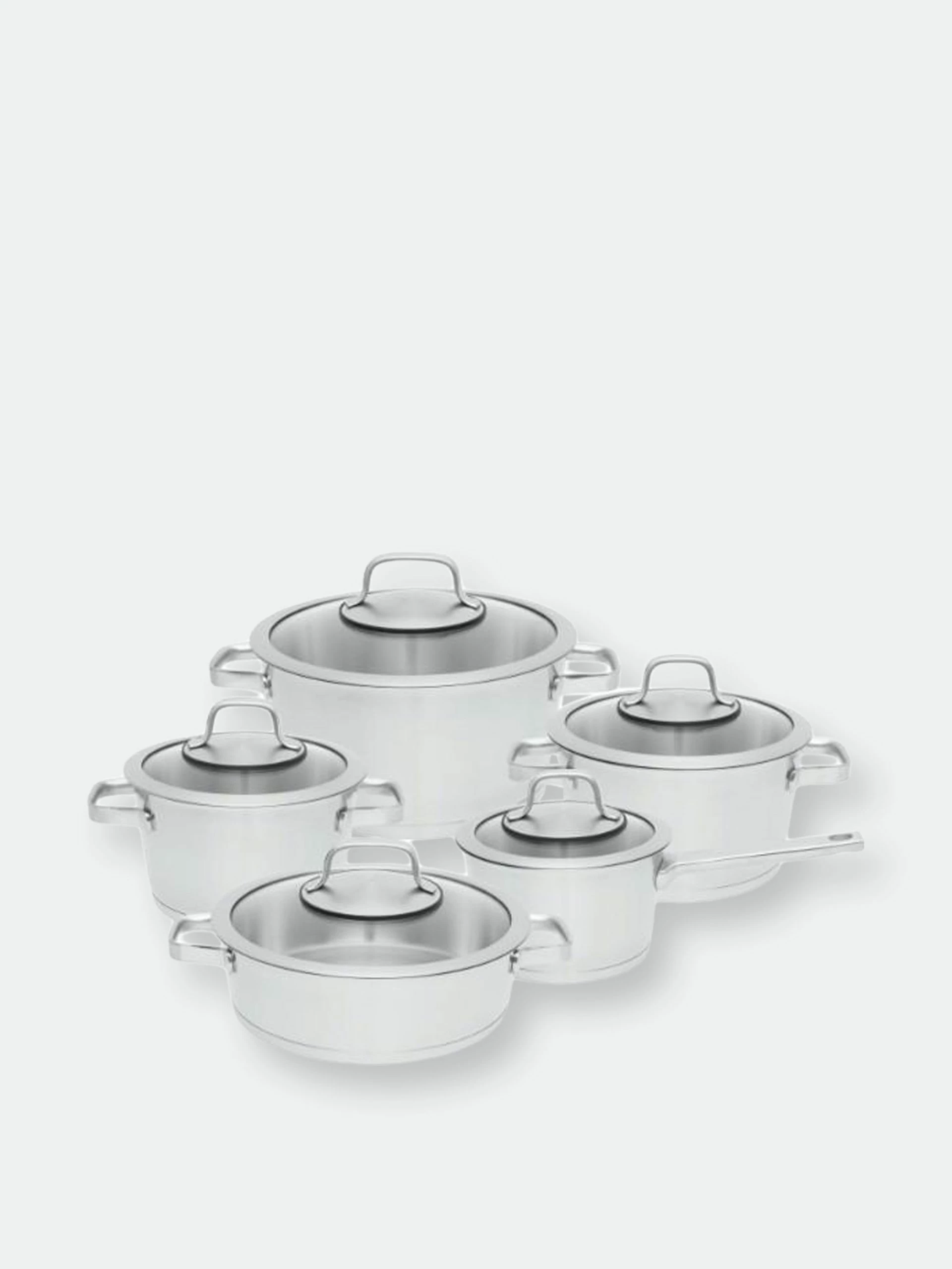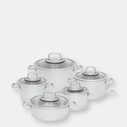 Looking for a cookware set that covers all the basics and immediately adds a touch of style to your stovetop? Then this 10 piece cookware set is just the thing for you! It consists of a covered saucepan, an 7″ and 8″ covered casserole, a covered 10″ stockpot and a covered 10″ 2-handle deep skillet, which are all suited for every kind of stovetop, induction included. All the pots and pans are made from high-quality stainless steel for extra durability and hygiene and come with a glass cover that allows you to monitor your food during cooking without losing valuable energy.