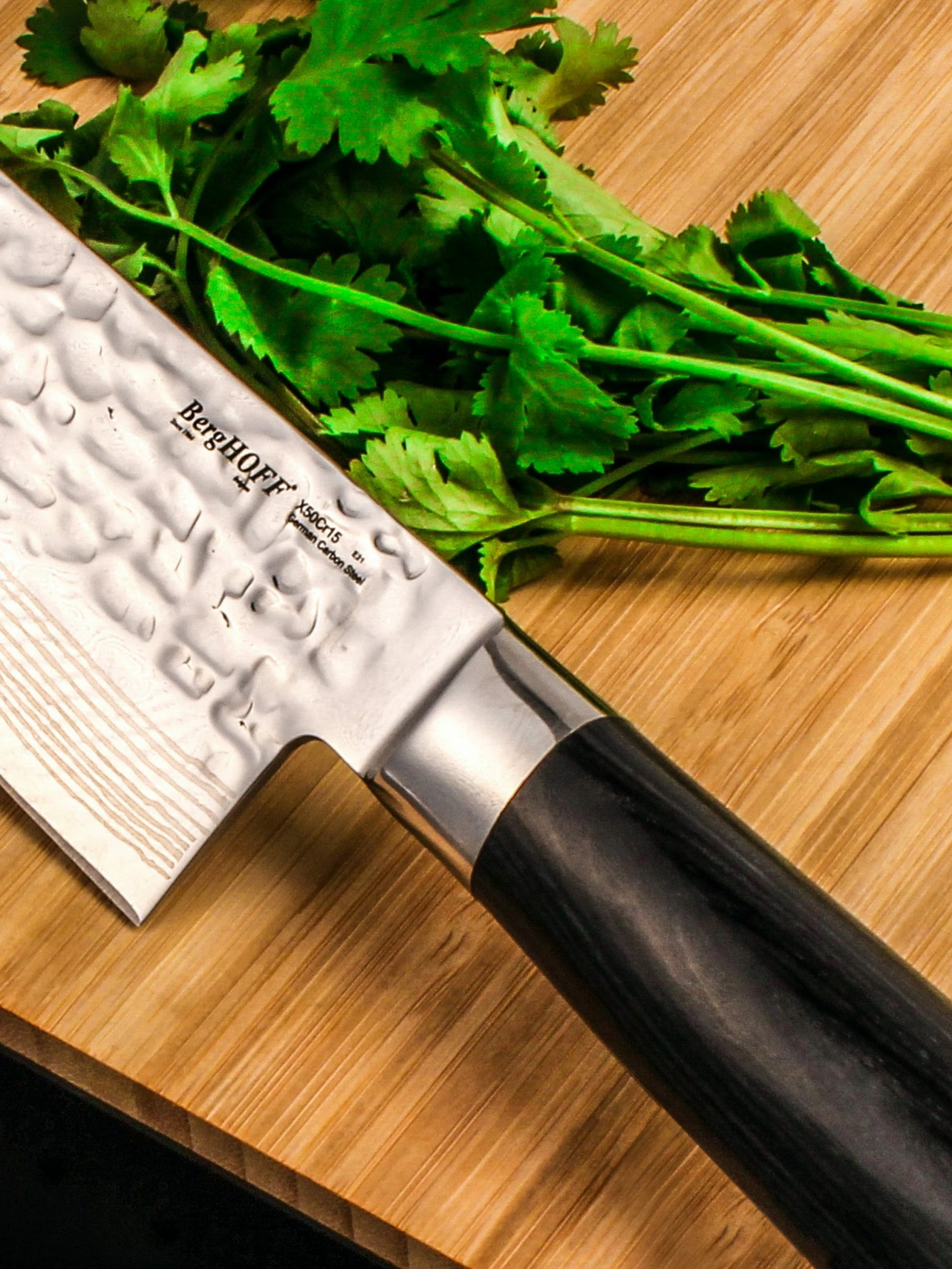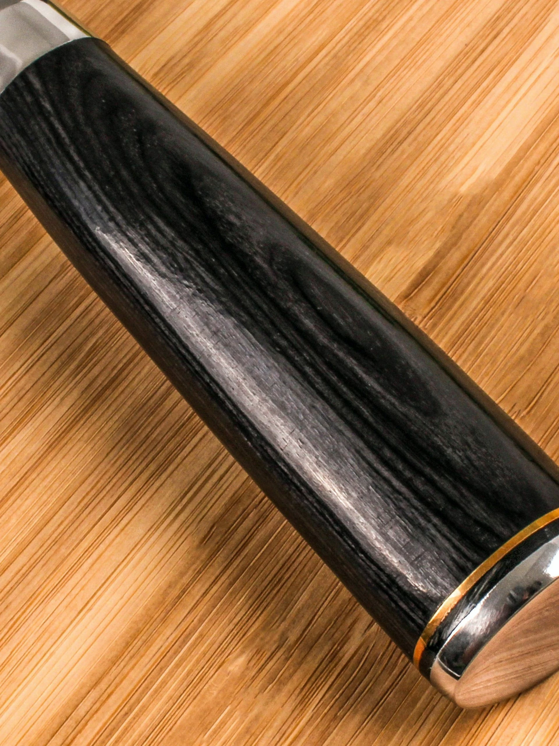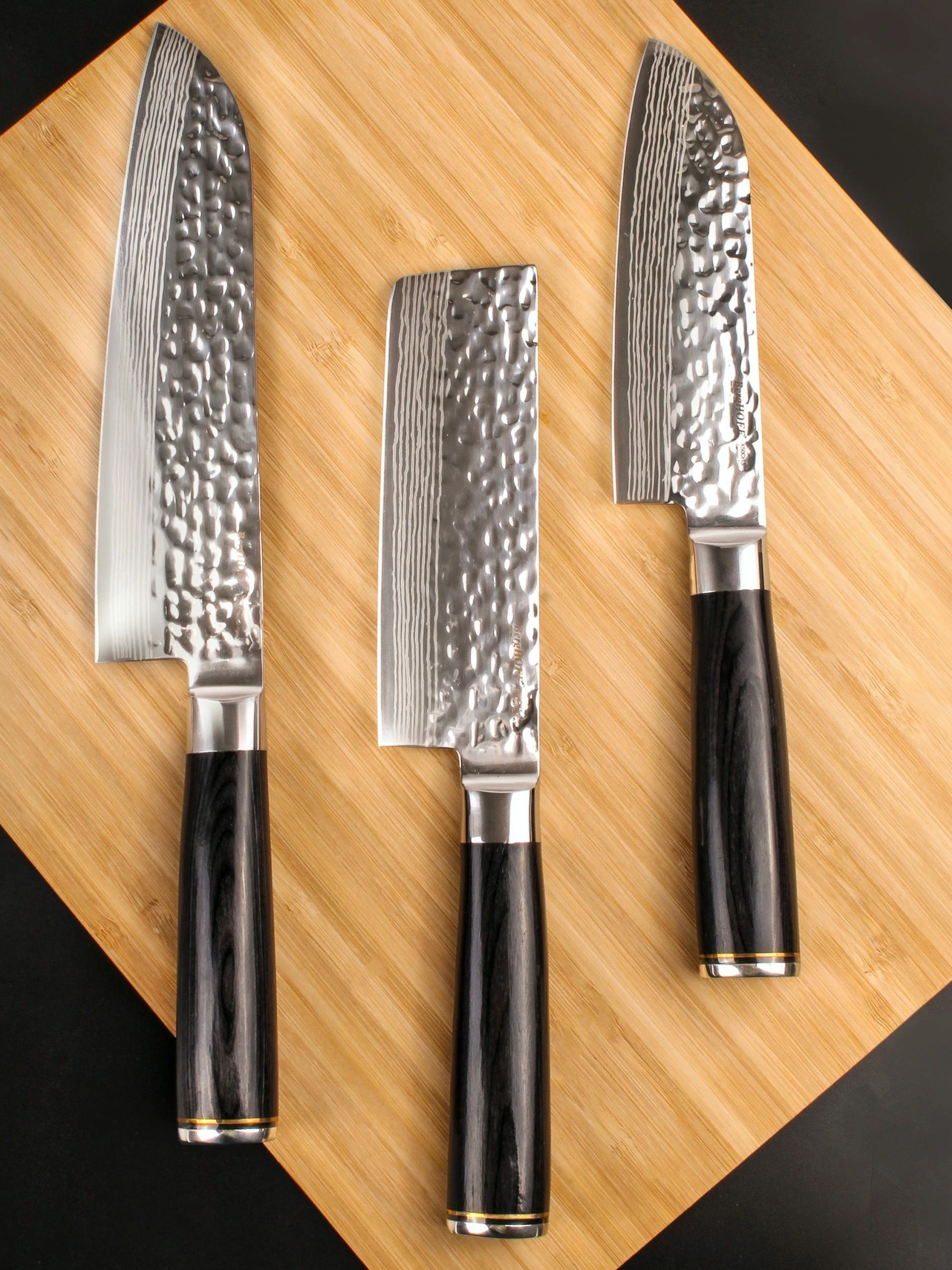 The appeal of these Hammer Dot steel knives extends beyond the intricate patterning on the blades to their superior strength and razor-sharp edges. Beautifully balanced with a heavy bolster and ergonomic handle, these remarkable blades are truly something special.