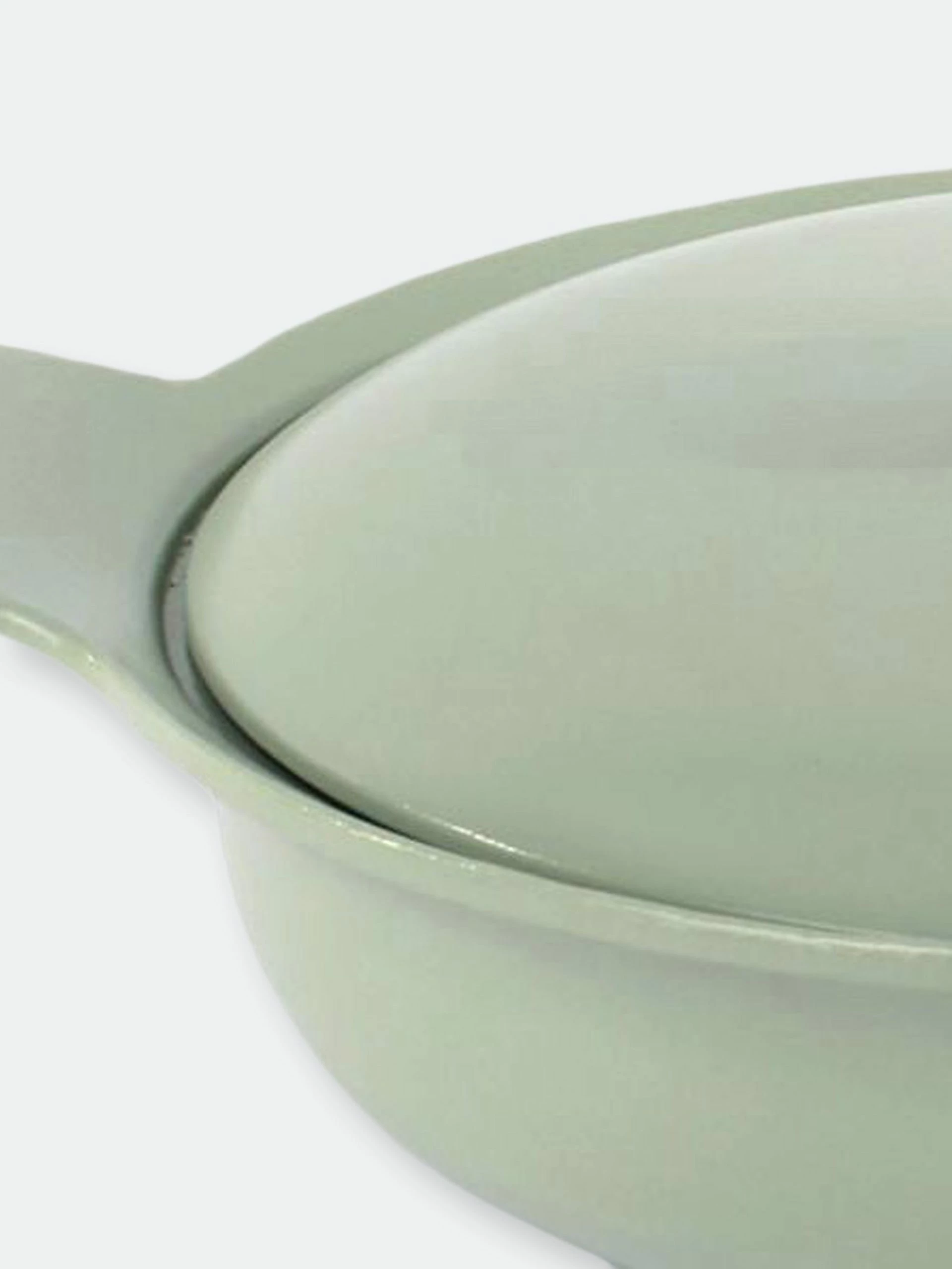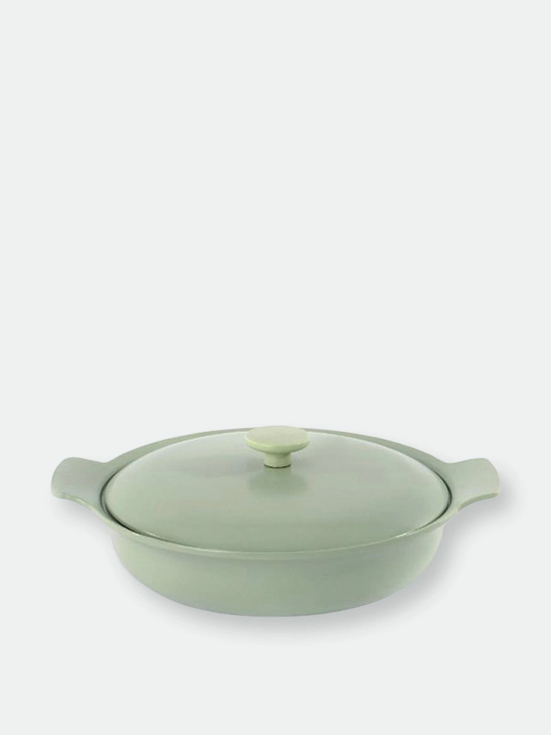 11″ / 3.5qt Green Covered Deep Skillet is made of Cast iron which has great heat retaining abilities: it’s the perfect choice for slow cooking and for hearty stews prepared in the oven or on the stovetop. The cover locks in the moisture and small bumps on the interior make sure the evaporated juices are directed on to the food for extra tasty results. Only little oil is needed with this pan: the perfect option for low-fat frying. Wide handles for a safe grip, even when wearing oven mitts or using potholders.