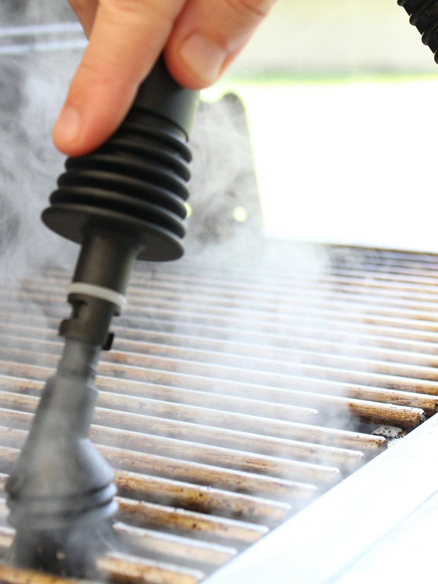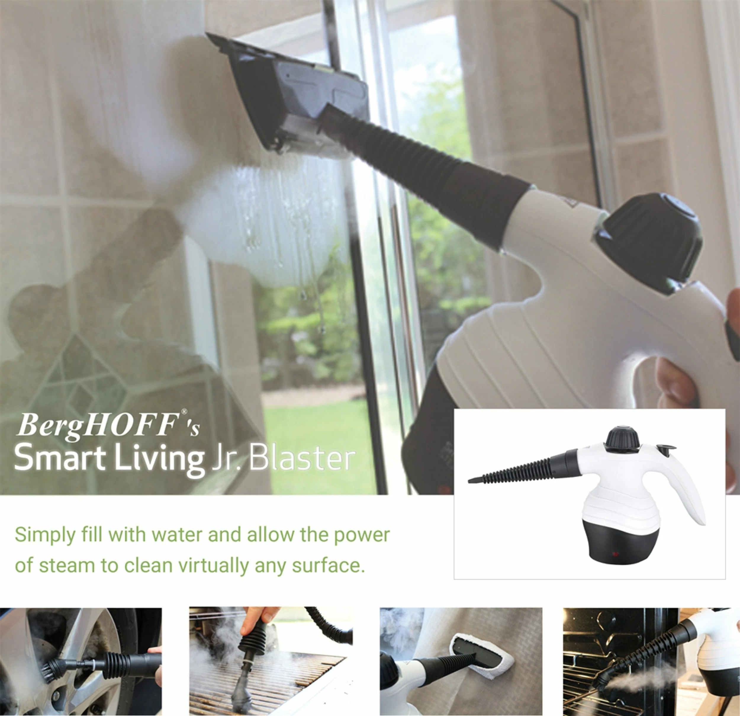 The hand held steamer that disinfects, sanitizes and removes tough grease using only pure clean water. Versatile Cleaning with Steam The Smart Living Steam Jr. has exclusive patented technology and uses only continuous high temperature steam (275 F) to clean and sanitize ceramic floor boards, counter tops, doors, windows and clothing. Safe for you and the environment.