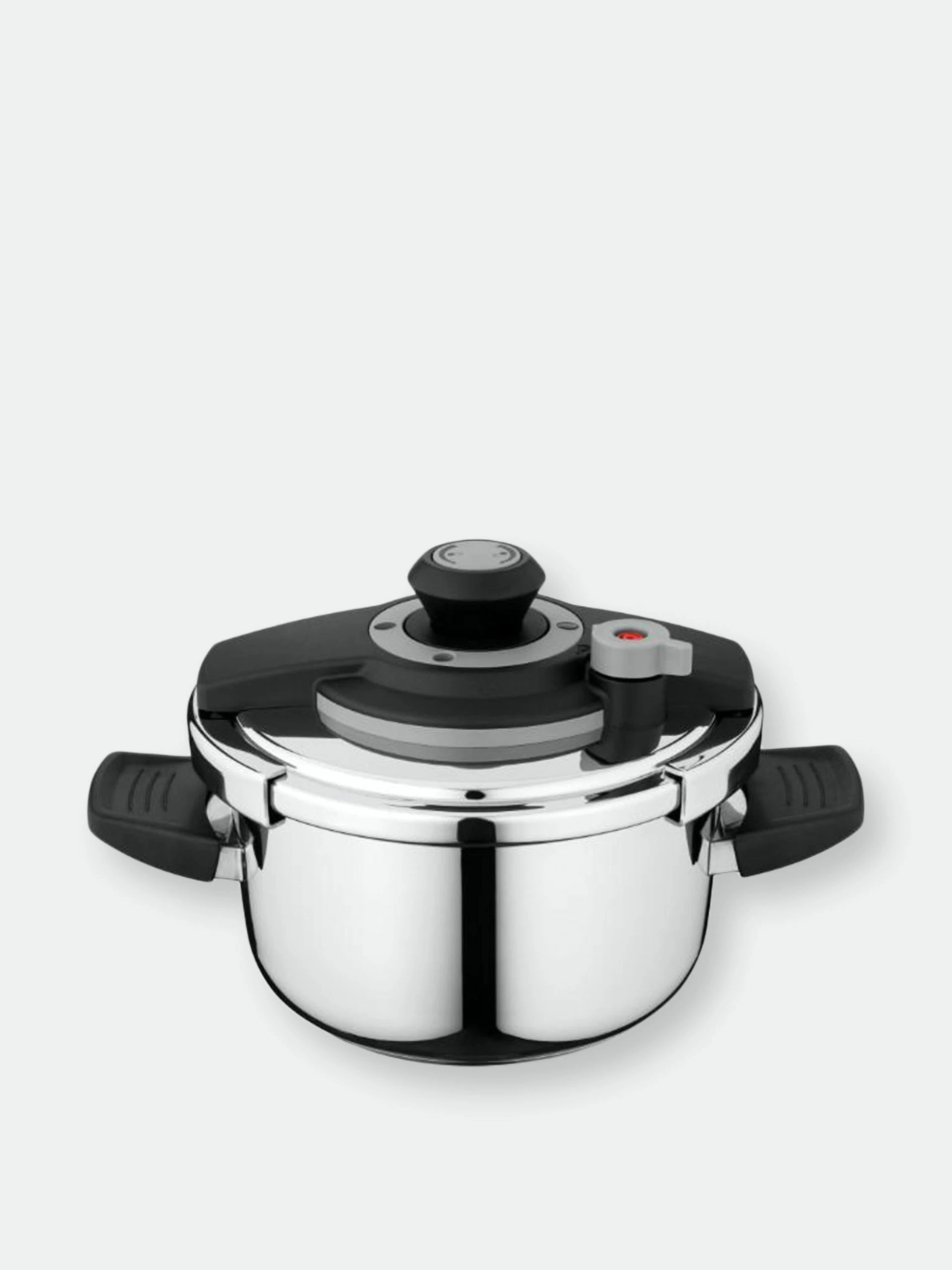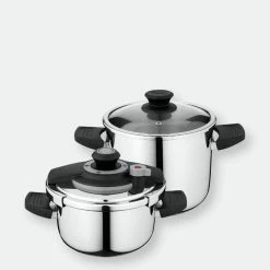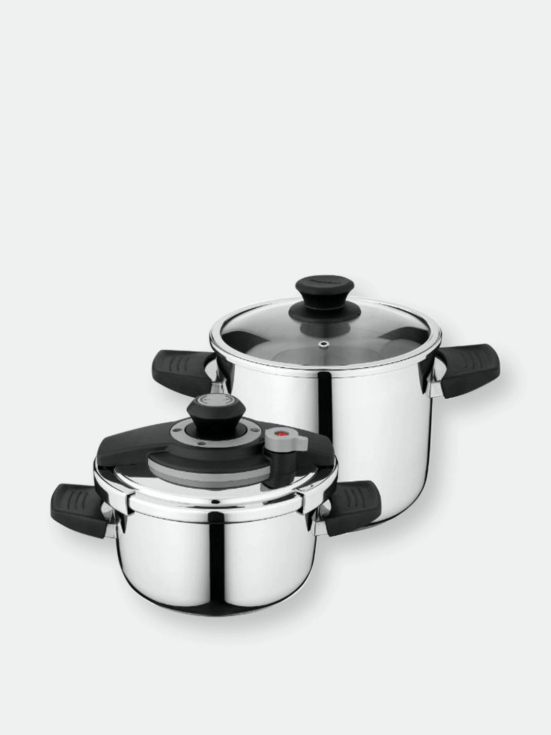 4-pc pressure cooker set, Give fast food a whole new meaning with this set of pressure cookers! It includes a 4 liter and 7 liter stainless steel body, a pressure cover and a glass cover, allowing you to use the pots for regular cooking as well. The cookers have convenient scaling marks inside and can be used on any stovetop, including induction. No need to worry about safety thanks to the quick-release and open-lid regulator, the lid lock and overpressure plug.