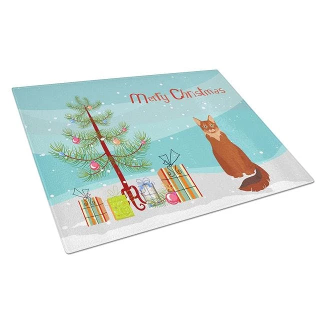 Tempered glass cutting board is heat resistant and hand wash only this chopping board is bright and colorful. These unique cutting boards feature artwork from some of your favorite artists prints. They will beautify and protect your counter top, heat resistant, non skid feet and virtually unbreakable. Design: Somali cat merry christmas