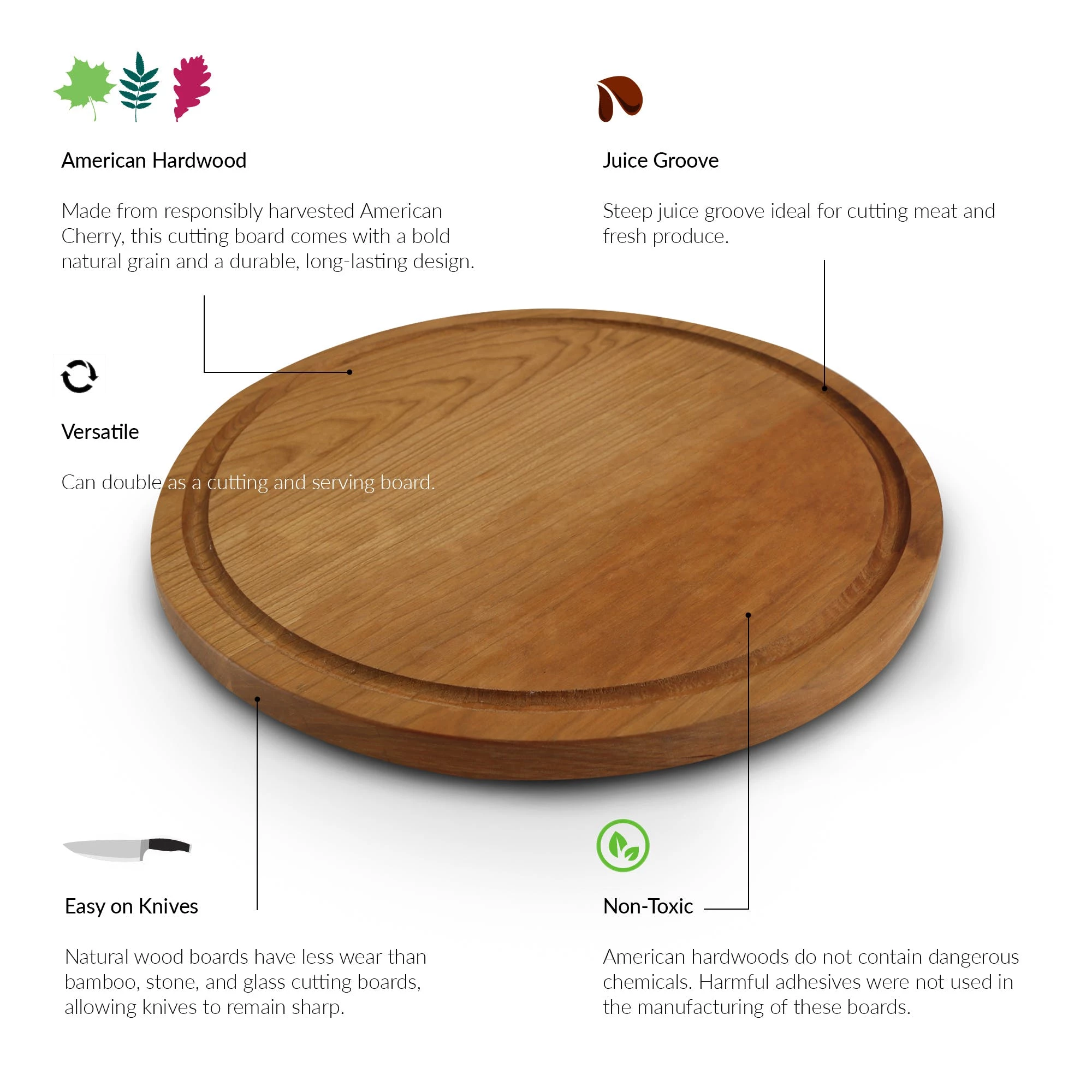Made from responsibly harvested american cherry wood, this versatile cutting board has a juice drip groove on one side and can double as a sleek hardwood serving platter on the other. Sturdy, long-lasting and non-toxic, the cherry round cutting board features a bold color of all-natural grain, allowing the perfect surface area to entertain guests with cheese, bread, and other hors d’oeuvres.