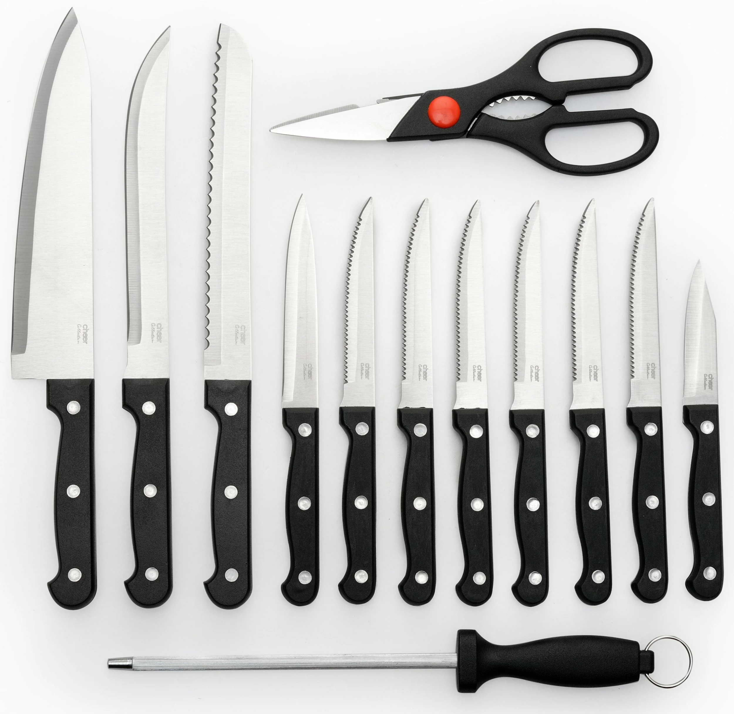 When it comes to preparing food, there is breakfast, lunch, dinner, and a wide range of snacks in there that you have to get ready every day. That is why you need a versatile knife set that can do it all and then some. Introducing the cheer collection 13-piece kitchen knife set complete with wooden kitchen block, carving knives, shears, and even a knife sharpener. This premium set of professional chef quality knives gives you more utility than you ever thought possible.