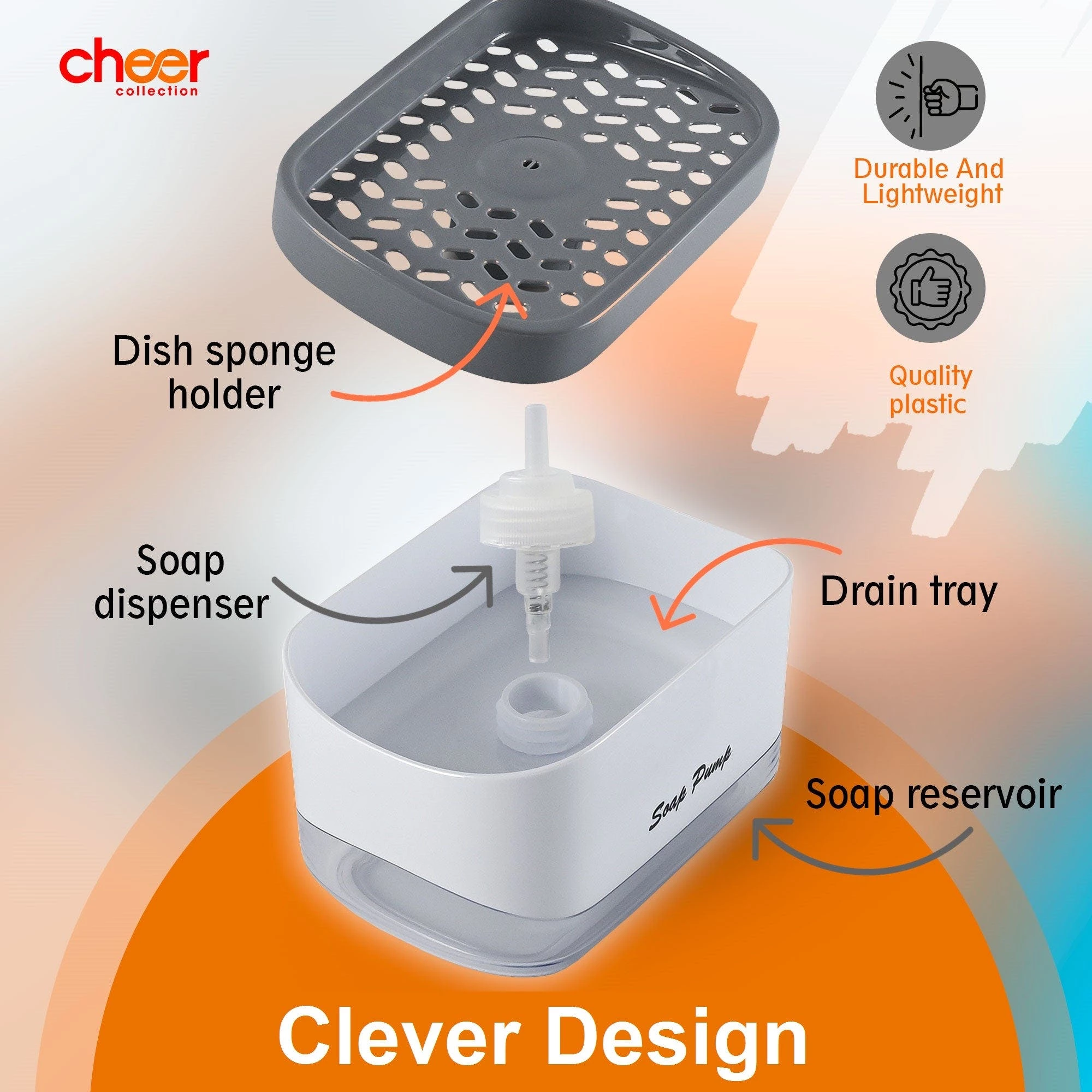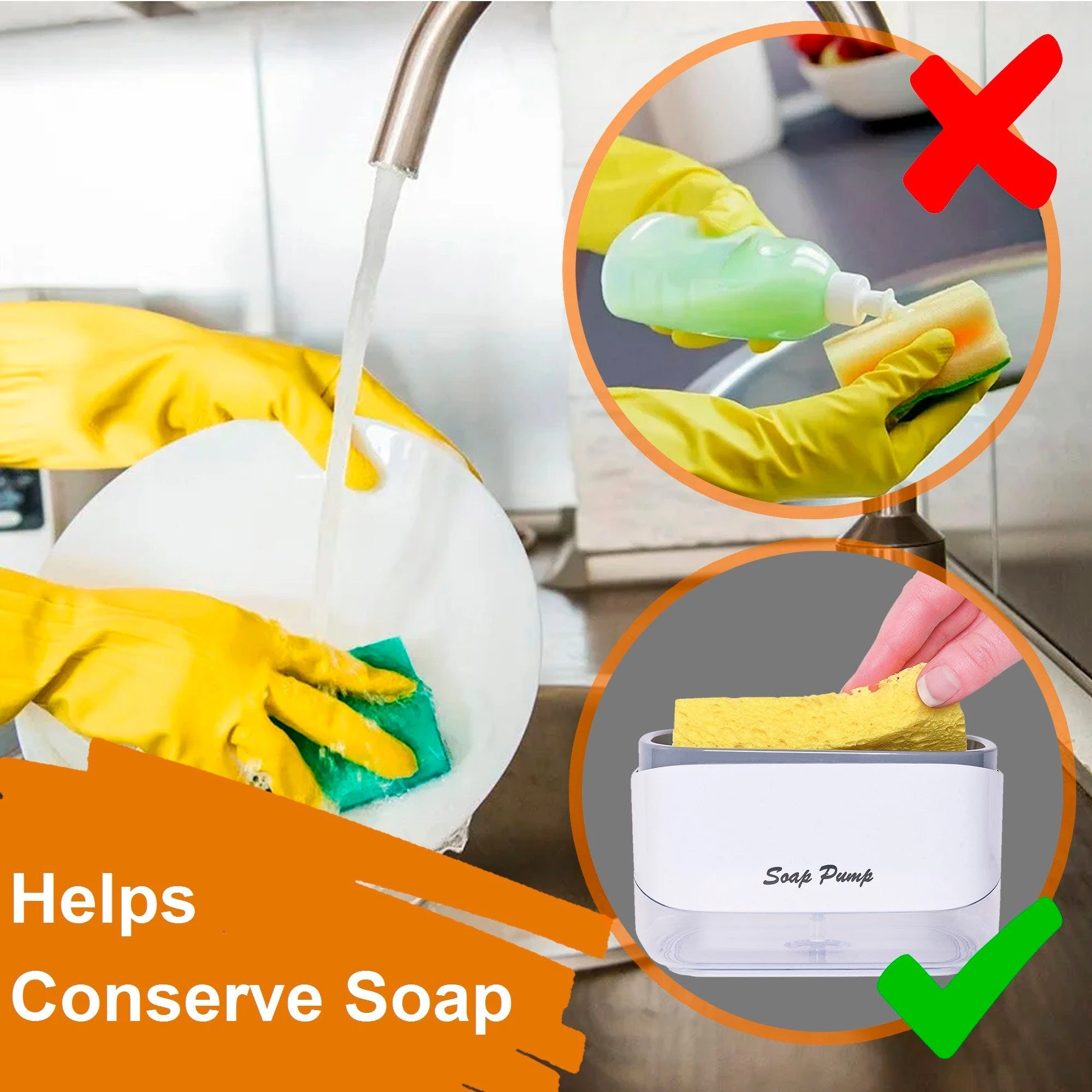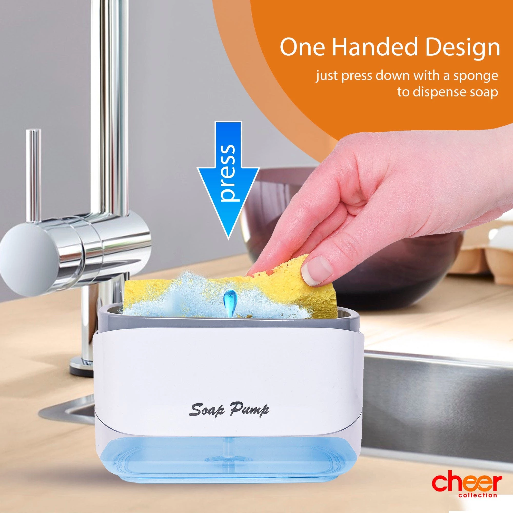 2-in-1 Soap Dispenser: This soap dispenser with sponge holder is the perfect choice for anyone who wants to make dishwashing faster and easier. It combines a soap dispenser and dish sponge holder that automatically dispenses soap whenever you press downDurable And Lightweight: Our kitchen soap caddy is made using sturdy yet lightweight plastic to make sure it can handle daily use. Thanks to the lightweight you can easily move it around yet won’t slide or skid around once placed down for convenient cleaningCleverly Designed: The sponge and soap holder for kitchen sink uses a drain tray that collects water from the sponge while preventing it from mixing with the soap. It’s designed to save you both time and effort to make washing dishes faster while keeping counters clean Save Time and Soap: Our sponge soap dispenser is designed to dispense the perfect amount of soap every time whenever you press down the sponge to help reduce soap waste and speed up cleaning. It’s suitable for use with most types of liquid soaps Unique Gift Idea: Besides being a practical and functional addition to your kitchen sink, our dishwashing soap dispenser and sponge holder also makes a thoughtful gift for friends and family. It makes the perfect gift for Housewarming, Birthdays, Christmas, Anniversaries, and more