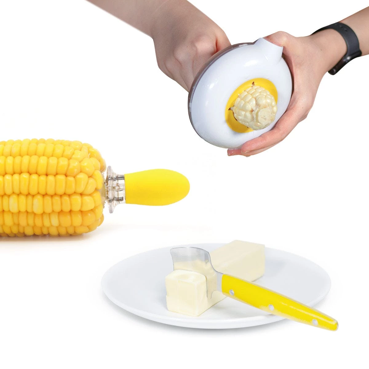 Grand Fusion Ultimate Corn Accessory Kit. Peeler, Curved Butter Knife and 5pc Corn Cob Holder (2 Knives & Holders)