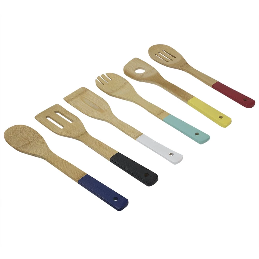 Modern meets country chic with this bamboo wooden spoon set. Handles are designed with bold colors to add an exciting contrast to the natural wood finish, making it a fun kitchen utensil set to cook up your favorite cuisines. Set includes spatulas and cooking spoons.