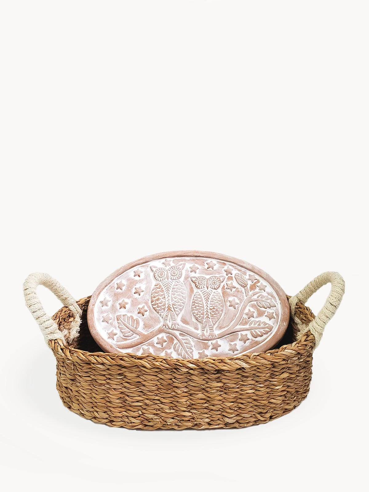 There’s nothing quite like the smell of warm bread on the weekend. Here, our terracotta plate has been engraved with the cute owls on a tree design and cut to fit neatly into an oval basket. This special bread warmer is naturally insulating, and the basket itself has been handwoven from sustainably grown seagrass. It’s the best gift item for anyone who loves bread! Each product is designed and curated by Korissa, sustainably handmade by Fair Trade artisans in Bangladesh.