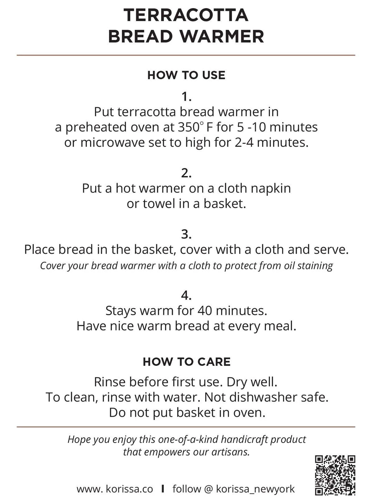 - Usage Instructions: – Bread warmer: Wipe stone clean with a damp cloth.- Basket: Dust or vacuum your basket on a regular basis, wiping with a damp cloth if necessary.- Do not rub stains or spills from your basket, as this may spread the stain and loosen the jute fibers.- Rinse before first use.- Dry well.- To clean, rinse with water. Not dishwasher safe.- Do not put the basket in the oven.- Be sure to dry properly after water damage.- Be sure to keep out of direct sunlight, or color can change and fade.