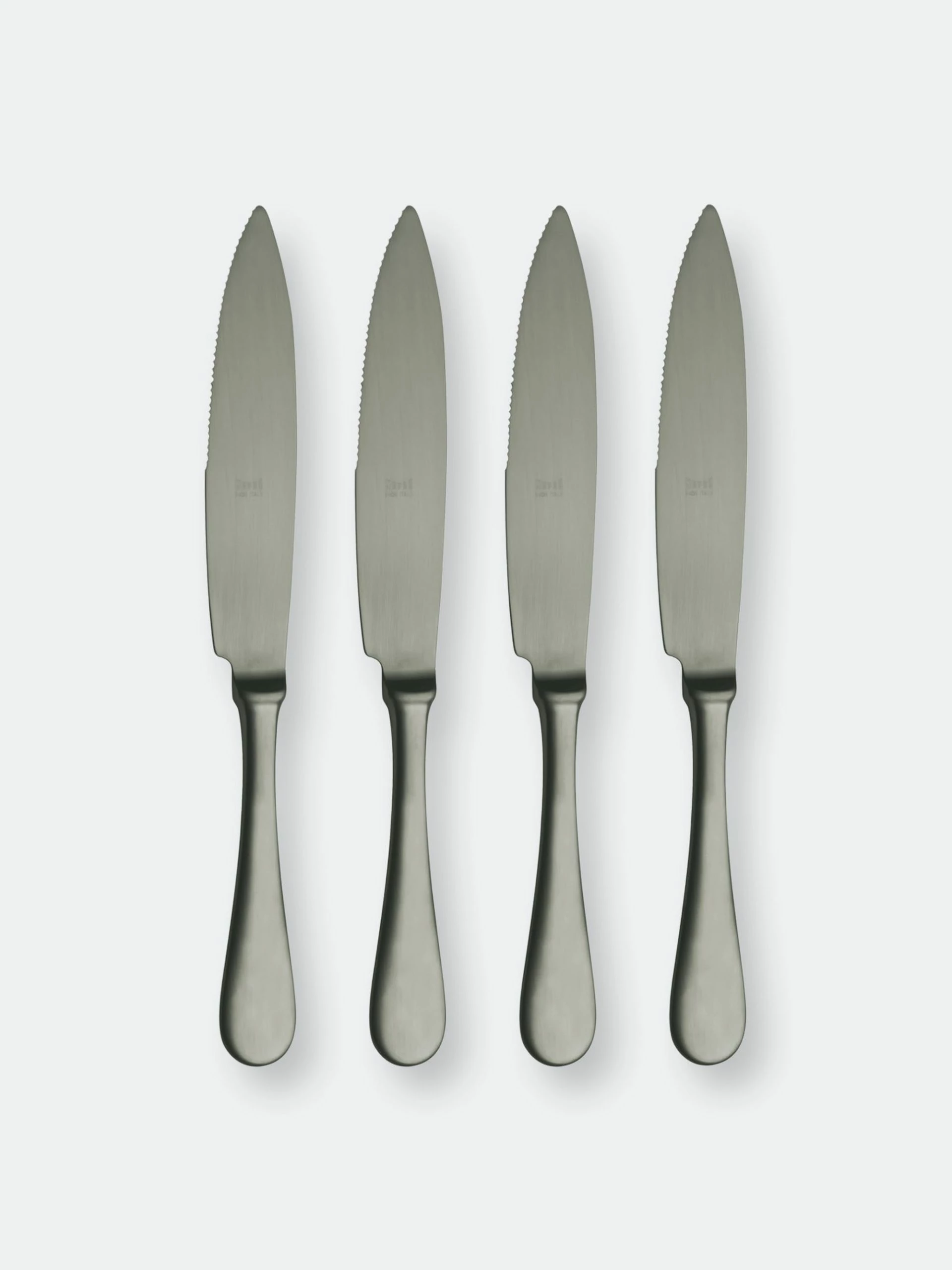 These durable steak knives are made 100% with stainless steel, there is no wooden or plastic handle that can attract batterials or ruin over time. Double serration for a durable sharpness. Dishwasher safe. Stainless Steel is coated with PVD Titanium Coating. Tested and guaranteed for more than 1000 washes in commercial dishwasher. The special Titanium Plating Process, Originaly developed by NASA, gives to the surface of Stainless Steel an extra-hardness and makes it dishwasher safe. The finish is durable, inoxidable, dishwasher safe and food safe. The production process is not galvanic and do not produce pollution. Made in Italy