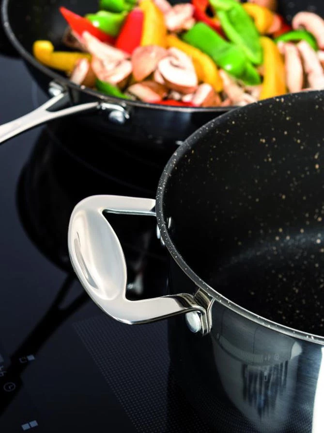 Using the most sophisticated technologies, we created a new pots and pans collection that respects the nature and our planet. The goal to reach the highest thermal performances in the shortest time without burning the food is the core of our project. With the GLAMOUR STONE cookware we can devote ourselves to our passion: our love for the healthy and easy cousine that saves time and energy without affecting the flavours and the nutritional properties of the foods we cook. 18/10 Stainless Steel Body and handle, Eterna Non-Stick triple layer coating, Resistant to metail utensils, Pollution Free, Aluminium Core for even heat distribution, Suitable for all cooking surfaces including induction, Easy to clean , Dishwasher safe, Oven Safe, PFOA-Free. The internal ETERNA® non-sticking coating guarantees the best performances. Strongly repels water and grease for the easiest cleaning ever. Lasts 3 times longer in the Accelerated Cooking Test. Has 10 times the Dry-Egg release of the nearest competitive coating. It gives longer nonstick life than anything we have ever tested.