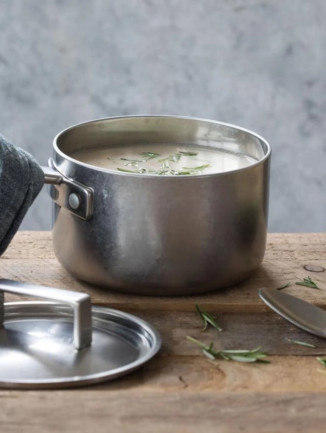 Rustic, Industrial design for this collection of high-performance pots and pans. The special Vintage Process gives to the surface of Stainless Steel a rustic, warm and elegant appearence; yet the product is inoxidable, dishwasher safe, durable and food safe. The production process is not galvanic and do not produce pollution.The high conductivity of pure aluminum merges with the practicality and hygiene of steel. Technology: Tri-ply, 18/10 Stainless Steel, aluminum core, Induction Steel outside, Mirror polished surfaces, outside and inside, Handles with strongly fixed 18/10 Stainless Steel rivets, Graduated measurement inside. Dishwasher proof. Results: The heat is distributed evenly over the surface of the pot; Greater control of cooking temperature; Considerable saving of energy and time; Minor alteration of vitamins and proteins during cooking.