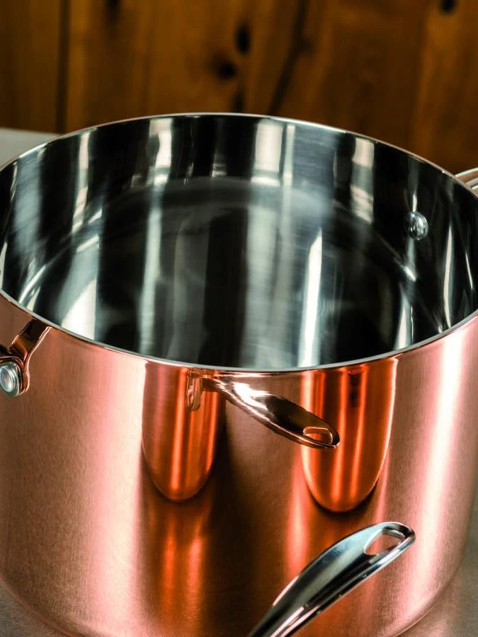Timeless elegant design for this collection of high-performance pots and pans. The high conductivity of copper and pure aluminum merges with the practicality and hygiene of stainless steel in contact with food. Technology: Tri-ply, 18/10 Stainless Steel, aluminum core, copper, Mirror polished surfaces, outside and inside, Handles with strongly fixed 18/10 Stainless Steel rivets, Graduated measurement inside. Results: The heat is distributed evenly over the surface of the pot; Greater control of cooking temperature; Considerable saving of energy and time; Minor alteration of vitamins and proteins during cooking.