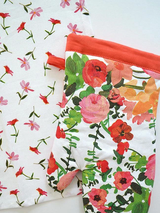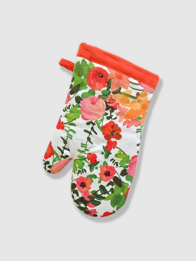 100% cotton oven mitt with interior terry cloth lining.