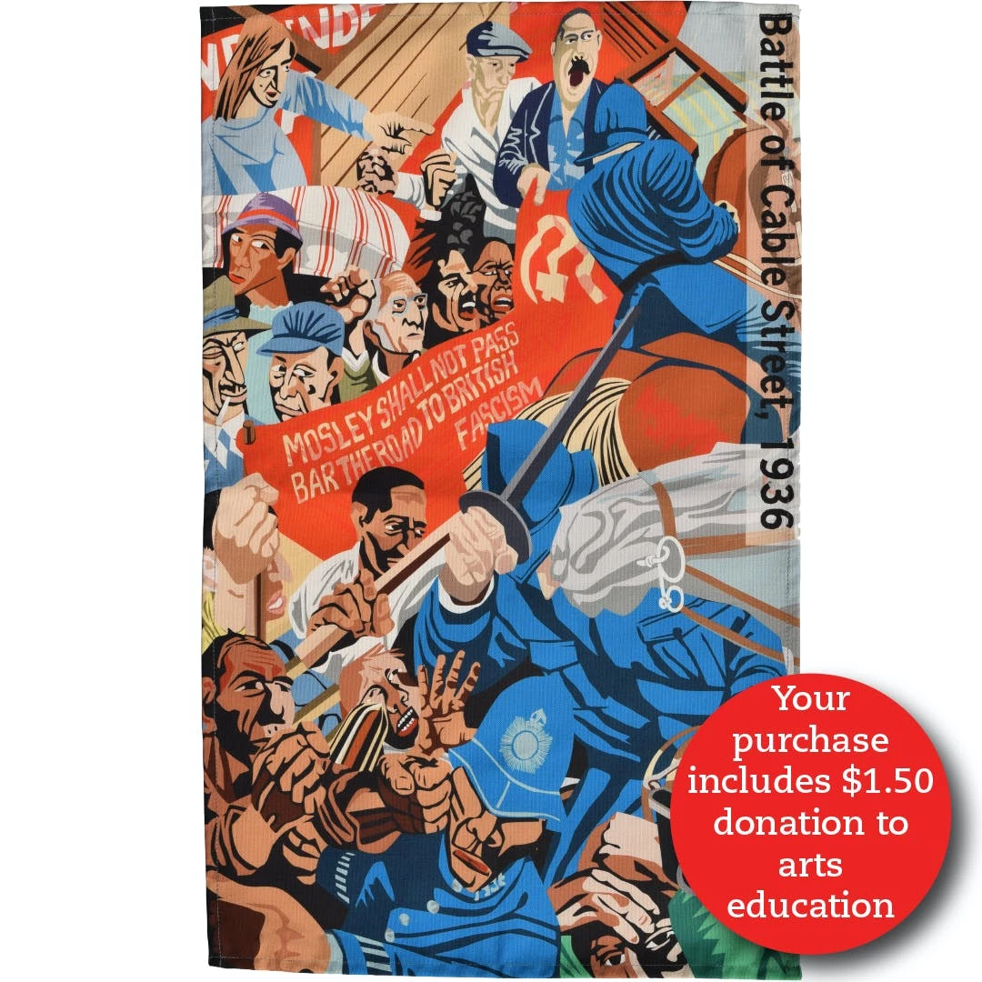 The year was 1936. Fascist leader Oswald Mosley wanted to march his Blackshirt thugs through the heart of East London, then home to a large number of Jewish residents. Despite a petition signed by 100,000 people, who saw the march as a deliberate provocation, the Home Secretary refused to ban it, deploying 7,000 members of the police force to accompany it and protect the marchers. But the people weren’t having it. On the day of the march, 20,000 anti-fascists took to the streets, determined to prevent the march. They barred the way with road blocks – including a bus and a tram – wielding makeshift weapons: sticks, rocks, chair legs, rotten vegetables. Children rolled marbles under the hooves of the police horses. Echoing the Spanish Republicans in the civil war against Franco’s fascists that had begun earlier that summer, the protesters chanted the slogan ‘They shall not pass!’ And they didn’t: Mosley eventually turned his fascists away, but the day ended with some 150 counter-protesters arrested and 175 injured. Fast-forward to today. Reports of hate crime have increased, the far-right is rising across Europe, and a white supremacist rallies have taken place in Europe and the US. The people fight back again. 80 years later, the forces behind the Battle of Cable Street must be remembered. Let this tea towel serve as a reminder of the power of ordinary people against racism and hatred. The design on this product is an adaptation inspired by the original 1976-1987 Cable Street Mural, itself designed and produced by artists Dave Binnington, Paul Butler, Ray Walker and Desmond Rochford. The work is not an accurate representation of the original mural, as it has been moved and adapted by a third party artist to fit the product format. Artist Paul Butler is aware of this third party work and we have arranged for $1.50 from the sale of each item inspired by the mural to go towards Community Interest Company Brooks Arts. Funds raised in this way will be used for supporting arts education events hosted by Paul Butler.
