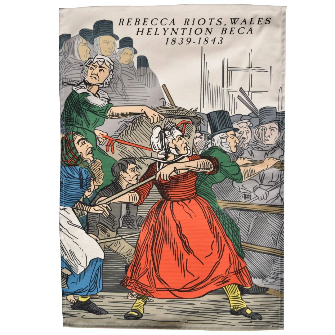 Axe-wielding Welshmen dressed as women: no, this is not just a normal night out in Swansea. The early 19th century was a tough time for farming communities in the south west of Wales. Of an evening, farm labourers would disguise themselves as women and attack the toll-gates which were springing up throughout the countryside. Ostensibly, the toll-gates financed the maintenance of roads, but frequently the money was diverted to other purposes and usually the rates extracted were extortionately high. The Bible-reading Welsh took their cue from words in Genesis: „And they blessed Rebekah, and said unto her, Thou art our sister, be thou the mother of thousands of millions, and let thy seed possess the gate of those which hate them“. The riots took place over the period 1839-1843 and led to some reduction in rents and toll-gate charges. They also left their mark on the Welsh psyche and are considered to have inspired other uprisings since. This tea towel would be ideal wielded by a man dressed as a woman; or by a woman dressed as a man; or any combination you like, just as long as you keep fighting for the rights of the working classes!
