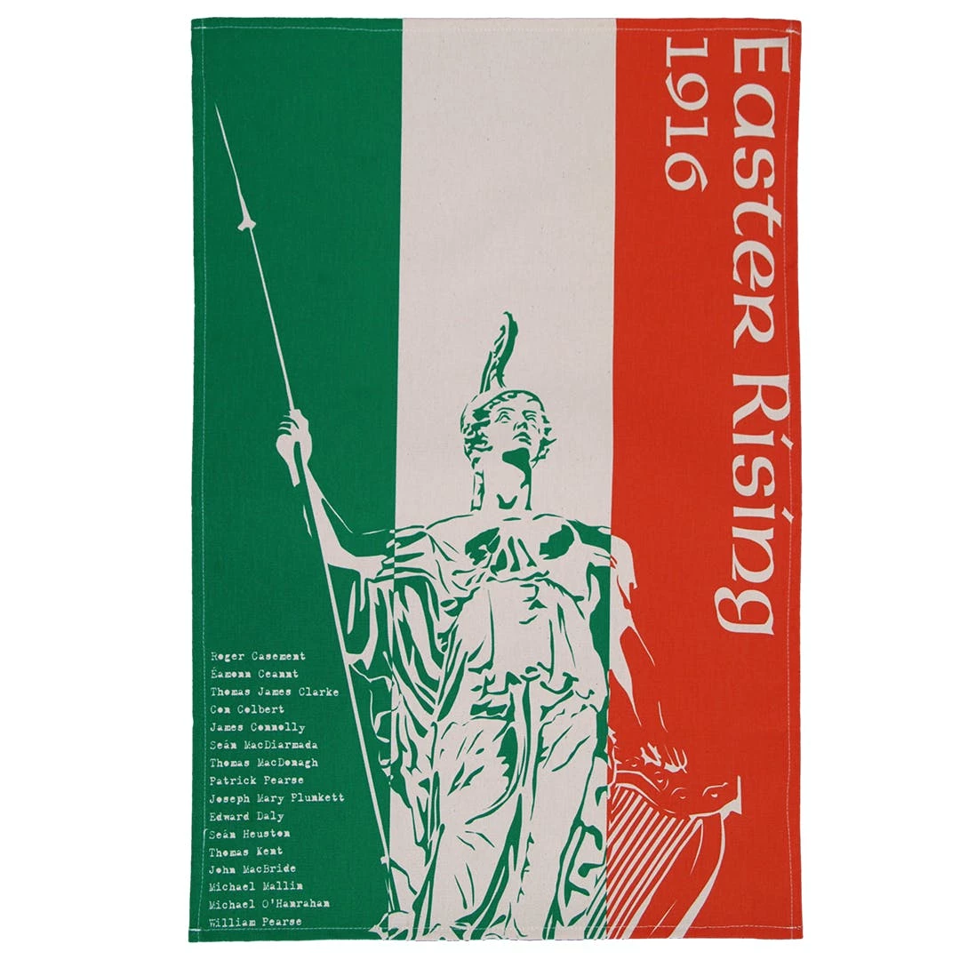 In 1800, Ireland lost its parliament in Dublin and began to be governed directly from Westminster. In 1916, the United Kingdom faced its greatest internal threat in 100 years: The Easter Rising. Also known as the Easter Rebellion, this was an armed insurrection in Ireland during Easter Week, April 1916 where 1,500 armed Irish nationalist rebels seized control of Dublin and held the centre for six days. The leaders wanted to end British rule in Ireland and establish an independent Irish Republic, guaranteeing ‘religious and civil liberty equal rights and equal opportunities to all citizens.’ The rebels had the advantage of surprise, but this did not last: the authorities quickly regained their composure and the rebellion was mercilessly suppressed. The city centre was left in ruins. Then, the authorities began executing the rising’s leaders after closed court martials. This tea towel features the names of those executed, as well as the statue of Ireland atop the General Post Office which had been the rebellion headquarters. Although the rising was crushed, the spirit was not. The rising exposed the oppressive nature of British rule and it transformed public opinion – within a year and a half republicanism had become the most important movement in Ireland. How fitting: The Easter Rising, a key moment for a resurrection.