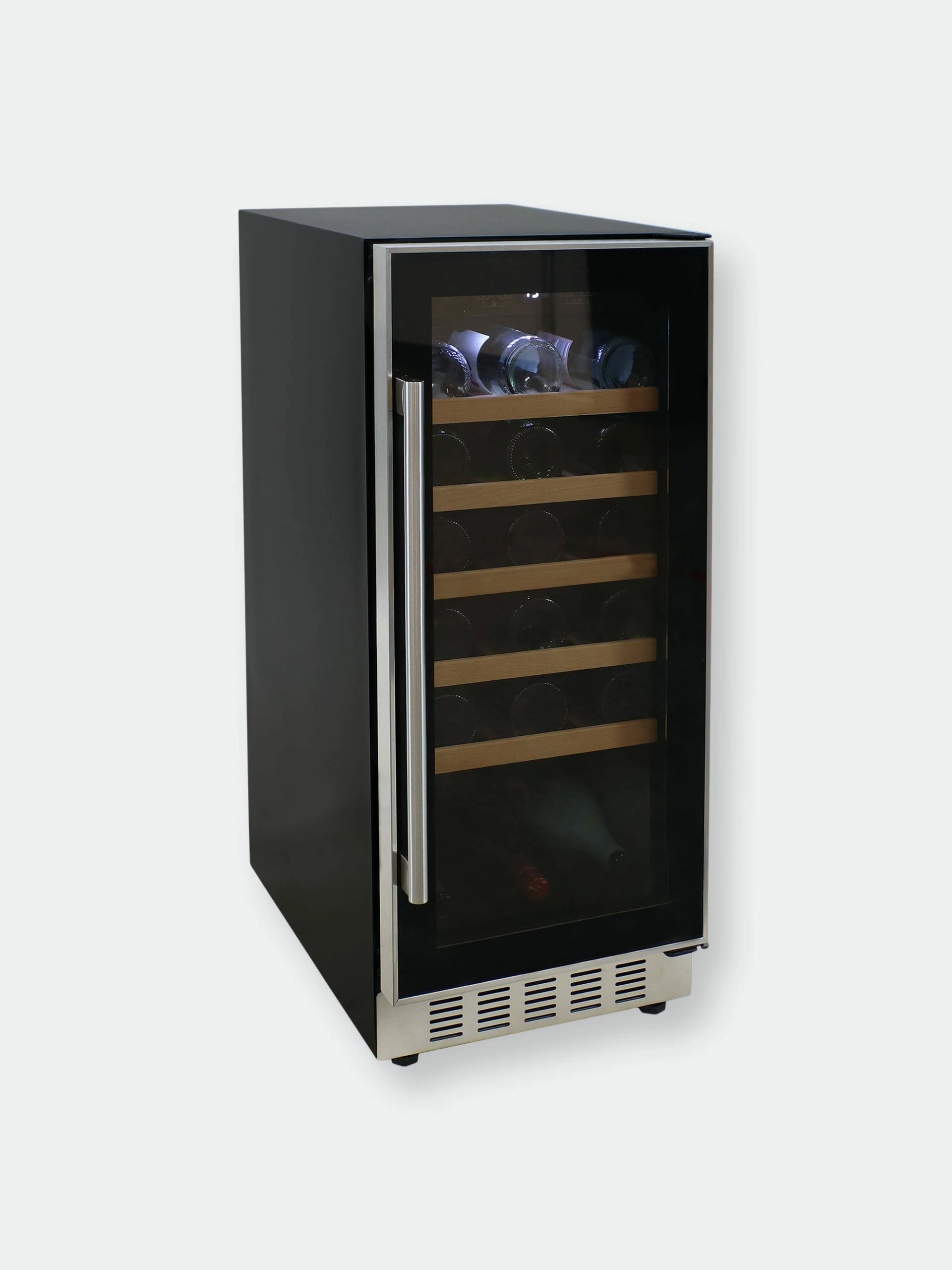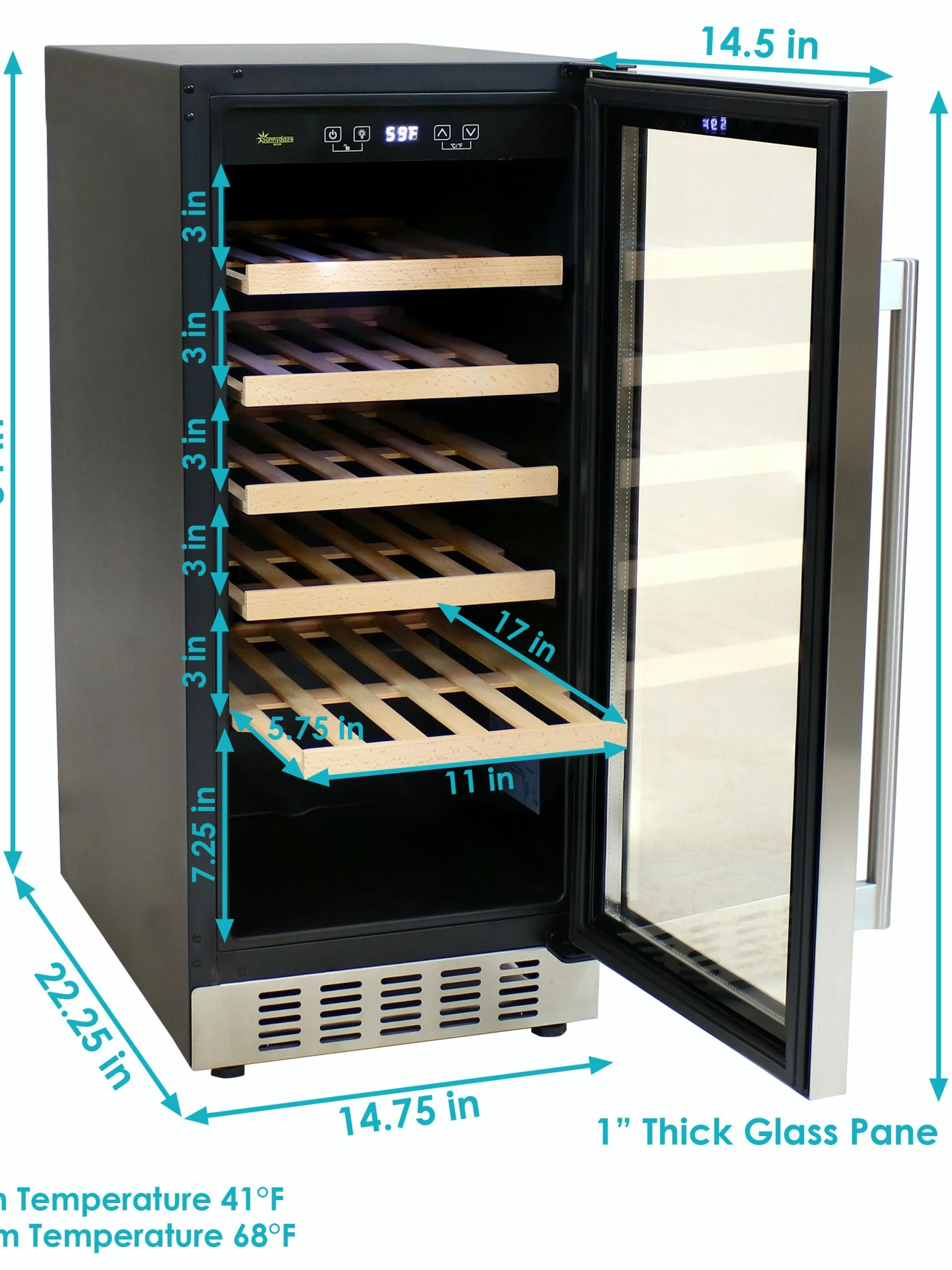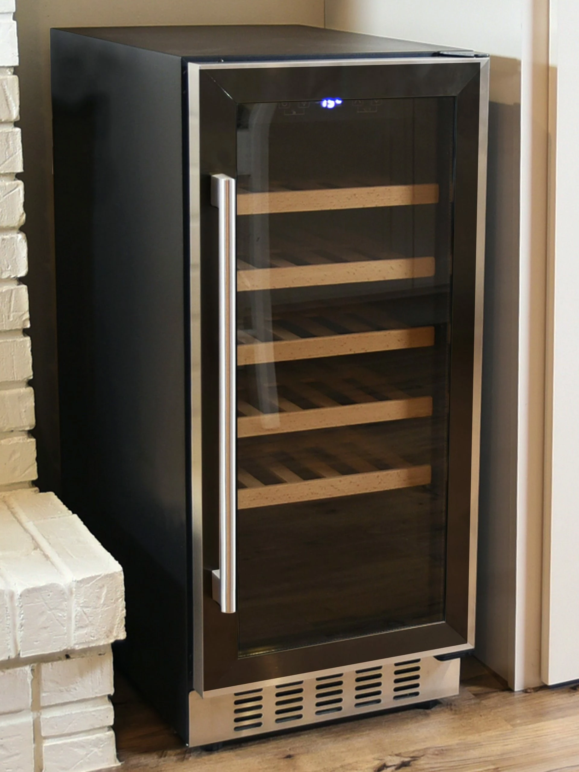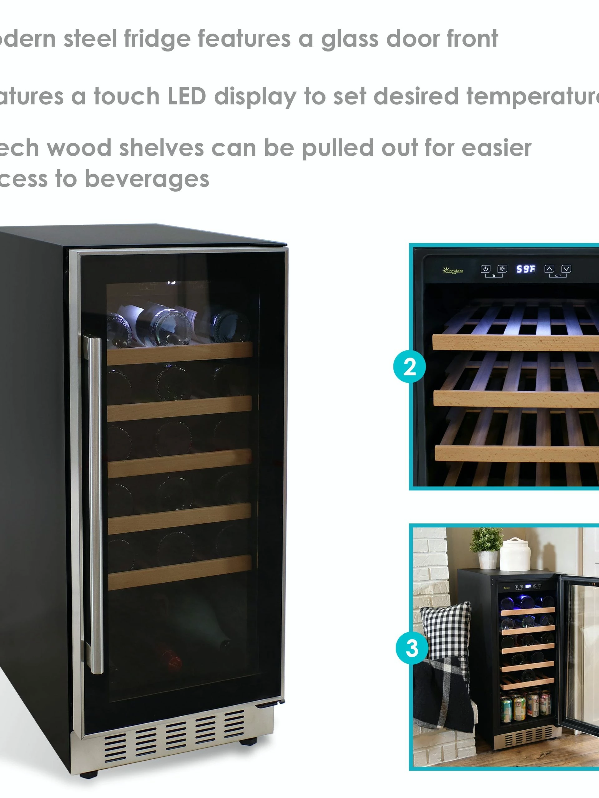 This slim wine and beverage fridge is designed to fit in small spaces and chill your wine to perfection. The beverage refrigerator features a modern design and is built to last from a steel construction, glass door, and modern handle. The fridge can accommodate up to 33 bottles of wine and can also hold bottles or cans of soda, water, or beer. Use the stainless steel handle to open the layered glass door and slide the beech wood shelves out one by one to select your drink of choice. Grill ventilation is located on the bottom front of the fridge and a touchpad controller with LED display helps complete the modern style. The touchpad can be used to adjust the temperature to the desired level to enjoy optimally chilled wine and other drinks. Built to last, this fridge also features compressor technology to keep the noise from the fridge to a minimum. WARNING: This product can expose you to chemicals including Di(2-ethylhexyl)phthalate (DEHP), which is known to the state of California to cause cancer and birth defects or other reproductive harm. For more information go to www.P65Warnings.ca.gov.