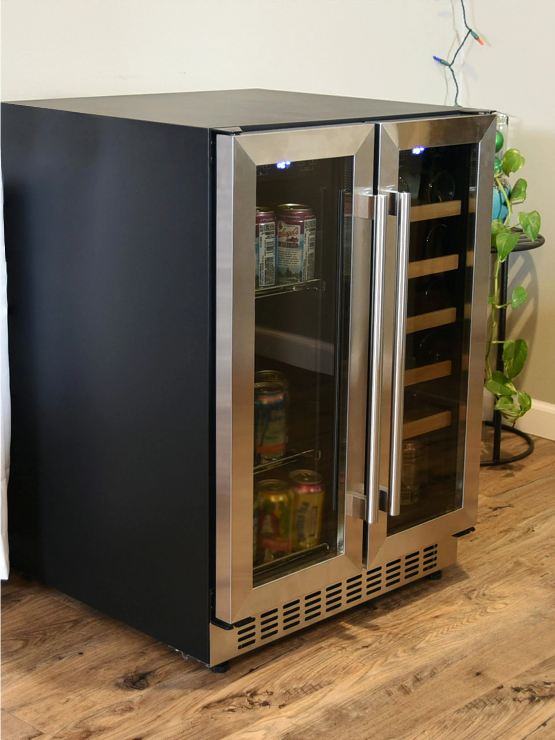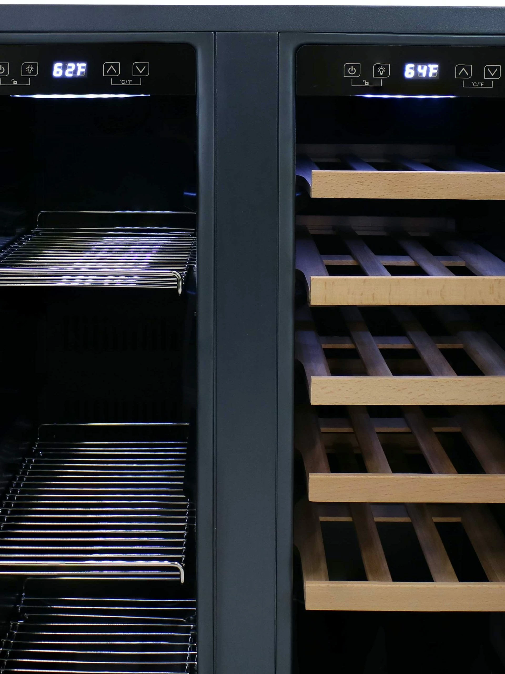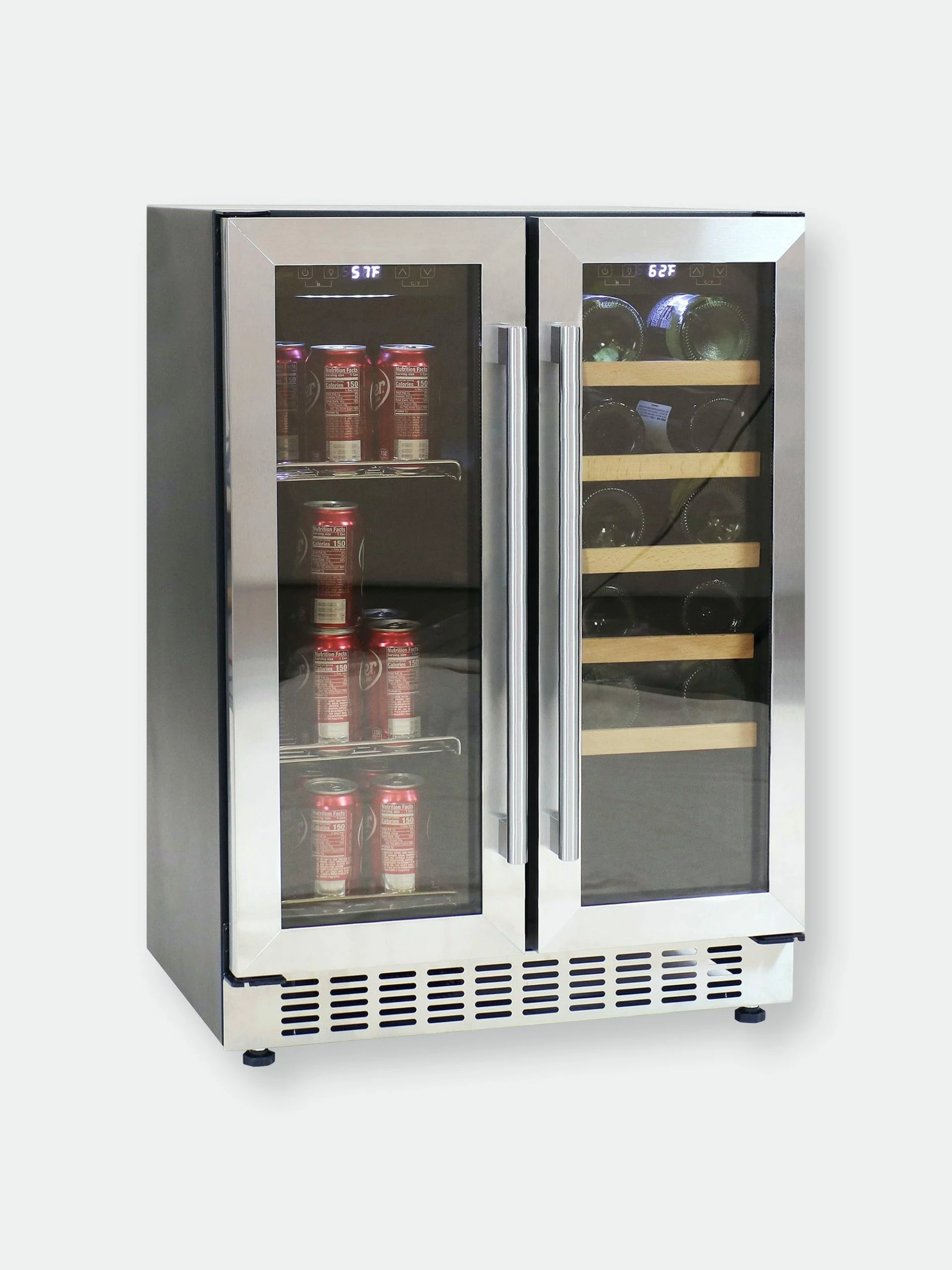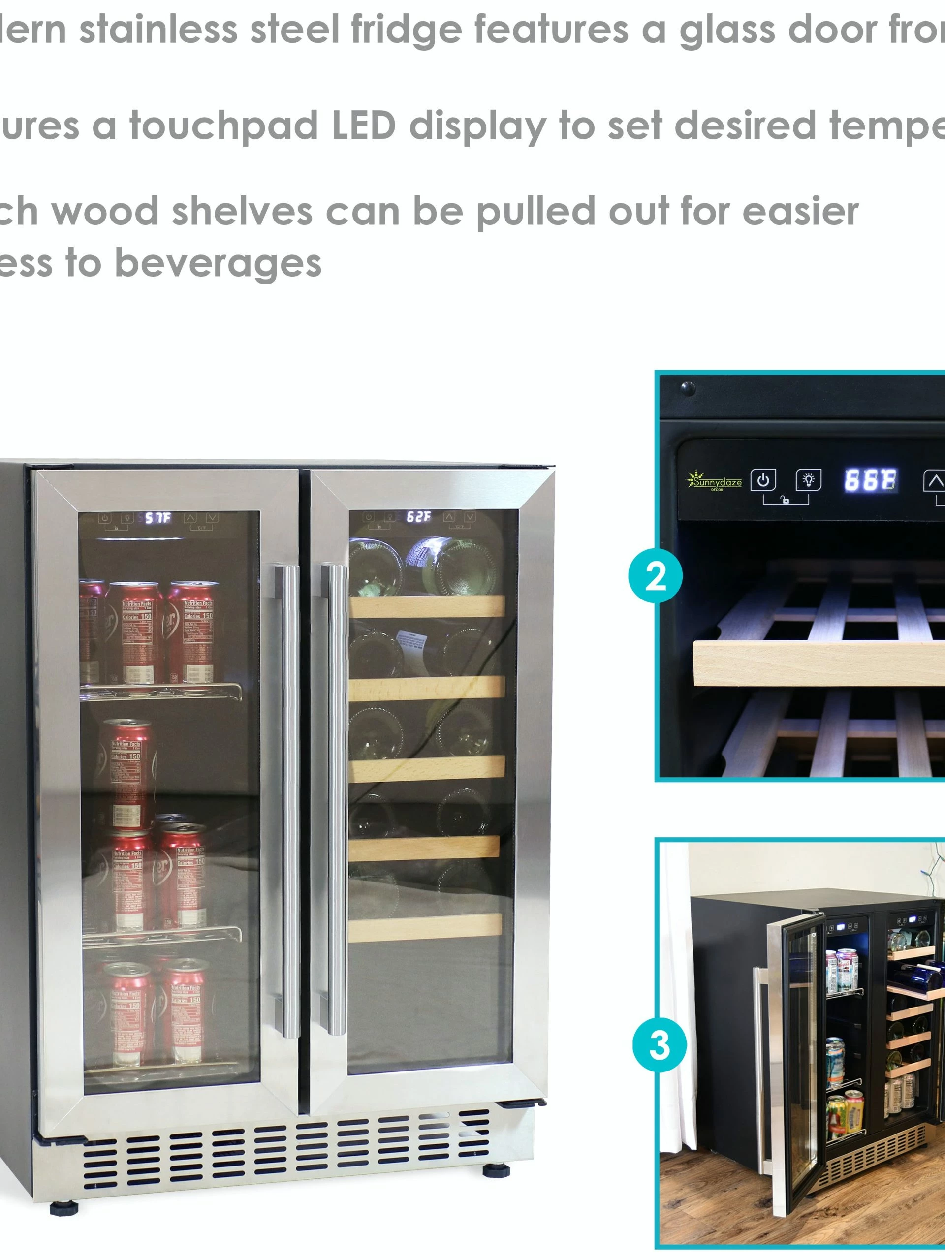 Chill wine and more with this dual zone beverage cooler! This wine fridge accommodates 20 (750-ml)) bottles of wine and 63 standard 12 oz cans. It features a stainless steel door frame, stainless steel handles, pull-out beech wood shelves for wine bottles, chrome wire shelves for cans, and layered glass door window panes to display your wine and drinks in style. The wine fridge also features a touchpad controller with led display to easily set the thermostat to the desired temperature. Each side is independent so they can each operate at different temperatures. The left side chills beverages on a setting of your choice ranging from 32-50 degrees fahrenheit. The right side chills wine to a temperature of your choice ranging from 41 to 68 degrees fahrenheit.
