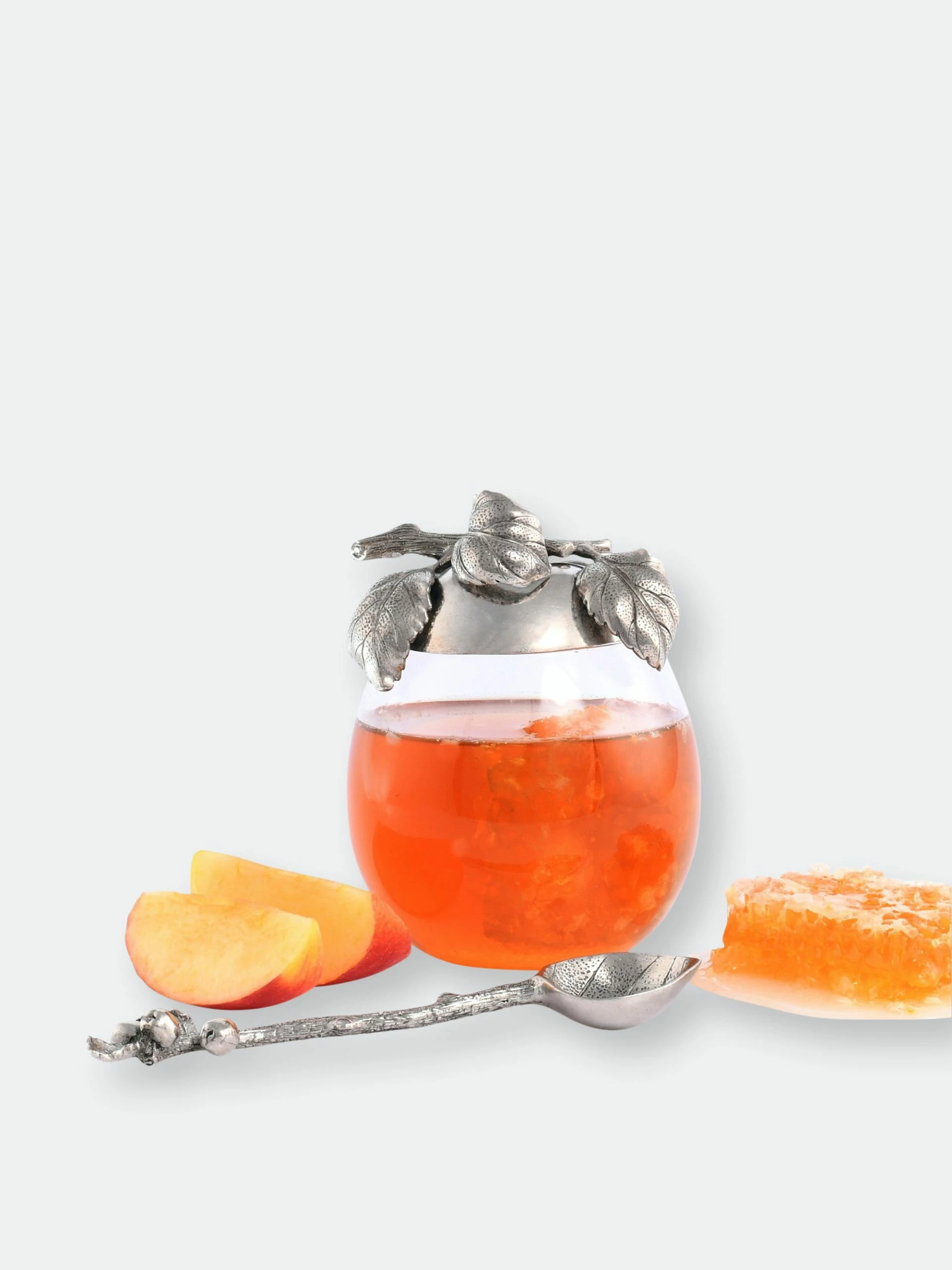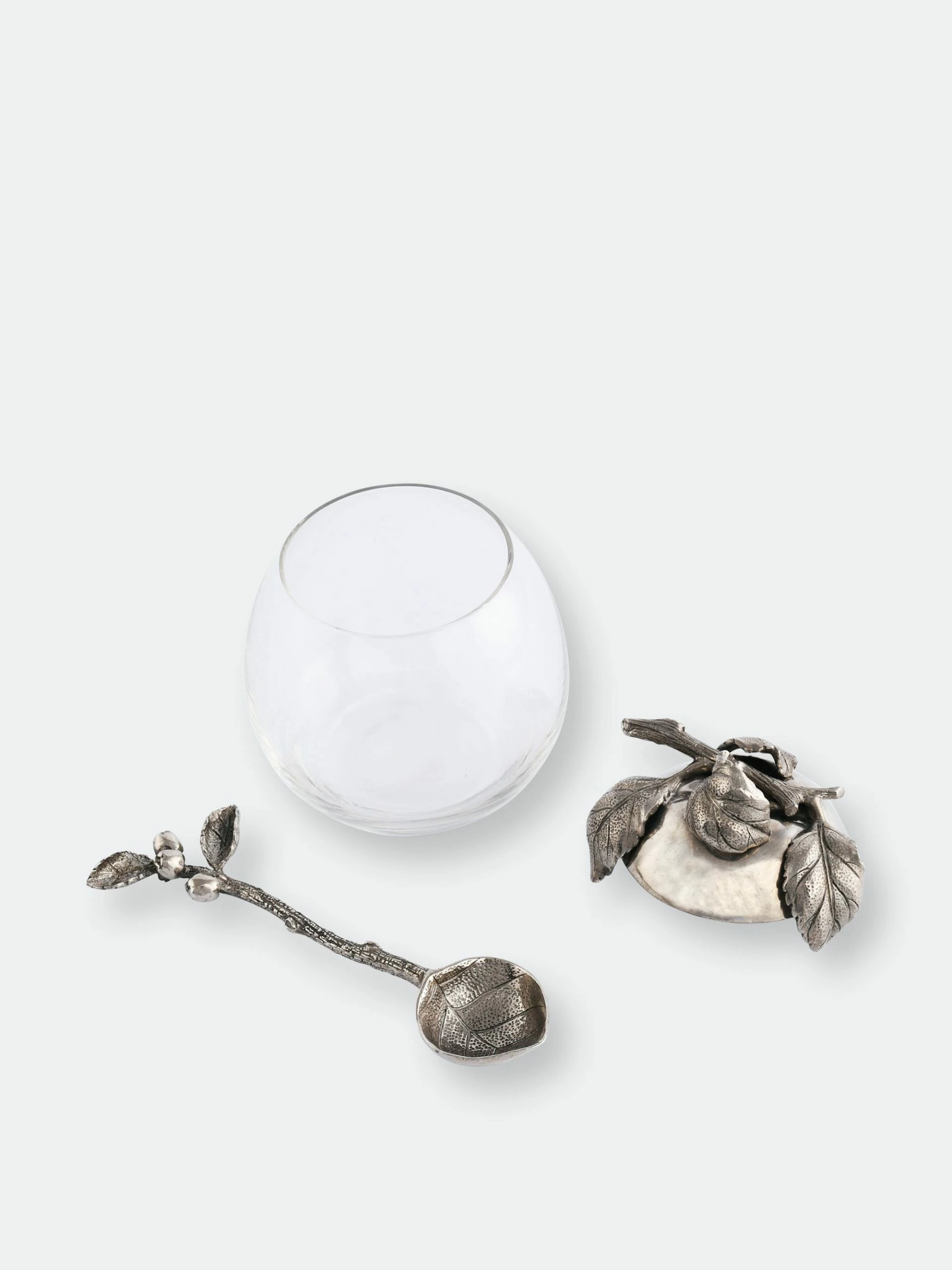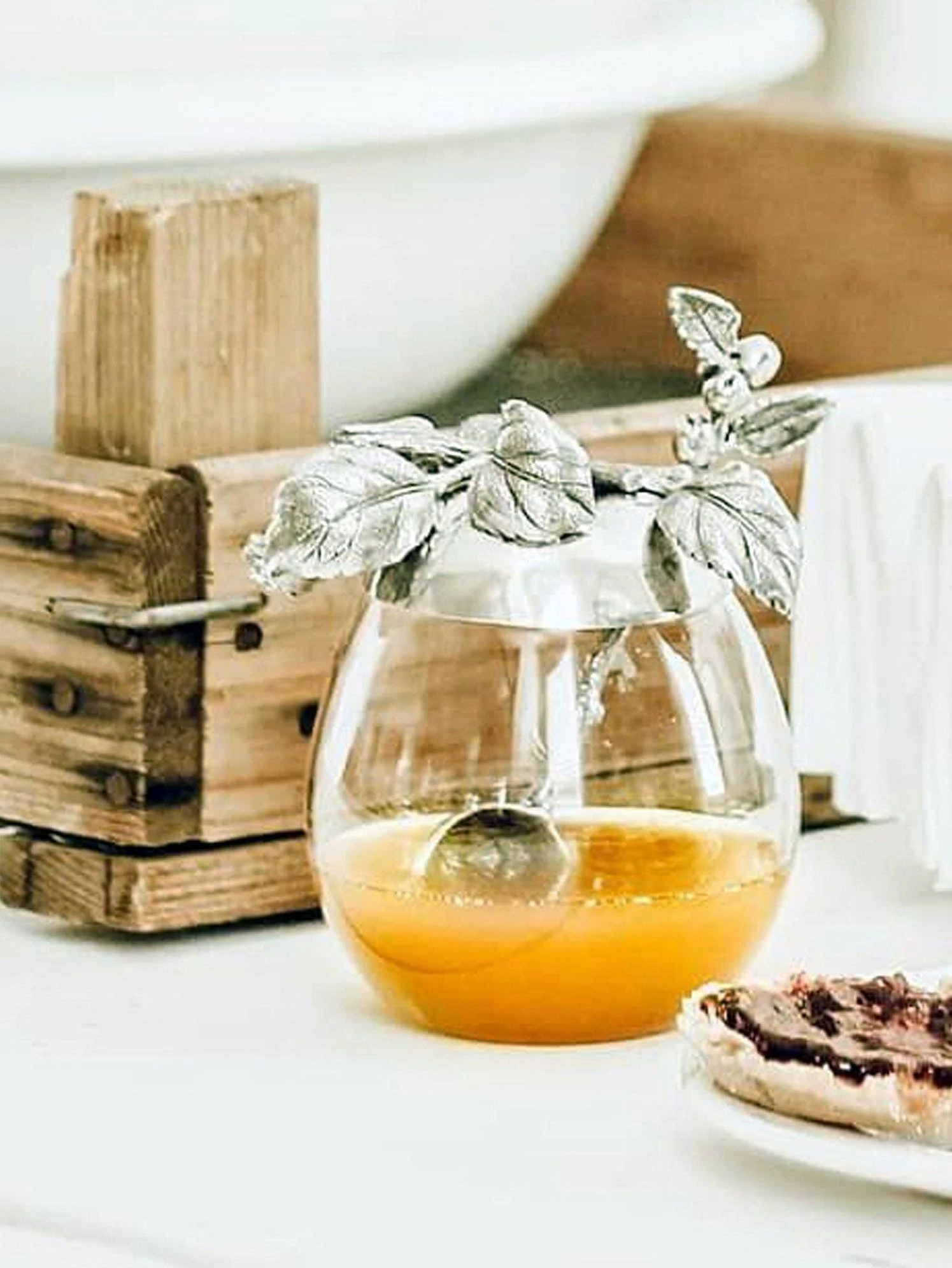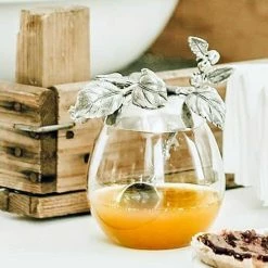 Perfect for picnics and outdoor dining, this Apple Honey Pot from Vagabond House creates a beautiful accent in any setting. A clear, glass bowl serves as the base, while the piece’s pure-pewter cap features a branch adorned with veiny leaves. Another pewter limb forms the spoon’s handle as small, realistically crafted apples accompany more foliage at the end of the grip. A leaf opens into a wide bowl at the head of the spoon, which comes included with the honey pot.