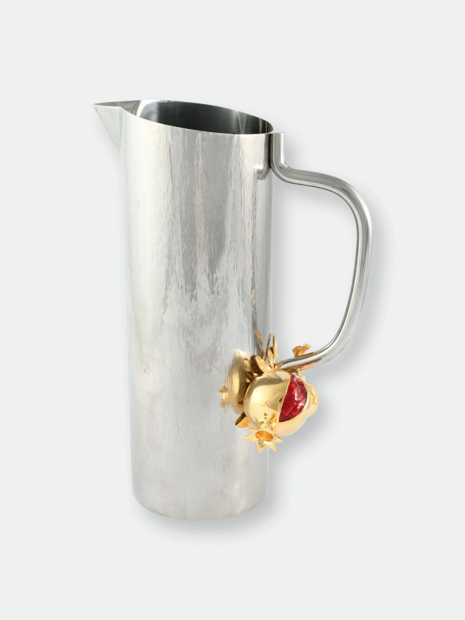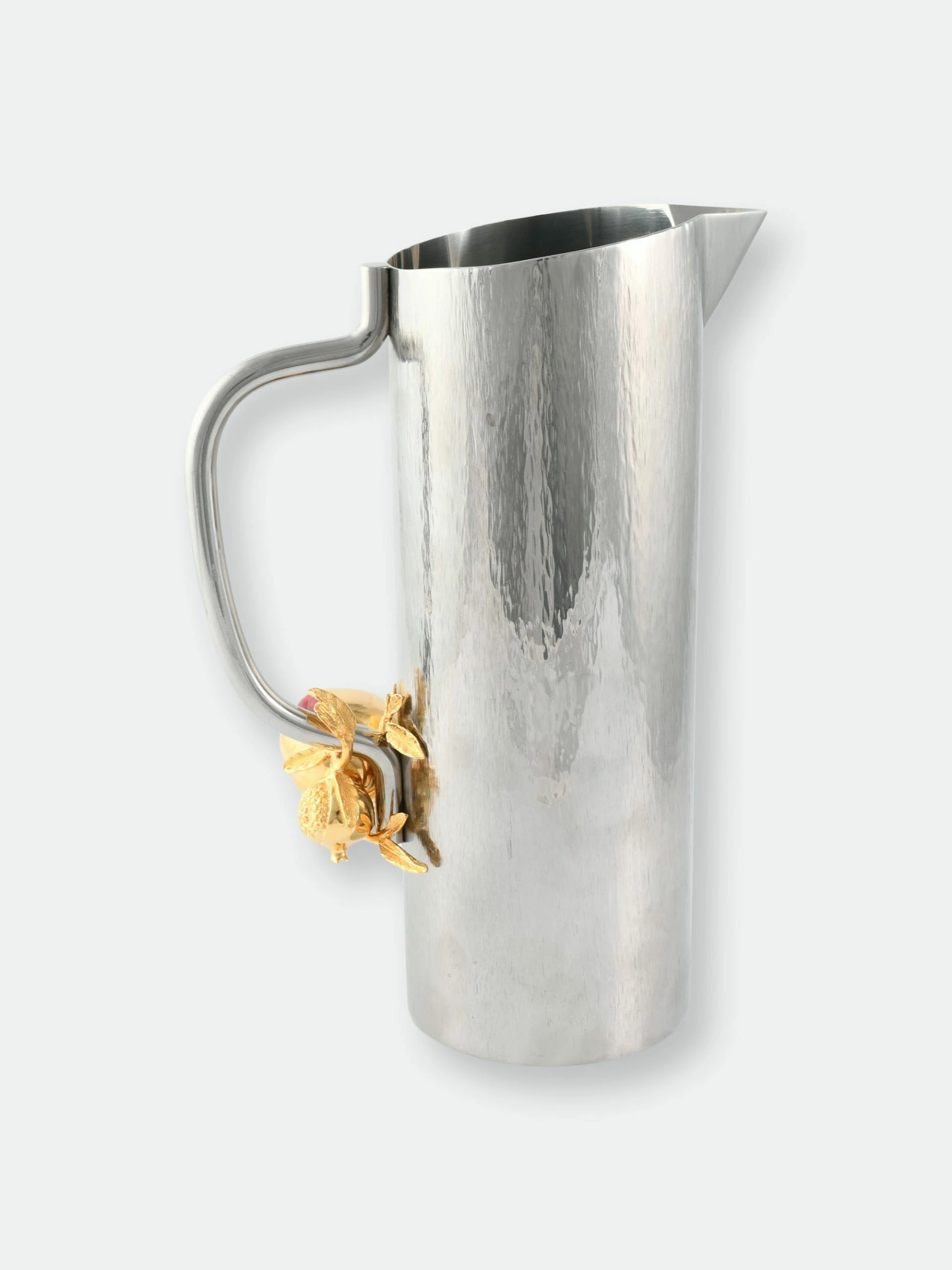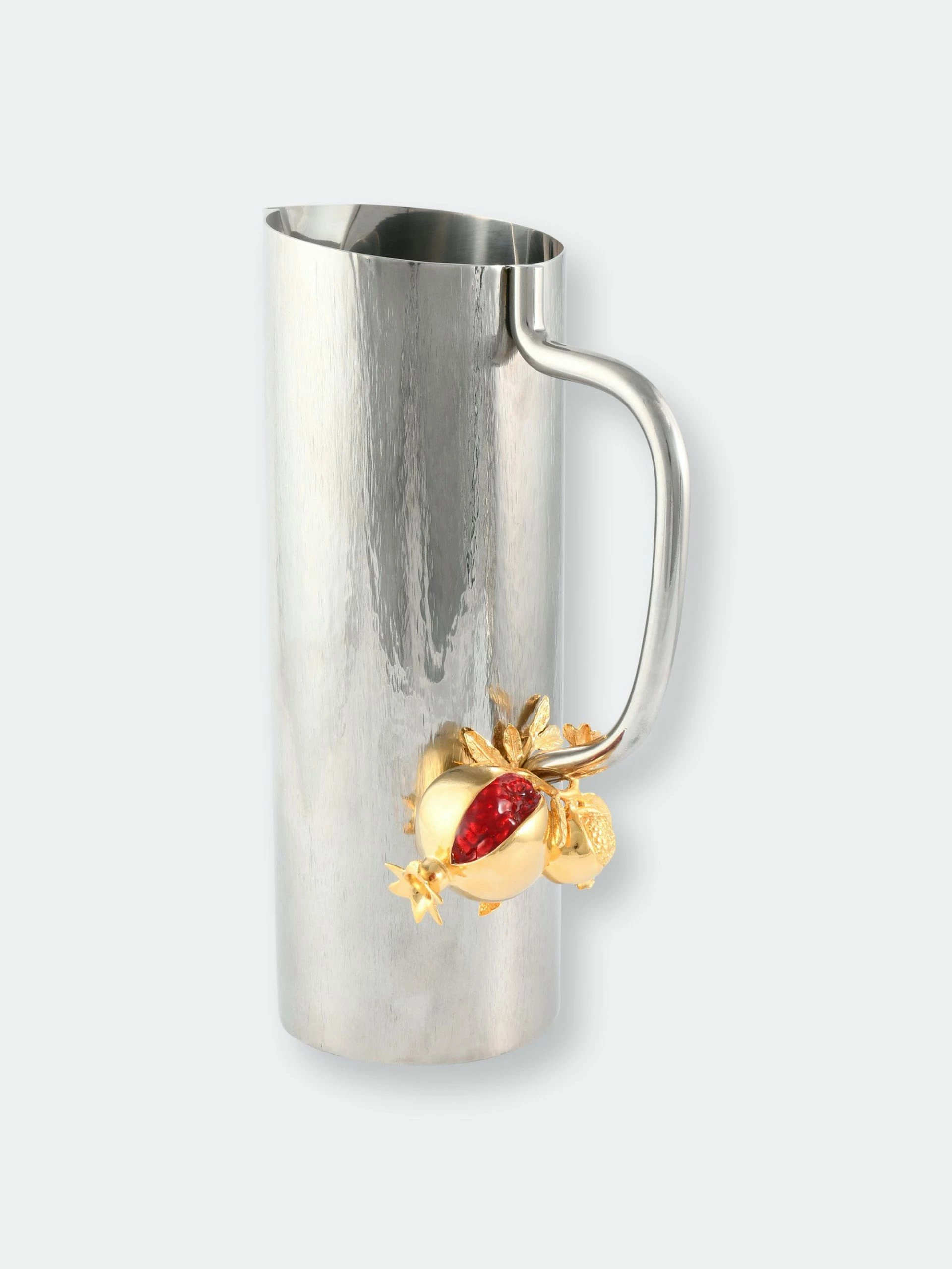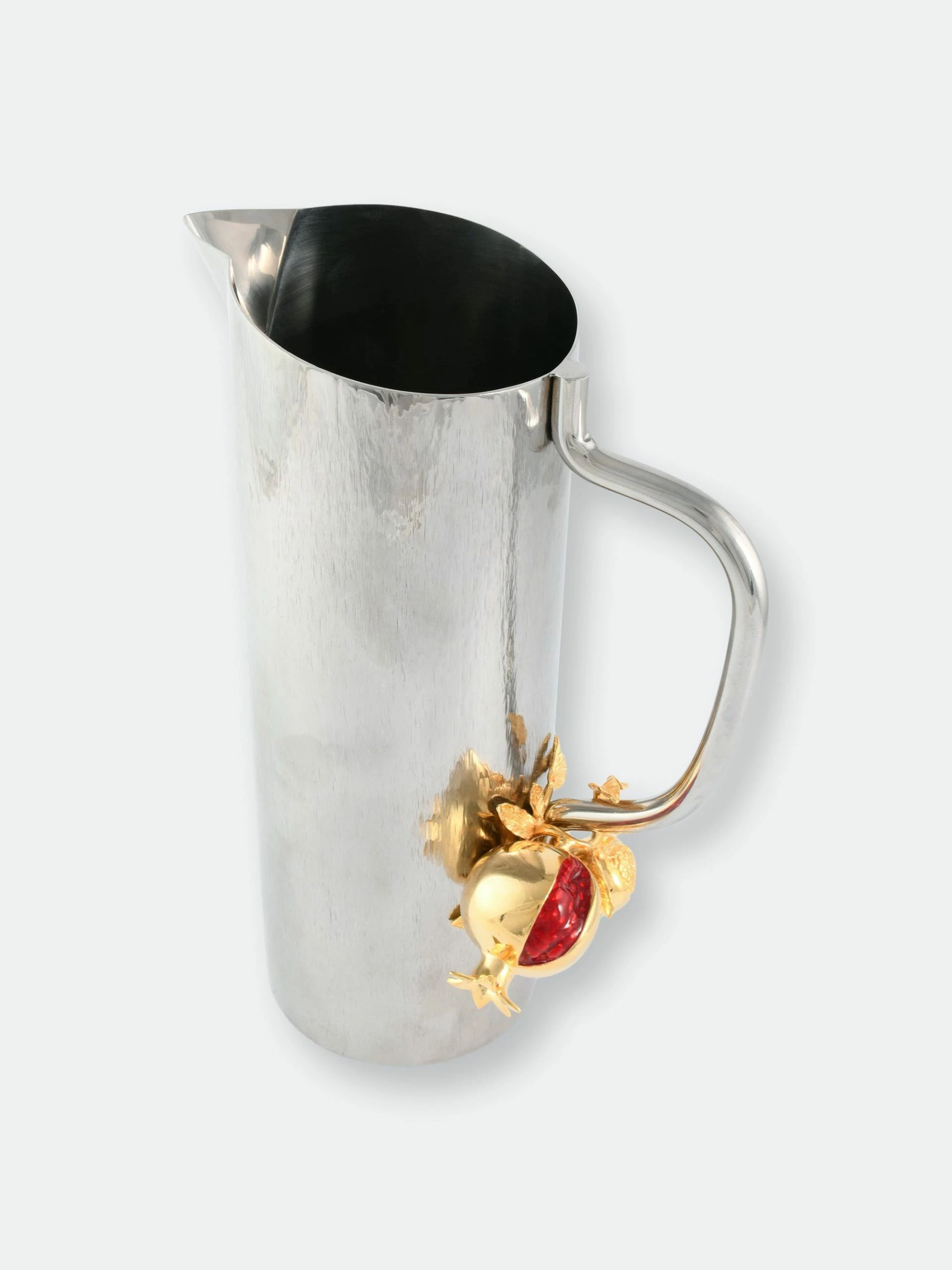 Serve summer drinks in attention-grabbing style with this gold pomegranate stainless steel pitcher. The tall build and textured surface lend sleek sophistication to this pitcher, while the sizable handle ensures excellent control while you pour.Rely on this gold pomegranate stainless steel pitcher to stand out poolside and on patio tables thanks to the unique design. The golden pomegranate sits at the base of the handle, providing a bold pop of red color to warm weather festivities.