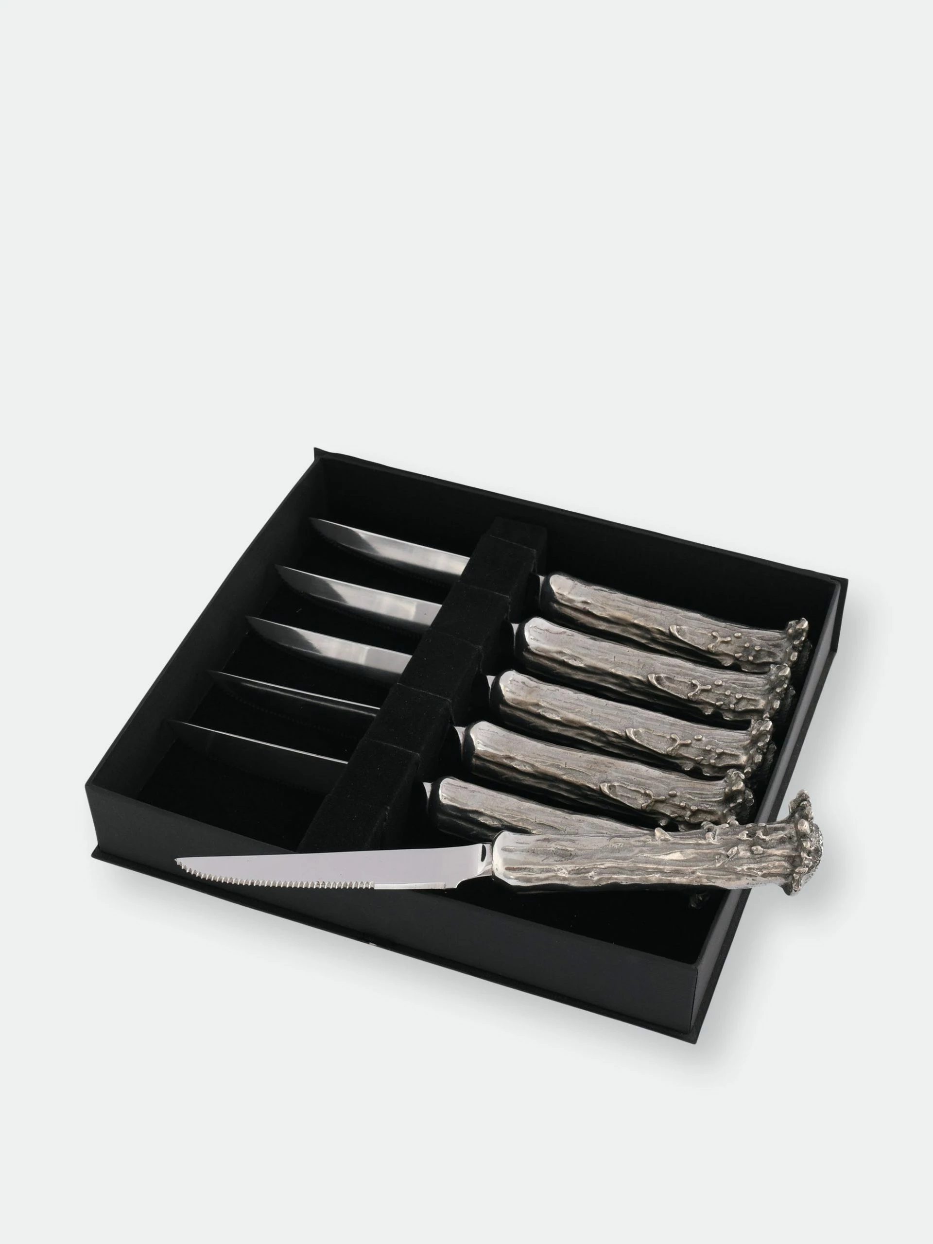 Discover the rustic elegance of antler crafted in pewter with Vagabond House’s intriguing set of six steak knives. Intricate patterns from casts made of real antler enhance the unique, pure pewter handles while forged stainless-steel blades finish these ultra utensils.This set includes six knives.